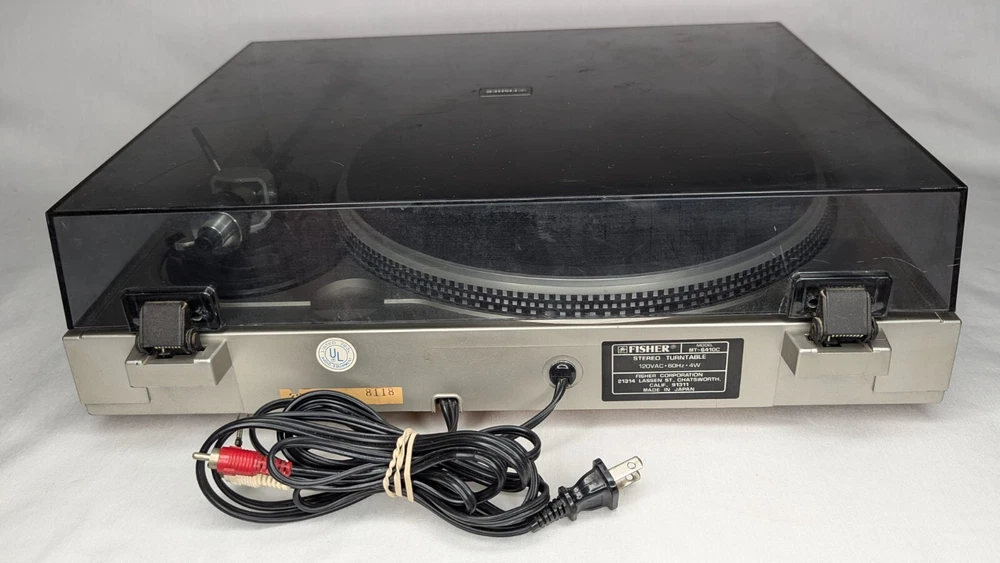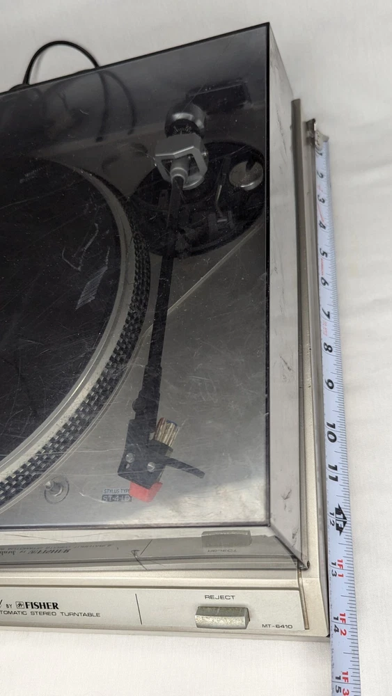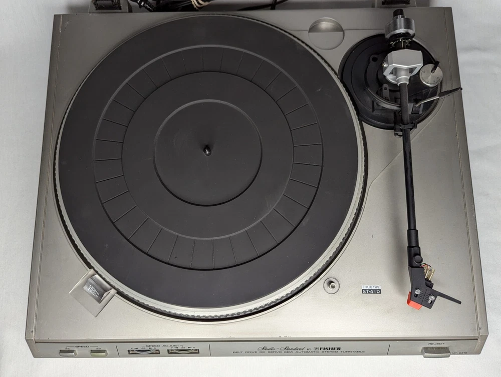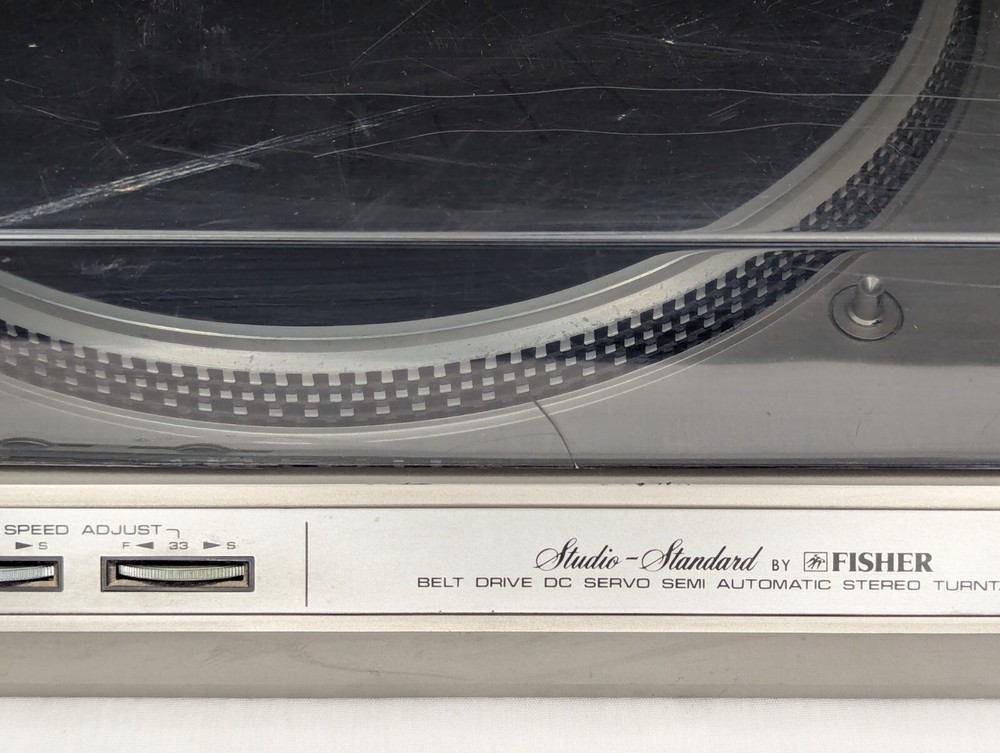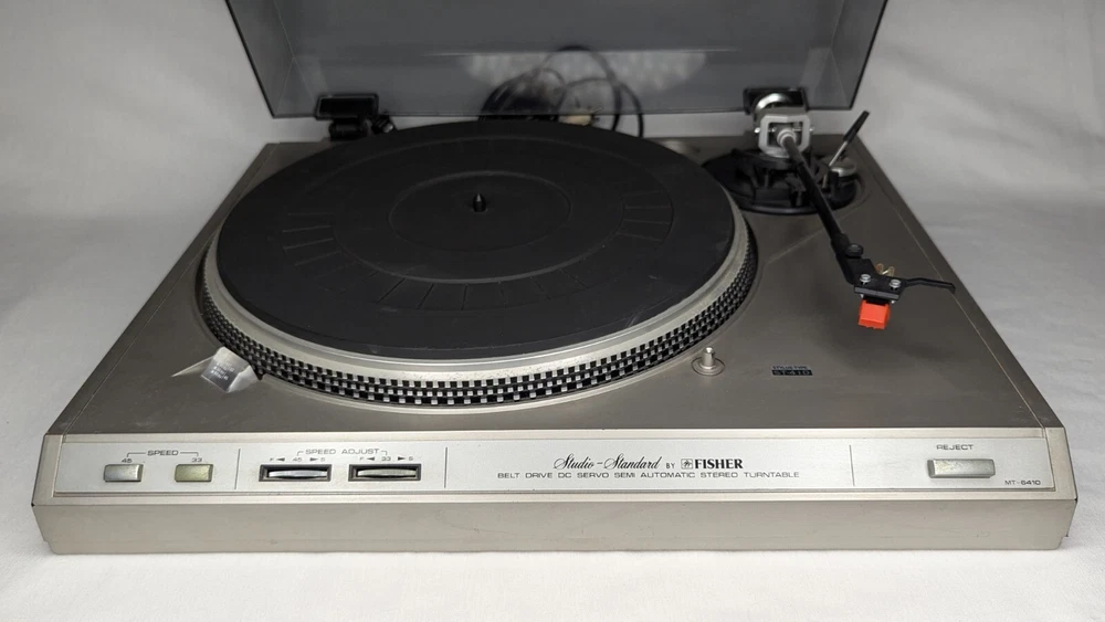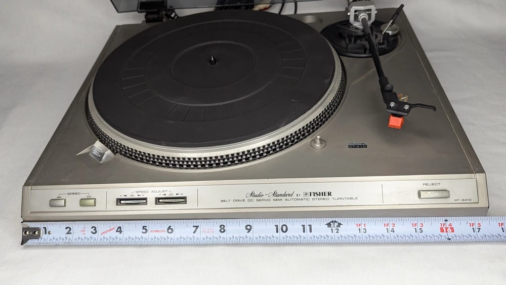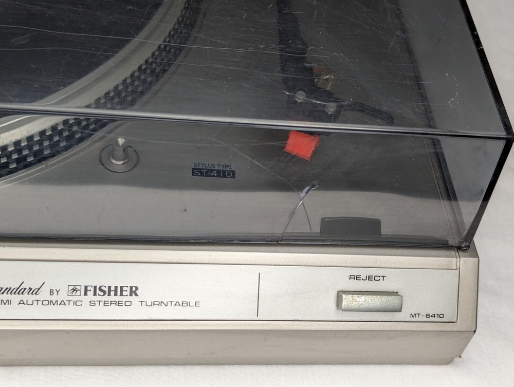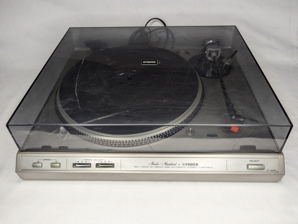 Fisher MT-6410C Belt Drive Turntable for Parts or Repair - No Belt - Untested Has wear from use, scuffs, scratches, stains, dust and is missing the belt that turns the table, please review pictures for details. Motor engages and spins, no belt to test, sold as is.