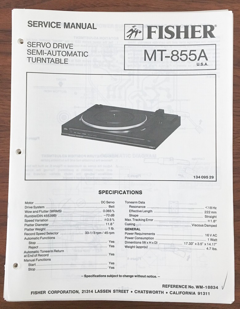 Fisher MT-855A Record Player Service Manual - Original MT-855A Turntable Guide