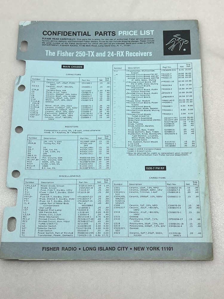 Up for sale 1 Used Original Service Manual for a Fisher Model 250-T Solid State FM AM Stereo Receiver, also covers model 400-T. Also includes a Confidential Parts Price List. Free Shipping !!!