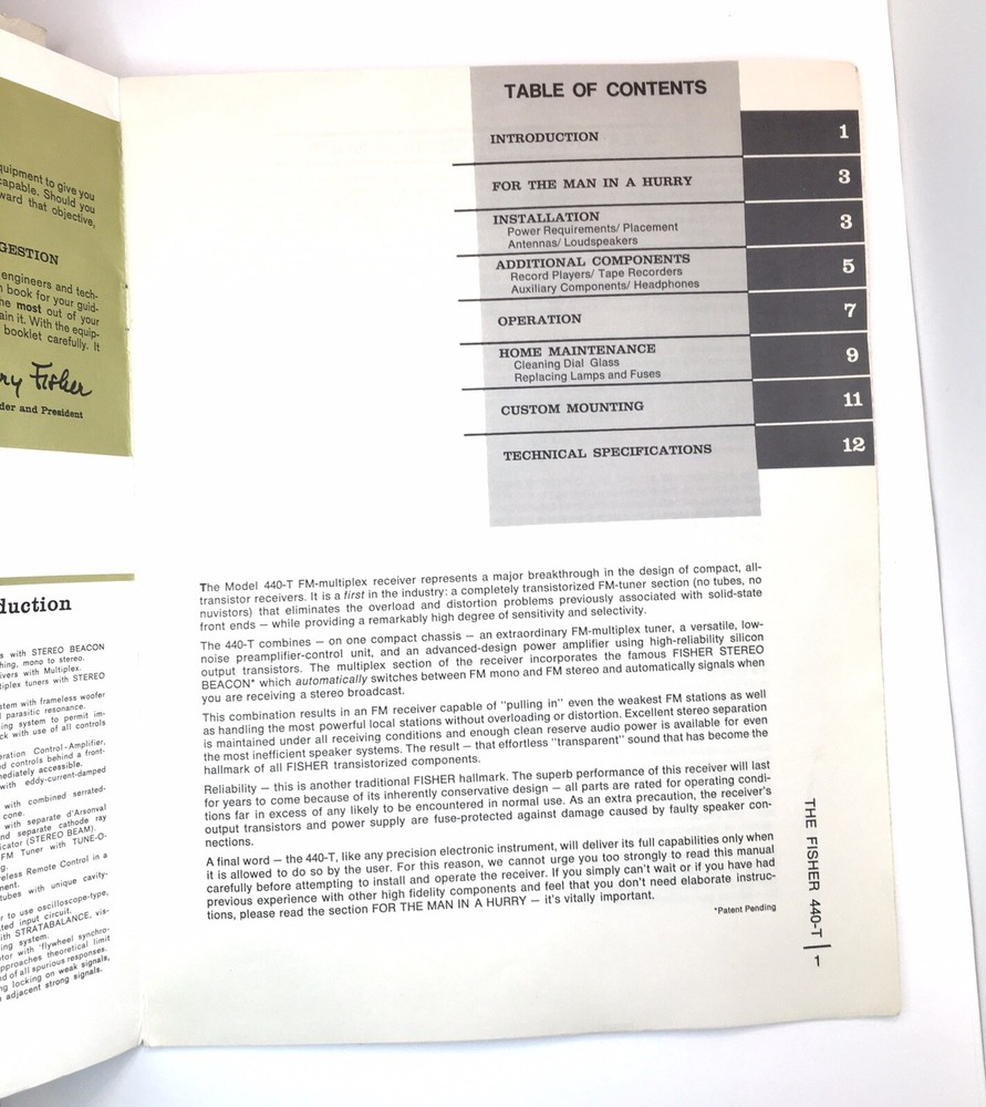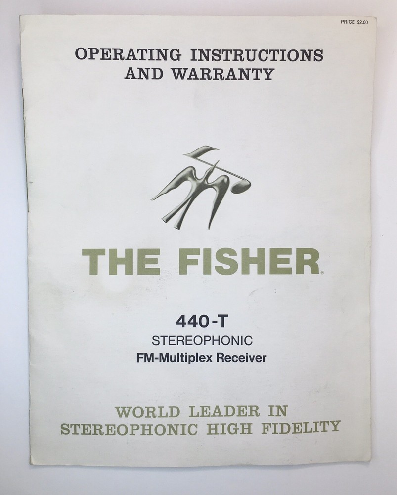 Fisher Model 440-T Stereophonic Receiver Owner / User Manual *Original* Pre-owned and used. Please note the warranty is from the 1960s so obviously it is not valid. It is just part of the manual. The manual does show visible wear. Especially but not limited to: discolorations, tanning, and wear to edges and corners. See photos for assessment. There was a piece of paper as seen in photo #2 that shows a revision to the instructions. That will also be included.
