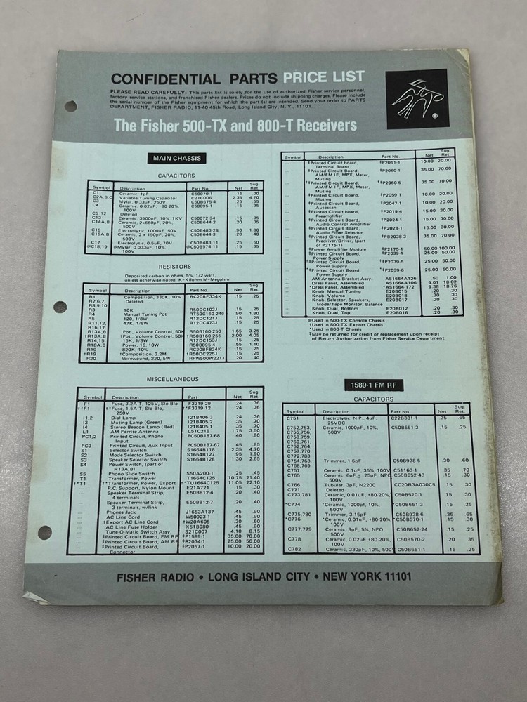 Up for sale 1 Used Original Service Manual for Fisher Model 500-TX Solid State FM-AM Stereo Receiver. Also includes a confidential Parts and Price List. Free Shipping !!!