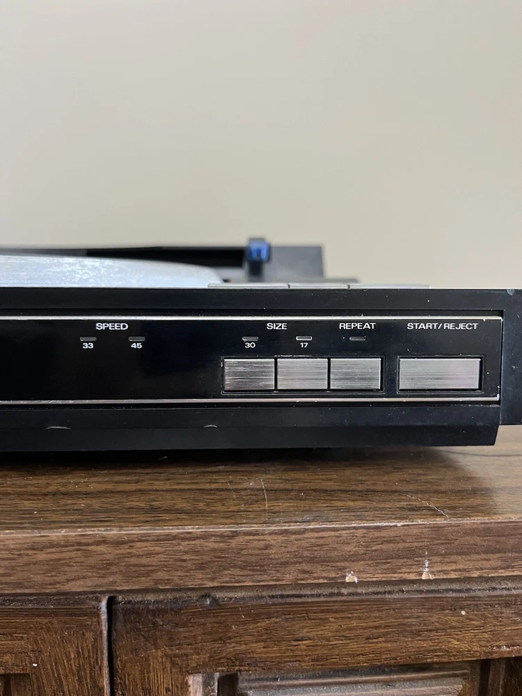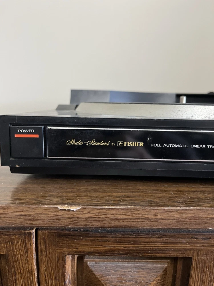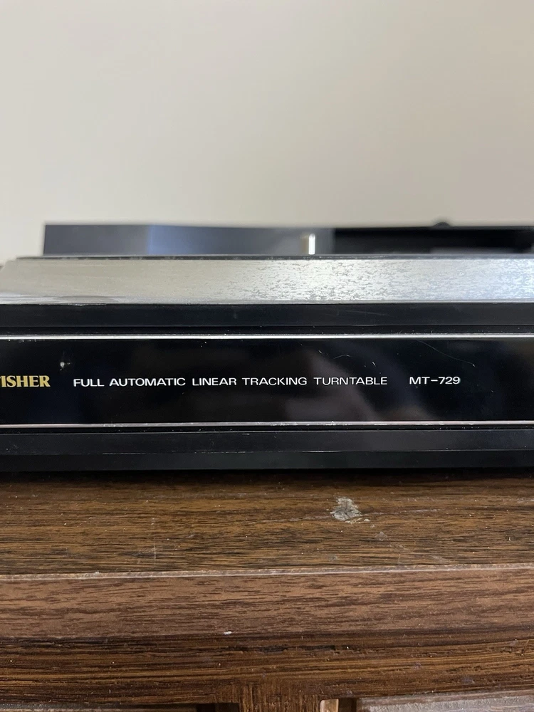 Fisher Model MT-729 Fully Automatic Tracking Turntable Doesn’t work. Is not getting any power. Dust mat is dirty and a little cracked towards middle but is still flexible. 45 rpm adapter is missing....