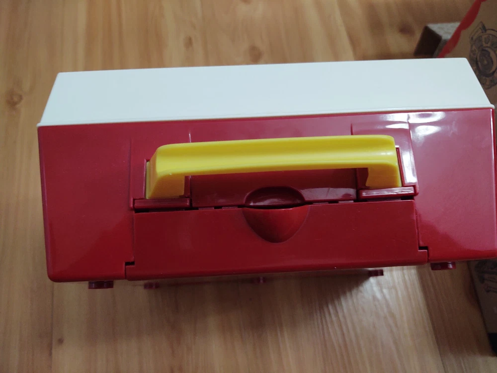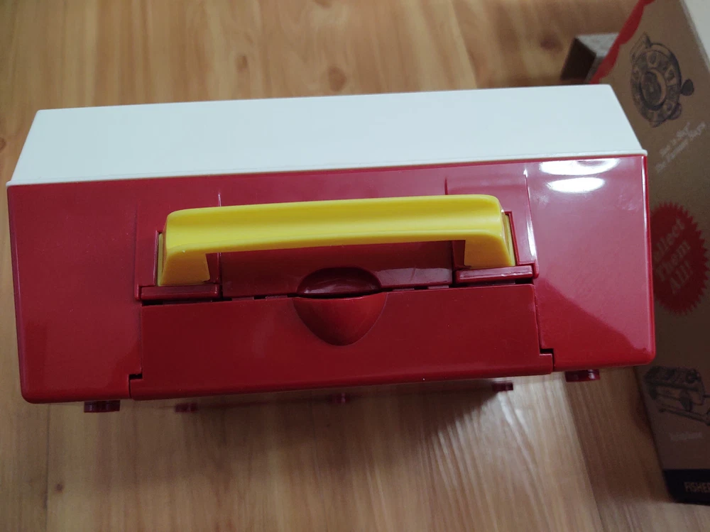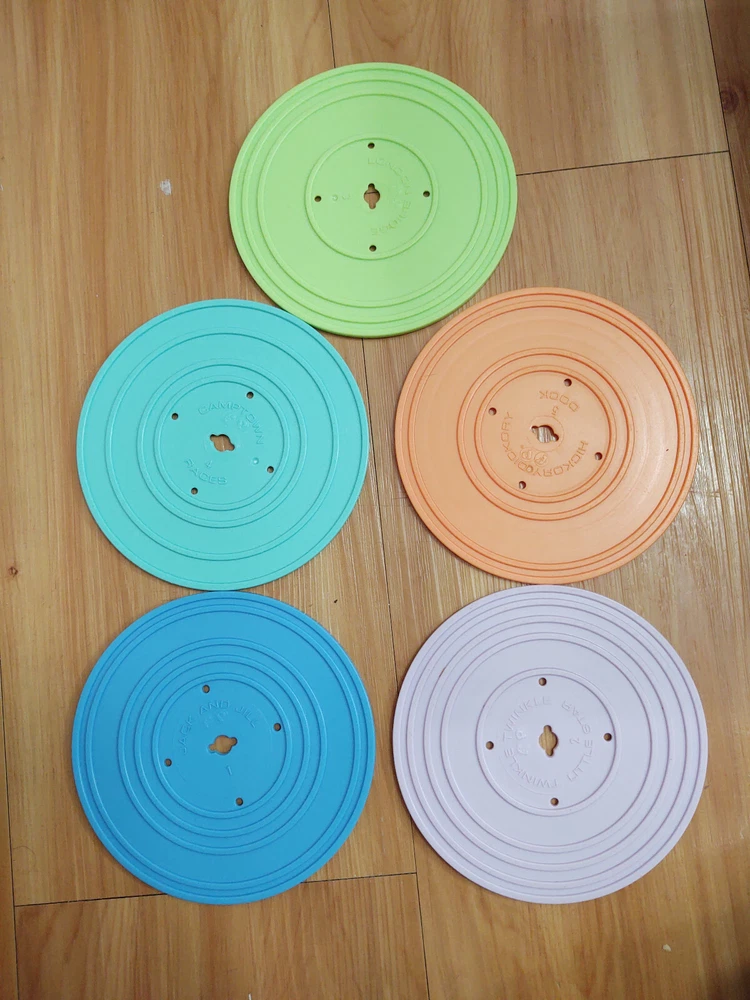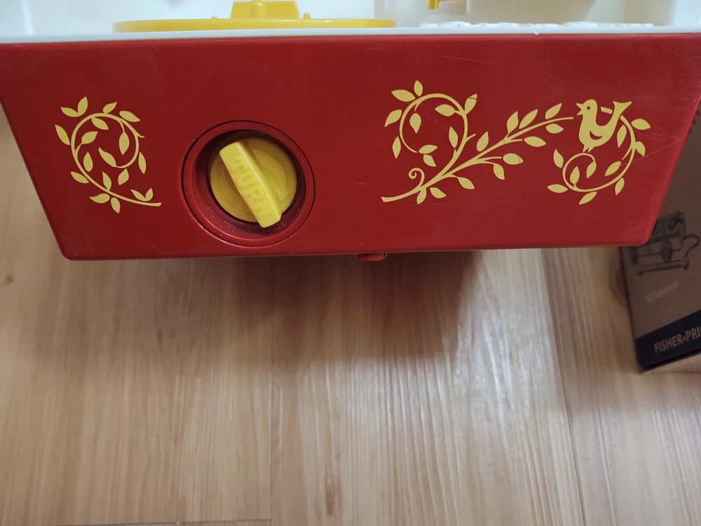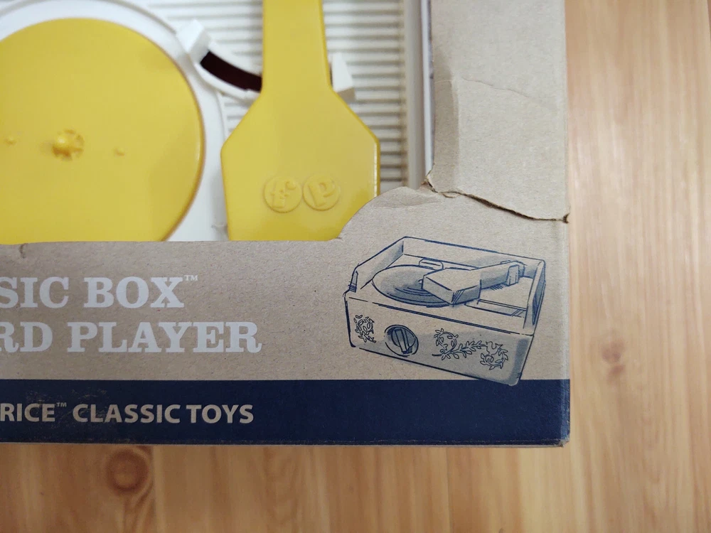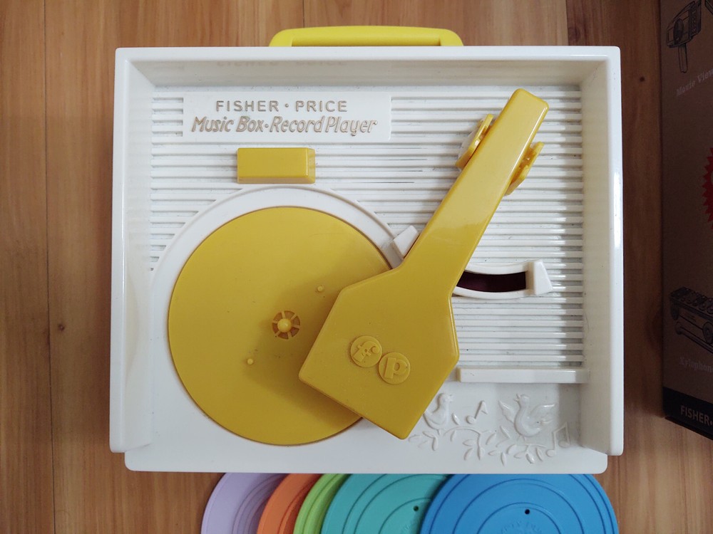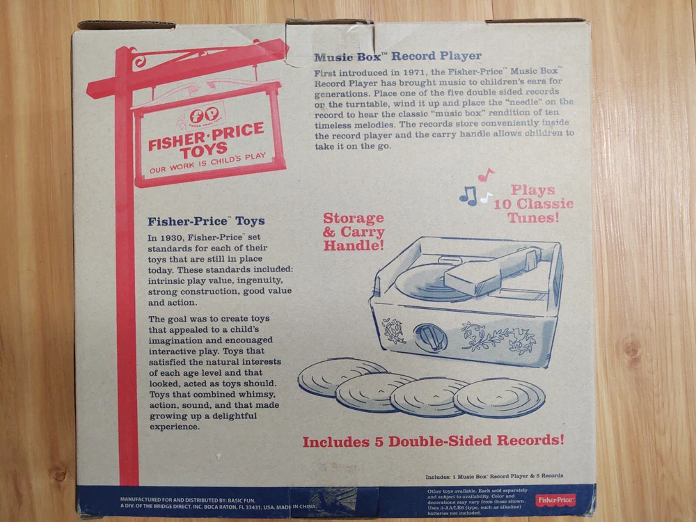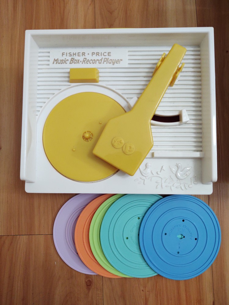 With original packaging, Fisher Price Music Box Record Player. Comes with 5 discs, 2 songs each disc for a total of 10 songs. CONDITION Used. Will show some wear. Comes with original Box. Works perfectly. Will need batteries. Smoke free home RETURNS None.