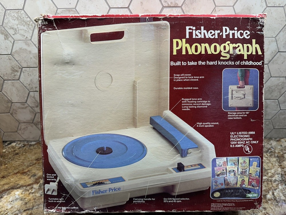Experience the classic sound of vinyl with this vintage Fisher Price Phonograph from 1984. This record player is perfect for little ones aged 4 and up, and comes with a box for easy storage. Made in the United States, this phonograph is a true gem for any Fisher Price collector. With its charming design and sturdy build, this Fisher Price Phonograph is sure to bring hours of musical fun to your child's playtime. Whether you're looking for a unique gift or simply want to add to your own collection, this vintage record player is a must-have. Don't miss out on the chance to own a piece of music history!