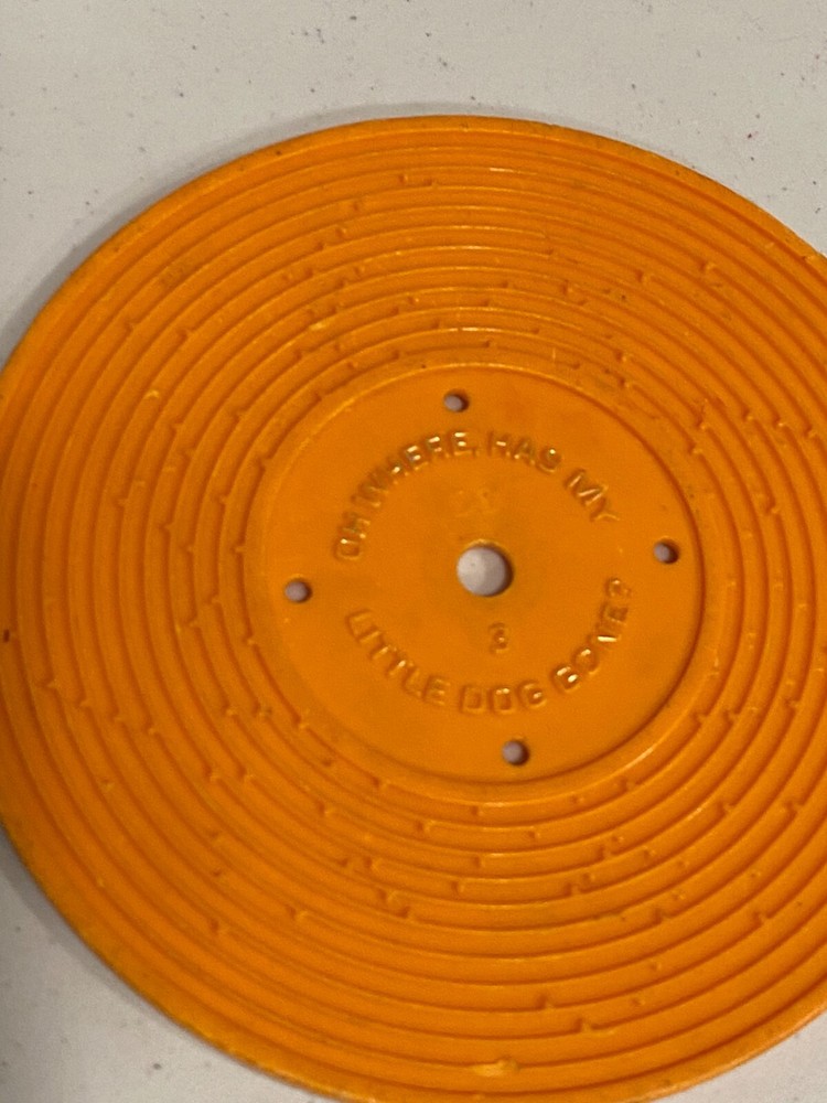 Orange Plastic Record from Fisher Price record player. It has wear from age and use. Please review all photos for details. From a smoke free home. I will be happy to answer any questions, combine shipping and entertain an offer. Thank you!