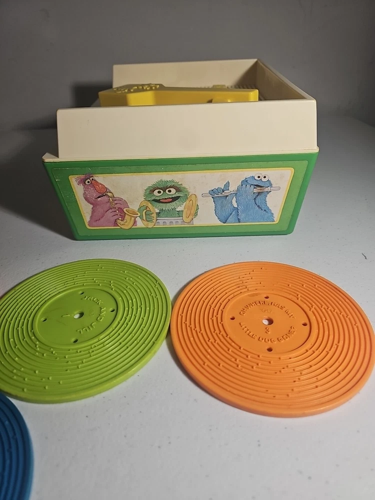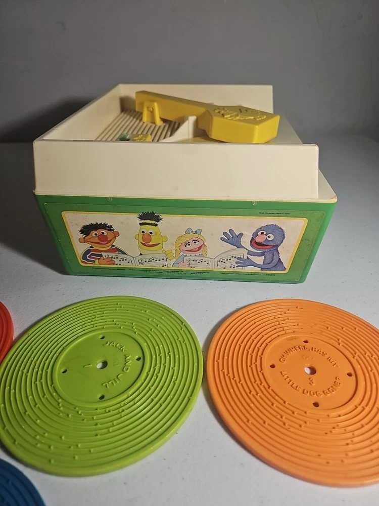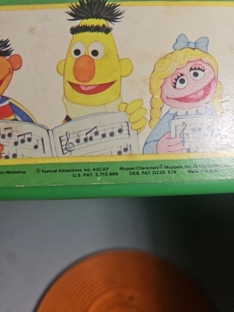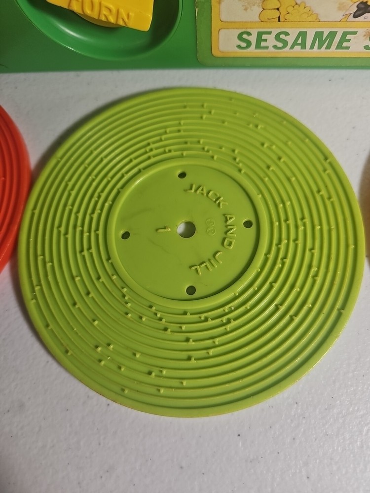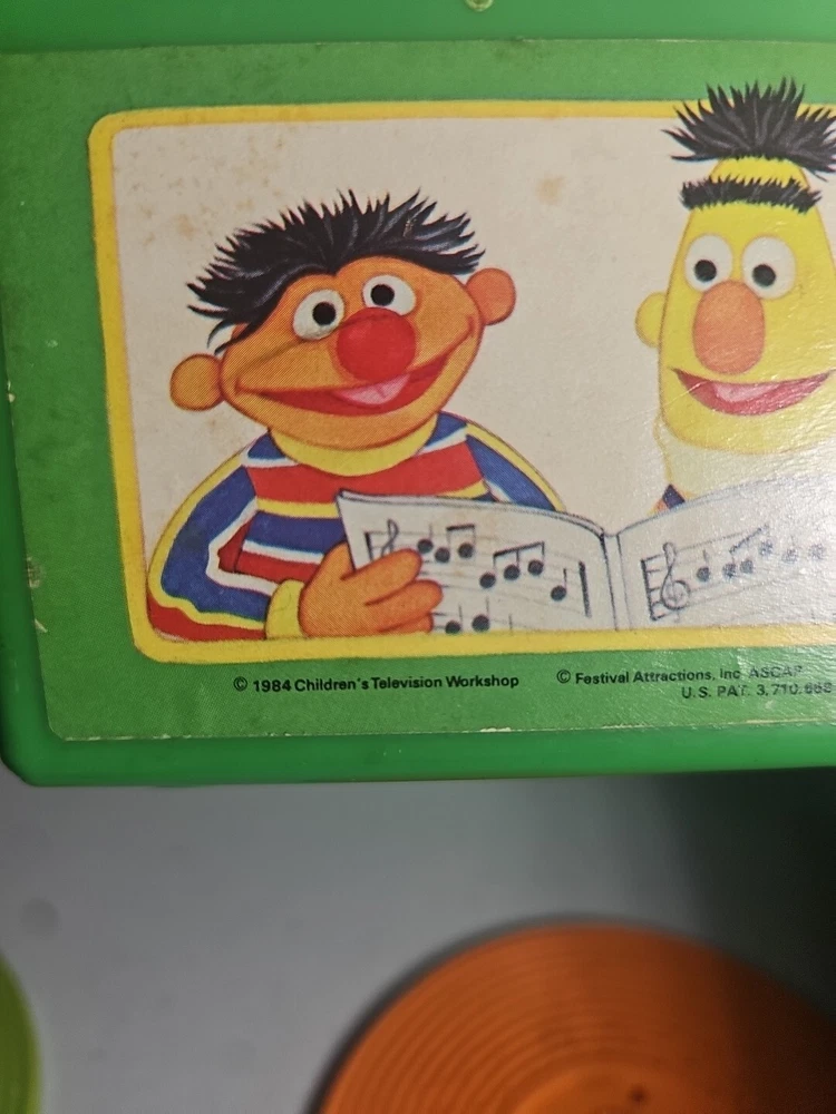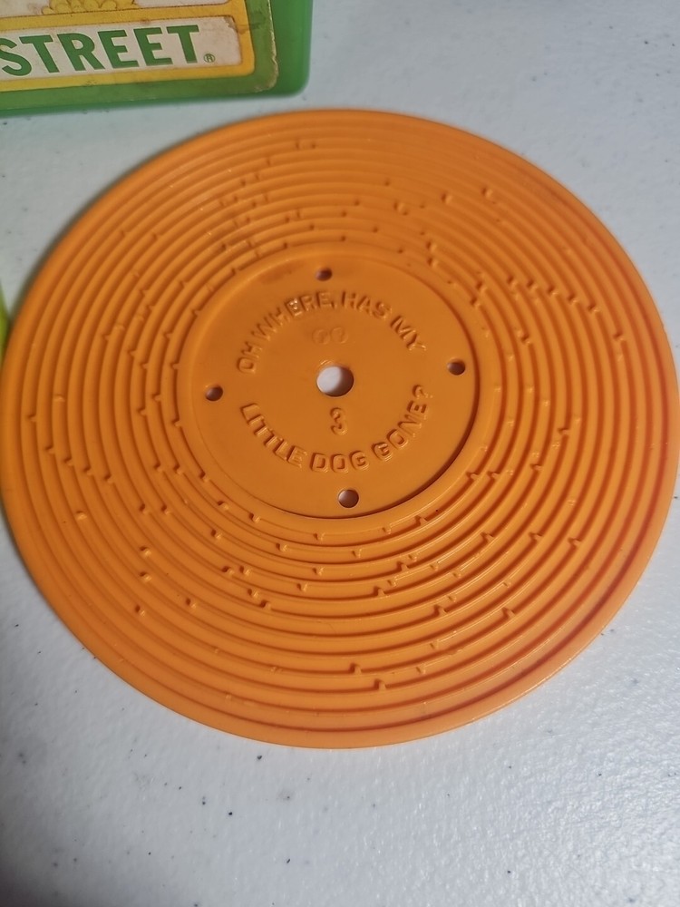 This 1984 toy brings back so many memories from the children's and television workshop. It is number 995N and completely works. It winds up and plays the music. Each of the 4 records has a different song on each side. There is little dog gone, London Bridge, Jack and Jill, Humpty Dumpty, London Bridge. Oh, where has my little dog gone, Au claire de La lune, and twinkle twinkle, little star. The numbers of the records are 1 & 2 and there are 2 number 3's so technically this would be missing 2 records or 2 toys were like this were combined at 1 time. The lithographs are all there, although there is some water damage to them as shown, but otherwise, this is in amazing vintage shape coming from a non- smoking home to yours with love.;)