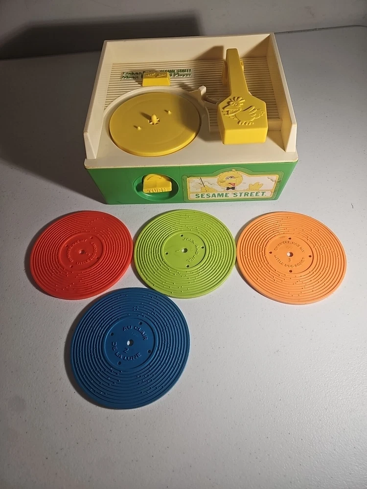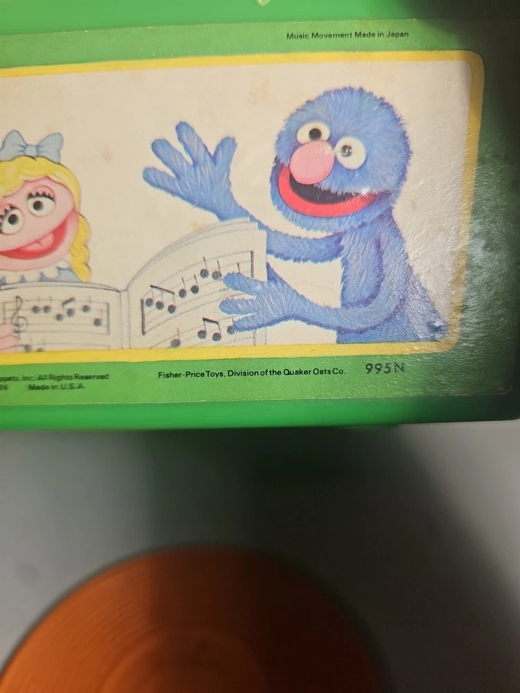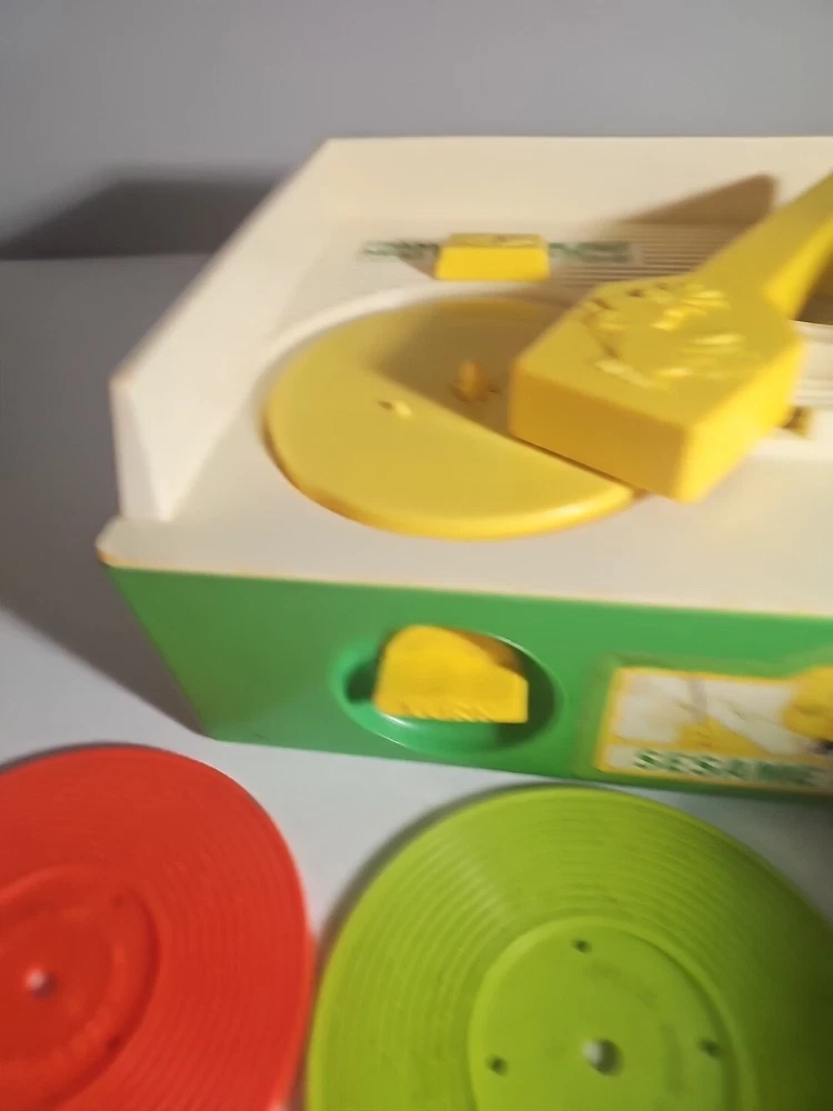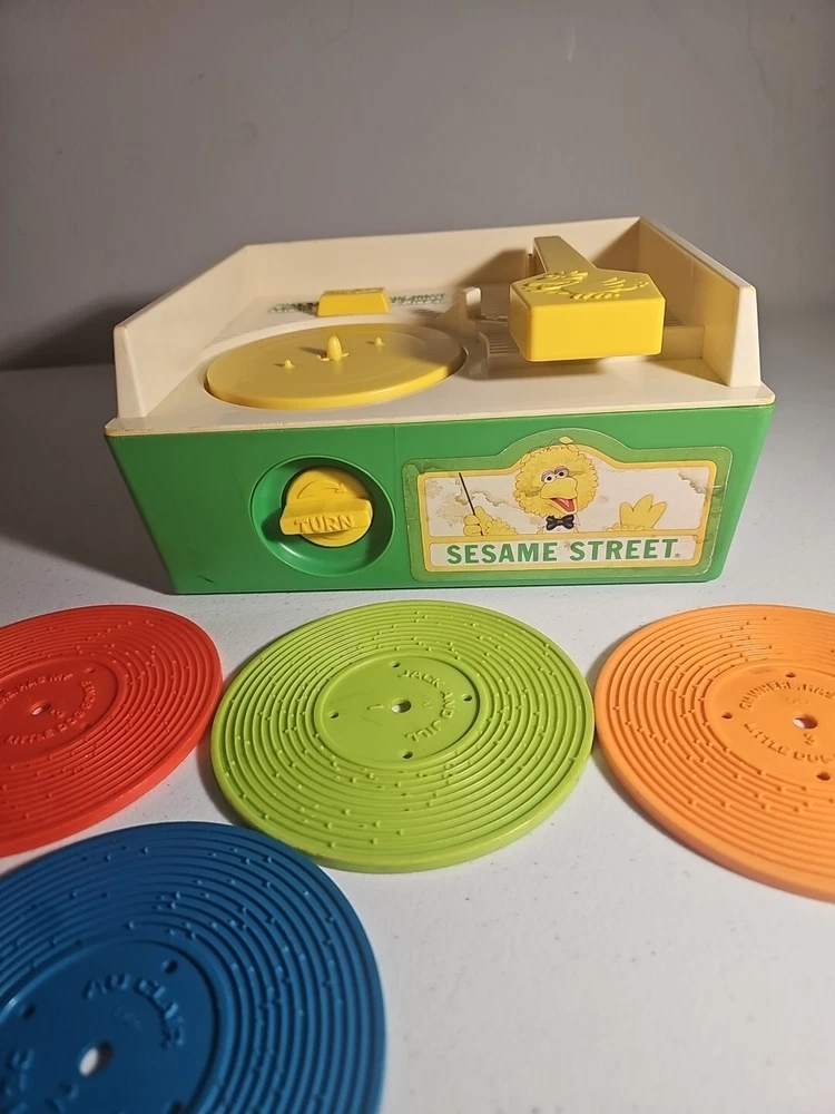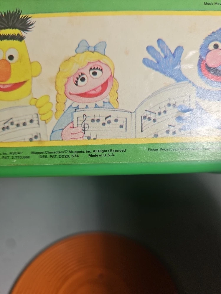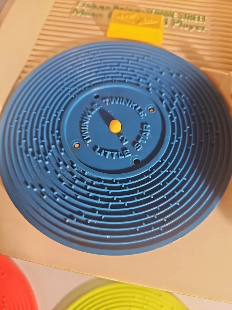 This 1984 toy brings back so many memories from the children's and television workshop. It is number 995N and completely works. It winds up and plays the music. Each of the 4 records has a different song on each side. There is little dog gone, London Bridge, Jack and Jill, Humpty Dumpty, London Bridge. Oh, where has my little dog gone, Au claire de La lune, and twinkle twinkle, little star. The numbers of the records are 1 & 2 and there are 2 number 3's so technically this would be missing 2 records or 2 toys were like this were combined at 1 time. The lithographs are all there, although there is some water damage to them as shown, but otherwise, this is in amazing vintage shape coming from a non- smoking home to yours with love.;)