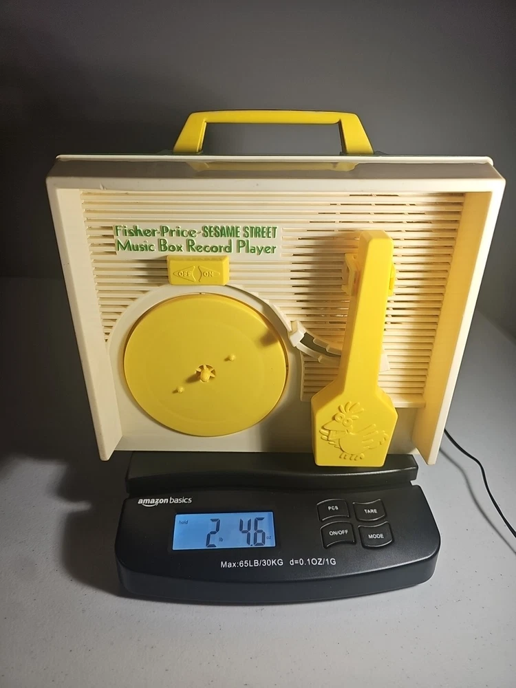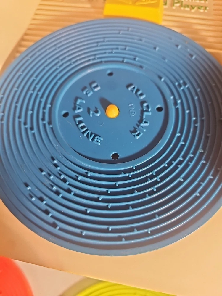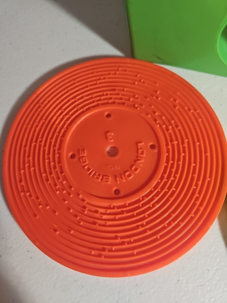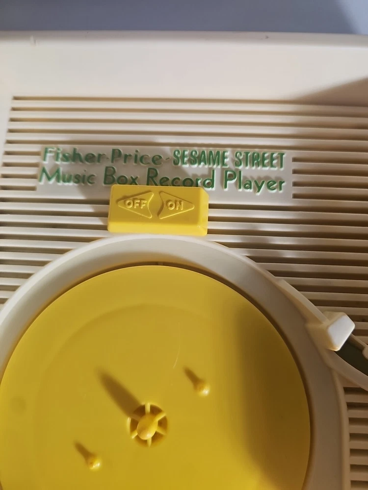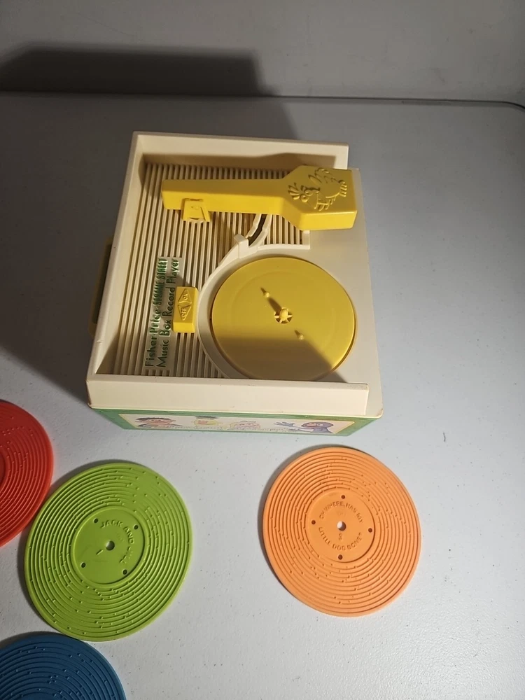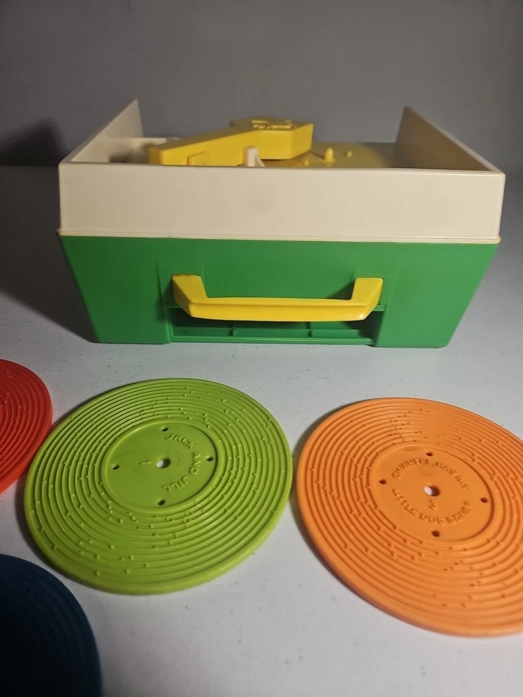 This 1984 toy brings back so many memories from the children's and television workshop. It is number 995N and completely works. It winds up and plays the music. Each of the 4 records has a different song on each side. There is little dog gone, London Bridge, Jack and Jill, Humpty Dumpty, London Bridge. Oh, where has my little dog gone, Au claire de La lune, and twinkle twinkle, little star. The numbers of the records are 1 & 2 and there are 2 number 3's so technically this would be missing 2 records or 2 toys were like this were combined at 1 time. The lithographs are all there, although there is some water damage to them as shown, but otherwise, this is in amazing vintage shape coming from a non- smoking home to yours with love.;)