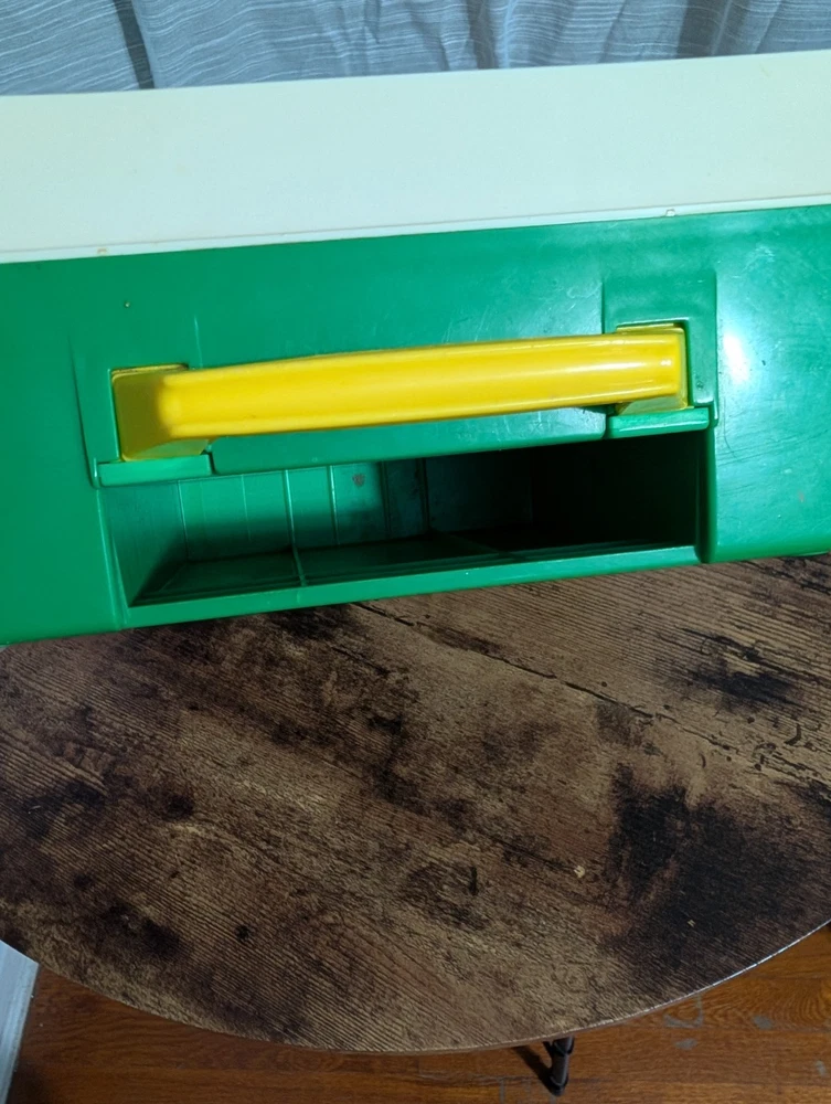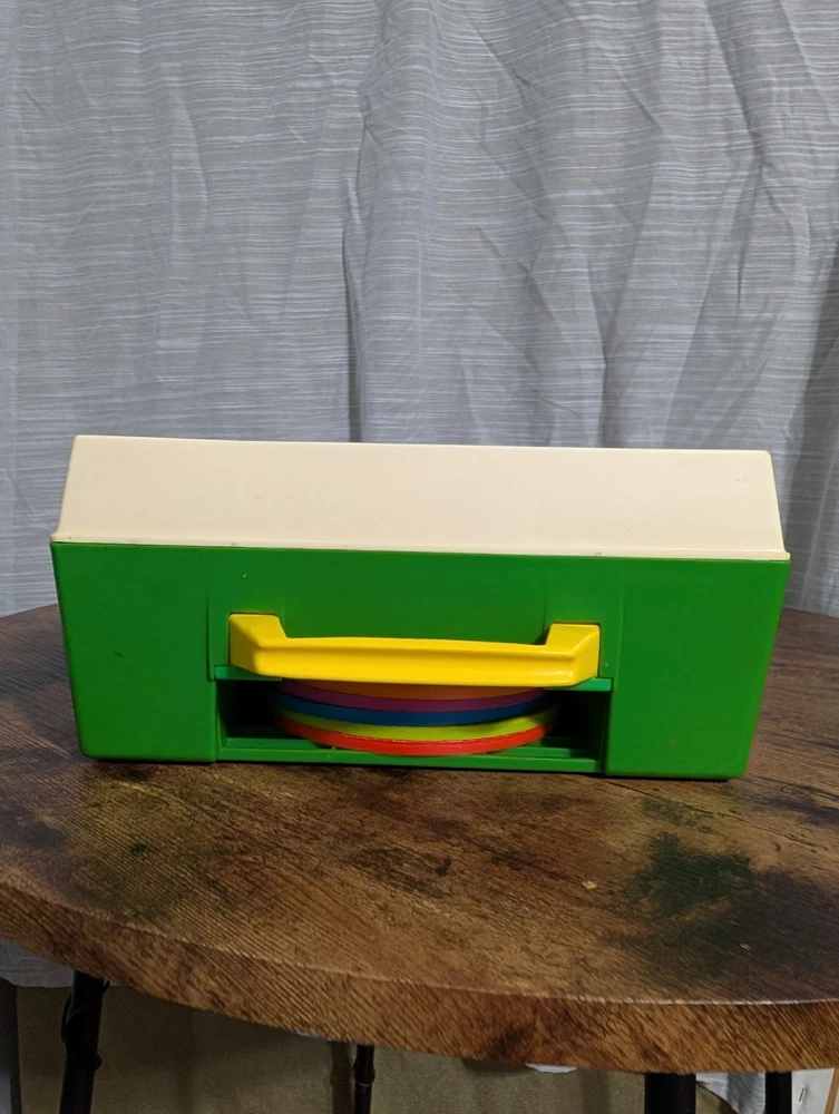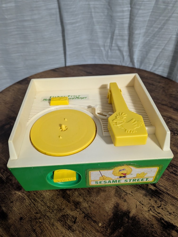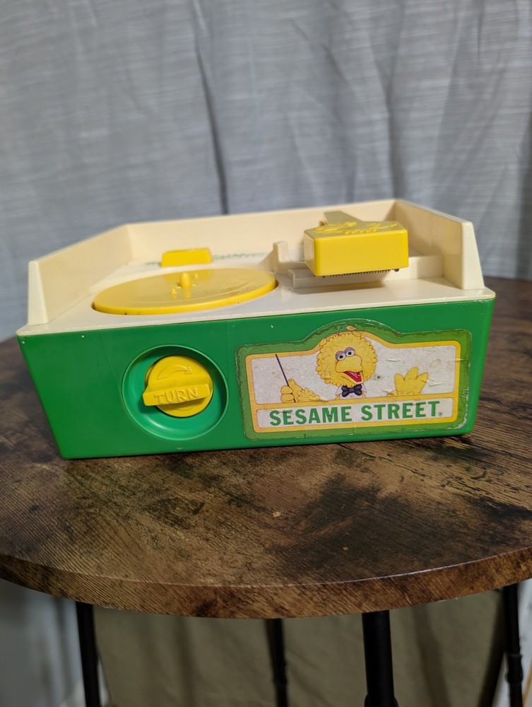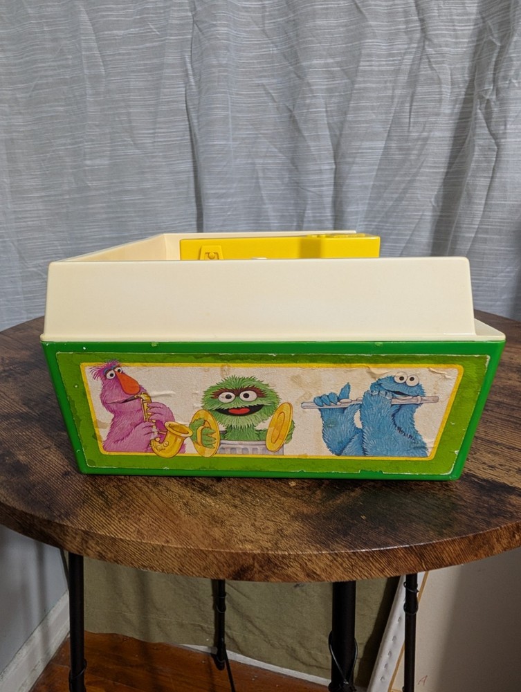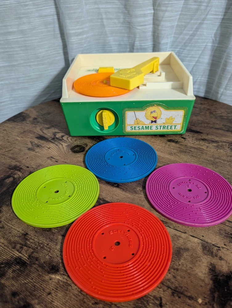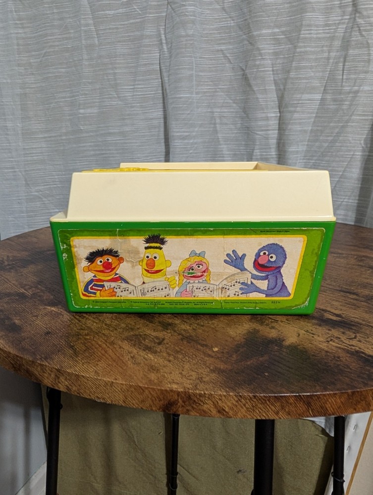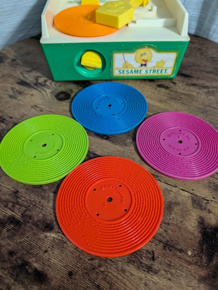 The Fisher Price Sesame Street Music Box Record Player is a nostalgic vintage toy from 1984 that combines the fun of a music box with the charm of a record player. With its iconic Sesame Street characters and classic design, this toy is perfect for young children aged 3 and up. Made in the United States by Fisher-Price, this musical toy is sure to bring joy and entertainment to any preschooler's playtime. This nostalgic sesame Street record player has all 5 original two sided records with a total of 10 songs . This wonderful record player is in working condition.