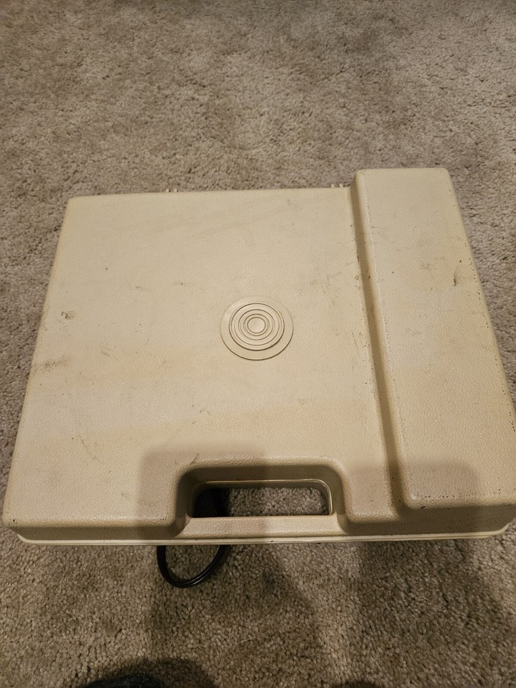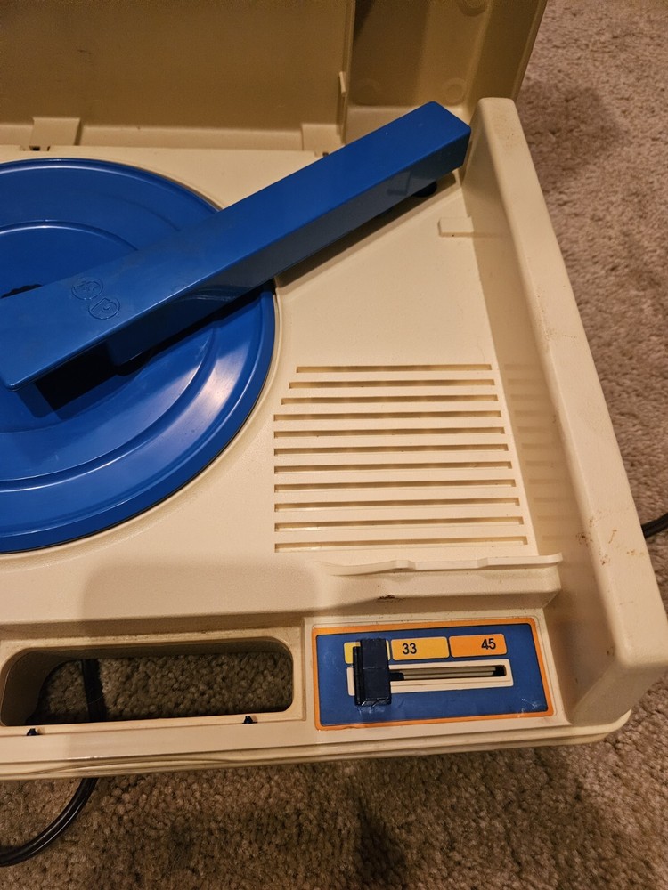 Fisher-Price Vintage 1978 Portable Record Player 825 is a musical toy that plays 33 and 45 RPM records. It is a preschool toy that was manufactured by Fisher-Price in 1978. The product is still in working condition and is a collectible item for those interested in vintage toys. Good pre owned condition. Please see all pictures Tote 11