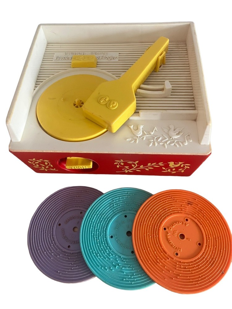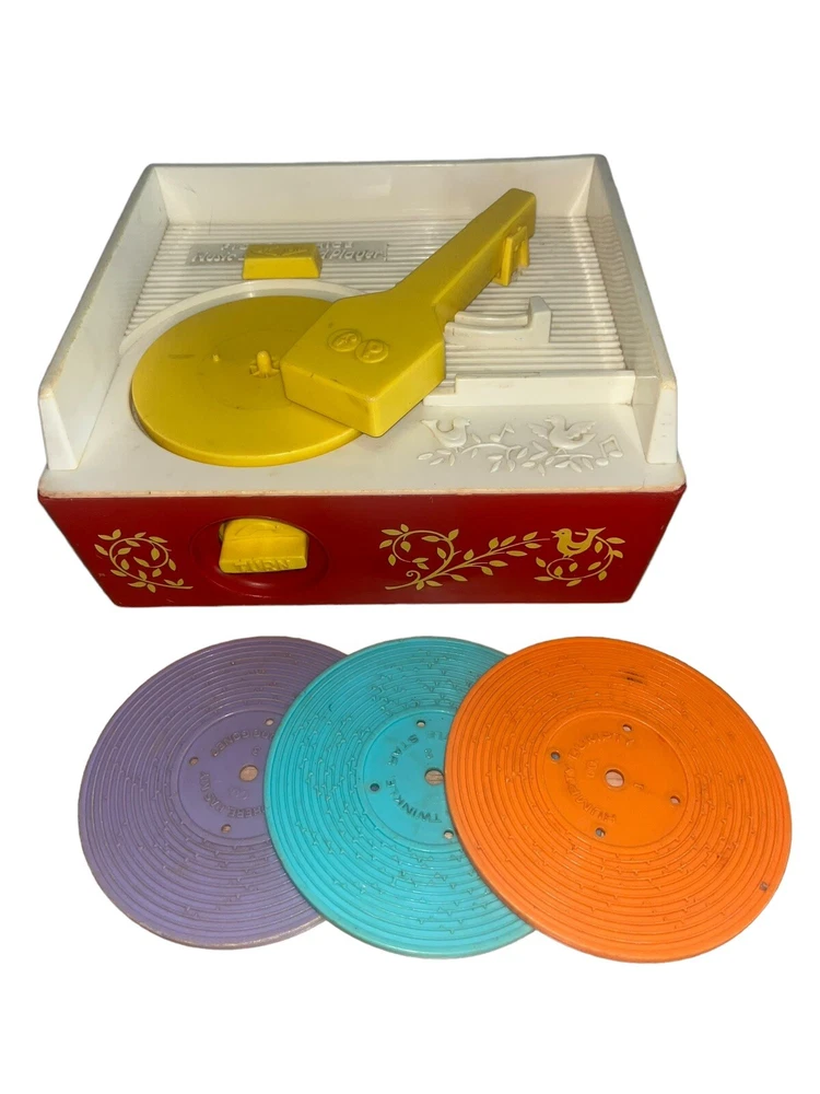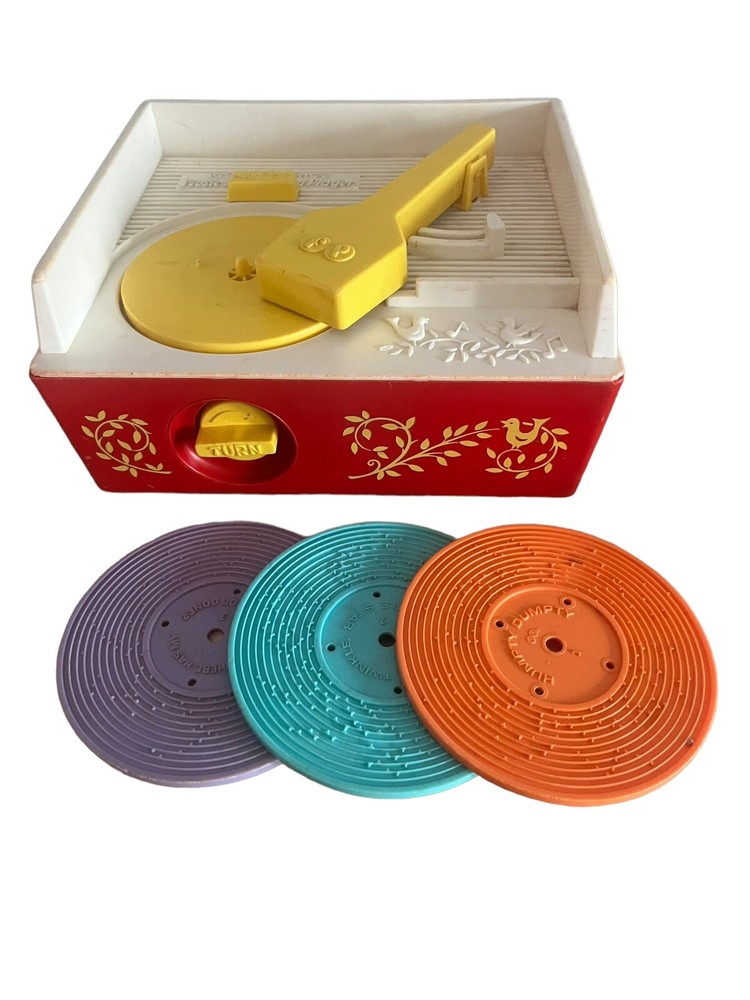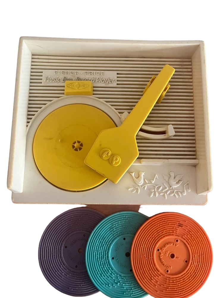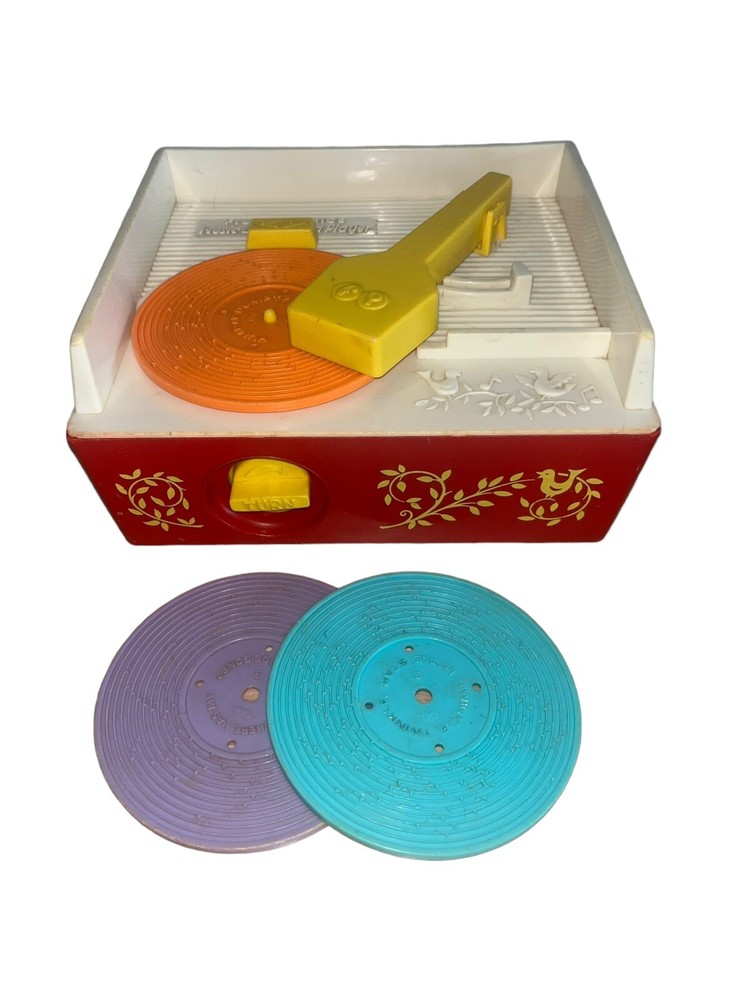 Fisher Price Vintage Wind Up Music Box Record Player #995 is a classic toy that plays music from three included records. The music box is operated by winding it up and it works!