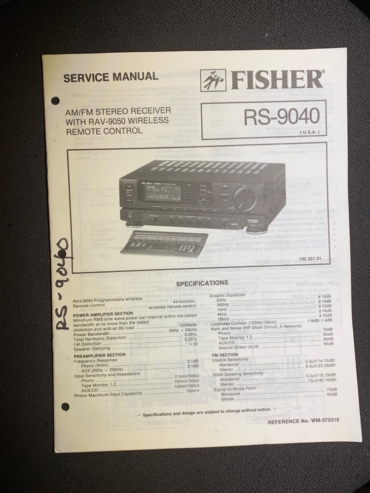 I am selling a Fisher RS-9040 Service Manual AM/FM Stereo Receiver Original.. Item was used at a repair center .. Item will be shipped USPS First Class or Media Mail..
