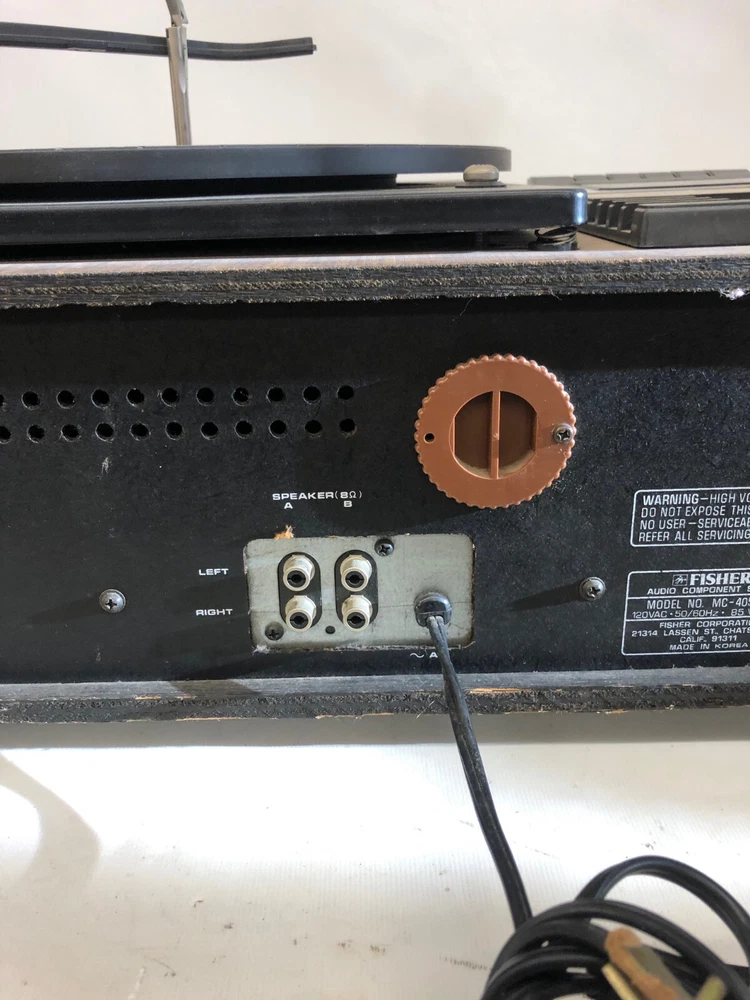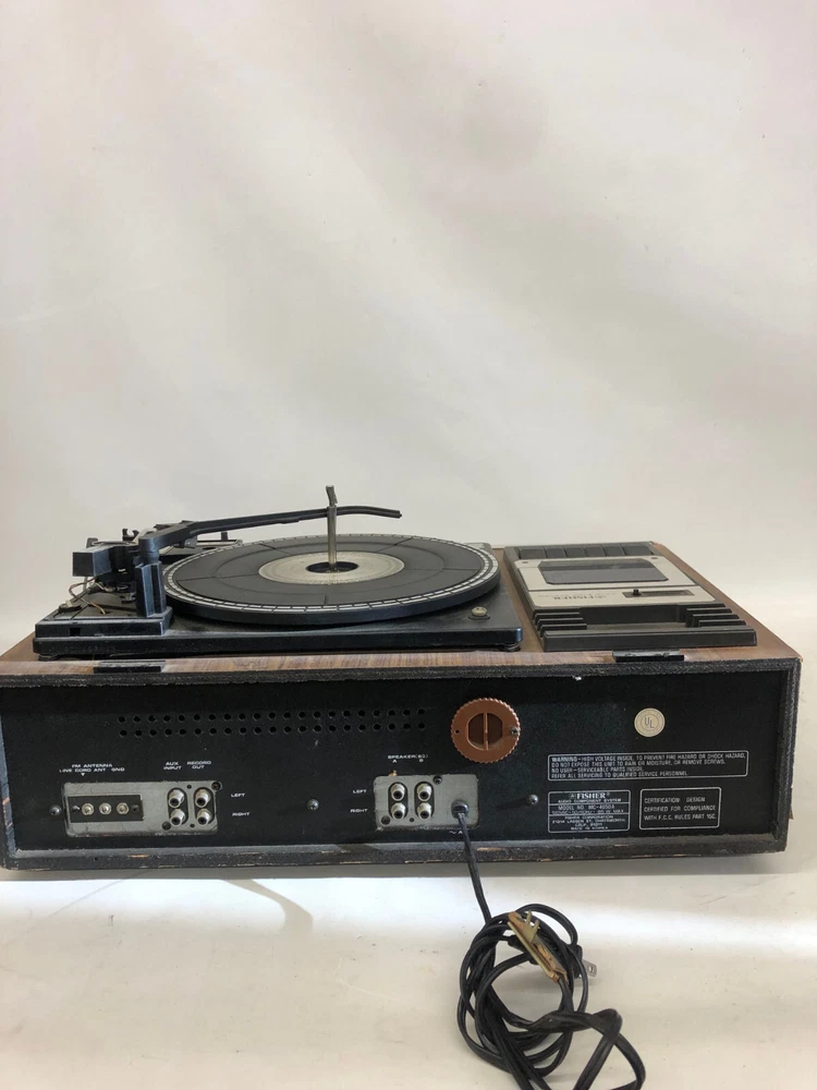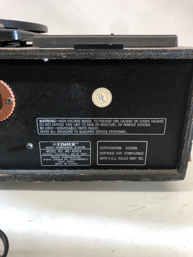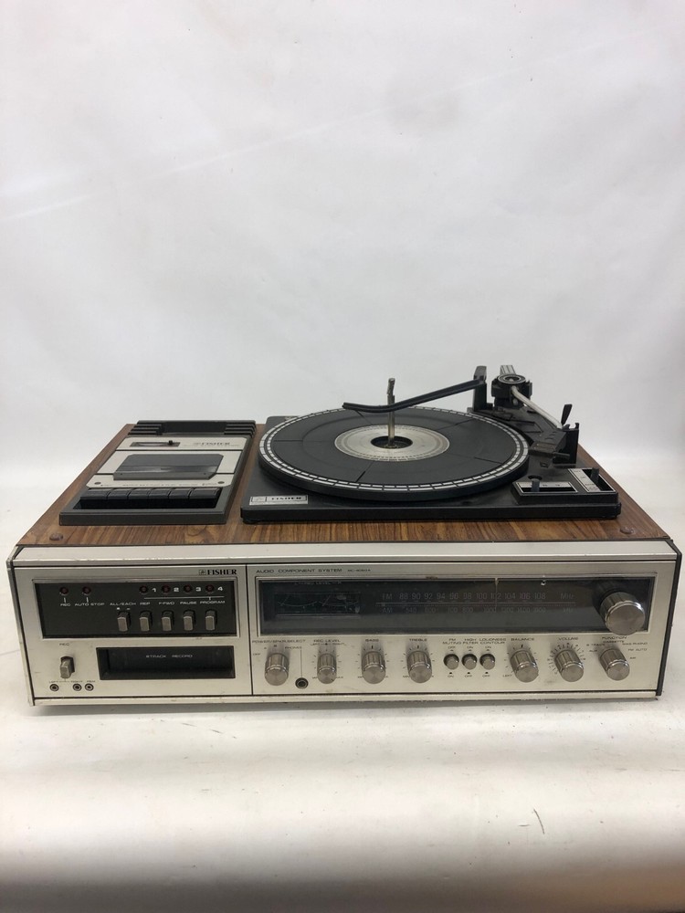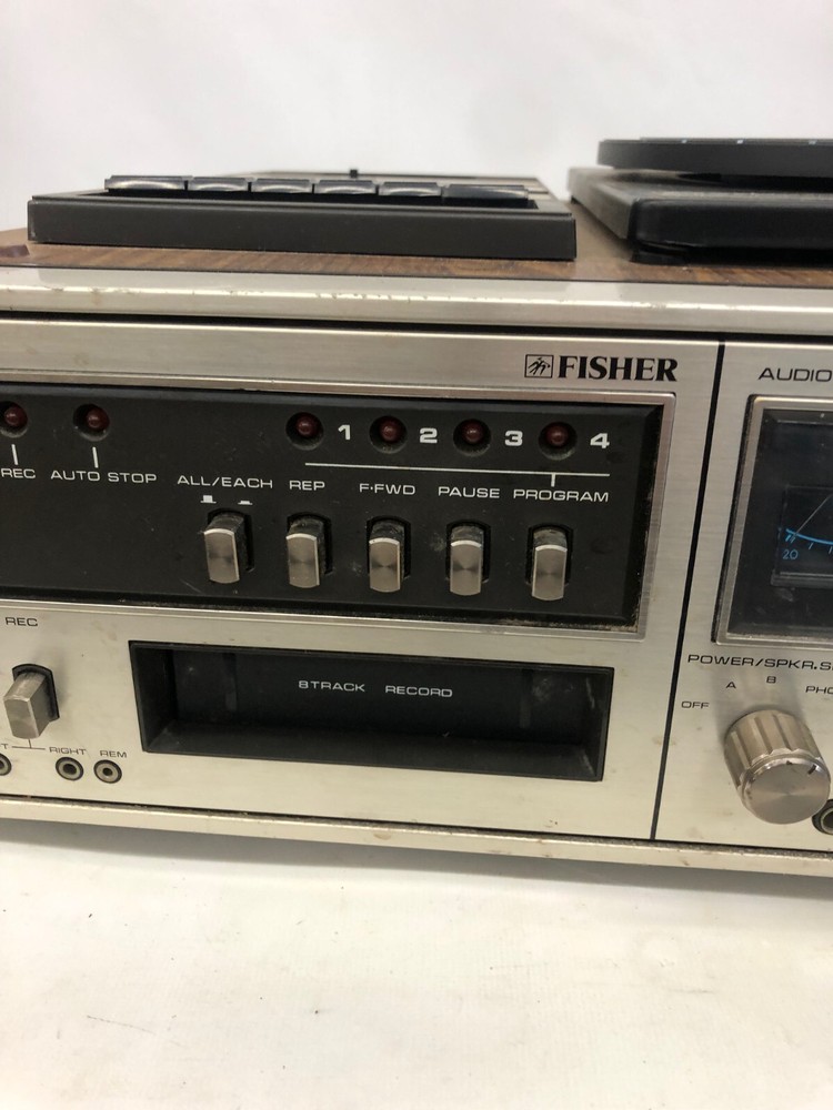 Vintage 1970s Fisher Stereo MC-4050 Audio Component System For Repair Designed to Play and Record 8-Tracks, Cassettes, and Stereo AM/FM NON Functional The Record Player and 8-Track Are Non Functional Powers On Measures 21" x 14 1/2" x 10" Includes Shell Shell But Needs New Latch Replacement For Parts or Restoration