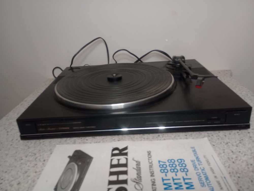 Experience the classic sound of your vinyl records with the Fisher Studio Standard MT-888 Turntable Record Player. Made in the United States, this vintage audio device powers up with ease and provides a stunning listening experience. The model MT-888 by Fisher is a must-have for any audiophile looking to add a touch of vintage charm to their collection. With its brand name and vintage design, this turntable record player is a great addition to any home decor. It is perfect for those who love to listen to their old vinyl records and enjoy the classic sound of the past. The Fisher Studio Standard MT-888 Turntable Record Player is a great investment for anyone who wants to relive the memories of their favorite music.