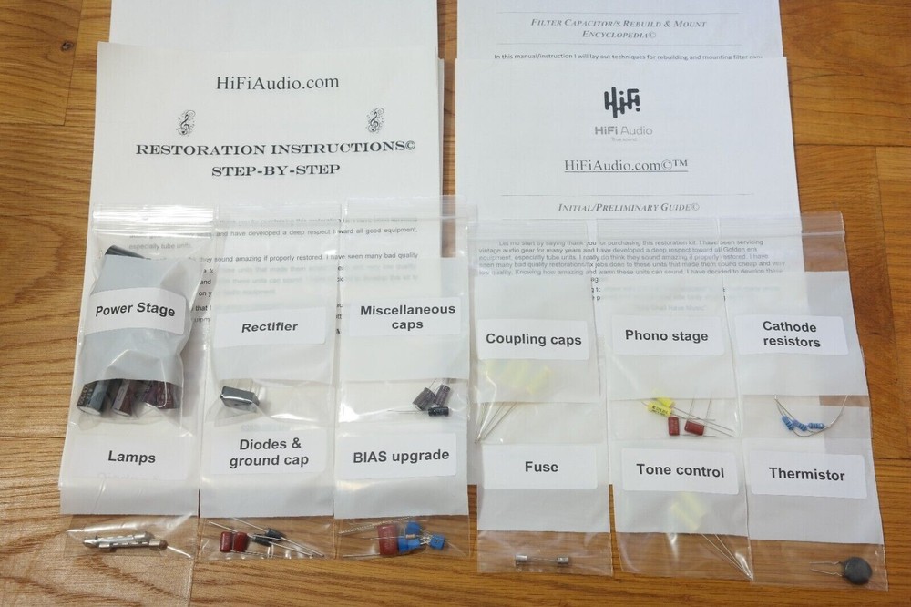 The scarcity of good, honest techs who can do good and reasonably priced restoration/rebuild of audio equipment inspired me to create this restoration kit. In today's day and age, it is difficult to find a knowledgeable technician who can service your audio gear properly. I have seen many poor quality restorations of equipment that cost way too much for their owners. In 99% of the cases, only a few parts were replaced, instead of a full and proper restoration job. A proper restoration must replace all electrolytic, paper, film, oil capacitors. Do not fall for partial kits. This is not a good or proper way to restore your audio equipment. It is the same as with car tires; one should never replace just one tire and keep the other worn-out tires on. A proper rebuild requires a full recap of all oil, paper, lytic capacitors. On the other hand, if one succeeds in finding a good tech, the wait time is usually 6-12 months for the unit to be serviced, and costs are sky-high. I have been servicing audio equipment for many years and have developed deep respect for all good equipment. Knowing how amazing and warm these units can sound, I decided to put together this kit. It includes very good upgrades and improvements that must be done to the unit. This restoration kit will make a huge difference in the sound quality. All the parts are of high-quality Japanese Nichicon / Rubycon / WIMA / IC / United Chemi capacitors. I am extremely particular about the quality of the parts provided in this kit. Knowing how many bogus/fake caps, diodes, resistors, etc. are out there, I source all the parts from reputable wholesalers and buy them in bulk. Vintage audio equipment has the potential to deliver rich and authentic sound when it is properly restored. Not only can it enhance your listening experience, but it can also evoke memories and bring joy to your life. Let's work together to bring your vintage gear back to its full potential, and make sure you have the music you deserve. ♩♬♫♪♫♩♬ “They Shall Have Music”- Avery Fisher Included in this kit: 1. Power/Filter stage capacitors ( Nichicon / Nippon / United Chemi) electrolytic capacitors. 4 x custom made PCB adapter plates to help one replace the multi-section can capacitors. Note, the image with silver multicap cans shown restaffed with new caps is for illustration purpose only. 2. Detailed instruction with colorful images, schematics, manuals (all of these are in electronic form, I consider these much better than printed version due to zoom availability). 3. Schematics (all of these are in electronic form, I consider these much better than printed version due to zoom availability). 4. Complete audio path upgrade with high quality WIMA or IC (Illinois capacitor) film capacitors. 5. Parts for complete recap of all the electrolytic capacitors. 6. Complete recap of all oil, film, paper, lytic caps. 7. fuse/s 8. Instructions on how to clean the chassis. 9. Instructions on how to clean a faceplate 10. Instructions on how to polish knob covers. 11. Support/help to a reasonable extent in case you need it. (This is what makes us different from other sellers.) The custom-designed PCB boards simplify the restoration process for multi-capacitor can capacitors in vintage audio equipment. Clearly labeled with polarity markings and mounting guides, they ensure precise assembly and seamless integration into your restoration project. These PCBs are also designed with cuts and openings to accommodate the original multi-section capacitor covers, allowing them to be reinstalled and preserving the authentic vintage look. An essential addition for maintaining both authenticity and functionality in vintage audio gear. We also offer a great selection of Restoration Kits , LED conversion kits , Volume Controls , Rotary Switches and other rare/unique parts; Make sure to check our store ---------> LINK (Use the search bar inside the shop to find what you need faster) We may also be interested in purchasing your equipment