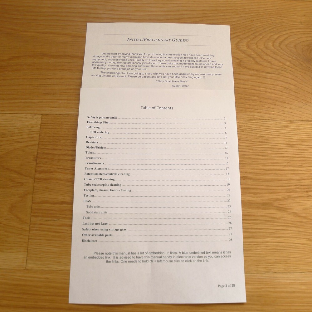 We may also be interested in purchasing your equipment. .. This listing is for 1 x FULL kit to be selected form the below list. Up for sale is Fisher TX200 restoration kit. This kit includes FULL restoration kit. ---------- The scarcity of good, honest techs who can do a good and reasonably priced restoration/rebuild of audio equipment (especially tube gear) made me start offering this restoration kit. In today's day and age it is very hard to come by a knowledgeable tech who can service your audio gear well. I have seen many poor quality restoration of equipment that cost way too much to its owners. In 99% of the cases there were only few parts replaced, instead of a full and proper restoration job. On the other hand, if one succeeded in finding a good tech, a wait time is usually 6-12 months for the unit to be serviced. In this kit I offer parts and instructions for a full/complete restoration of your audio equipment. I have been servicing audio equipment for many years and have developed deep respect toward all good equipment, especially tube gear. I really do think they sound amazing if properly restored. I have seen many bad quality restorations/fix jobs done to these units that made them sound cheap and very low quality. Knowing how amazing and warm these units can sound, I have decided to develop this kit to help you do a great job on your equipment. It includes very good upgrades and improvements that MUST be done to the unit. Please do your audio equipment a favor and replace the most important components that are most likely 90% dead. Power / Filter stage caps are those large silver cans mounted on top of the chassis and sometimes underneath. This restoration pack will make a huge difference in the sound quality. All the parts are of high quality Japanese Nichicon / Nippon / WIMA / IC / United Chemi capacitors. I provide several instructions on how to mount those new electrolytic caps. The best one is to rebuild those original cans. You will receive a step-by-step instructions and all the proper caps needed for that. This technique will keep the original look of the unit. I am extremely particular about the quality of the parts provided with this kit. Knowing how many bogus/fake caps, diodes, resistors etc. out there, I source all the parts from reputable whole-sellers and buy them in bulk. The knowledge that I am going to share with you have been acquired by me over many years serving audio equipment. Please be patient and let’s get your little birdy sing again. “They Shall Have Music” Avery Fisher Included in this kit: 1. Power/Filter stage upgrade with authentic Nichicon / Nippon / WIMA / IC / United Chemi electrolytic capacitors. 2. Detailed instruction with colorful images, schematics, manuals (all of these are in electronic form, I consider these much better than printed version due to zoom availability). 3. Schematics 4. Complete audio path upgrade with high quality WIMA or IC (Illinois capacitor) film capacitors. 5. Parts for compete recap of all the electrolytic capacitors. 6. Complete recap of all PCBs. 7. Bridge rectifier.. 8. 1 x main fuse 9. Instructions on how to clean the chassis. 10. Instructions on how to clean a faceplate 11. Instructions on how to polish knob covers. 12. Support/help to a reasonable extend in case you need it. (This is what makes us different from other sellers.) -------- Also available NEW production volume control -----------> LINK We may also be interested in purchasing your equipment.