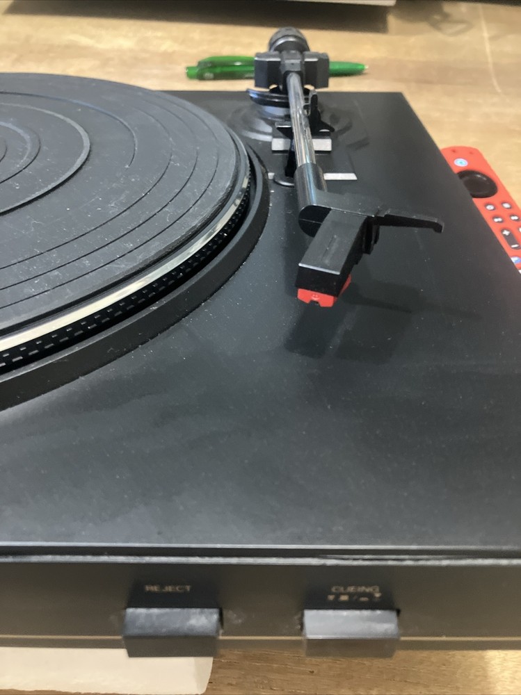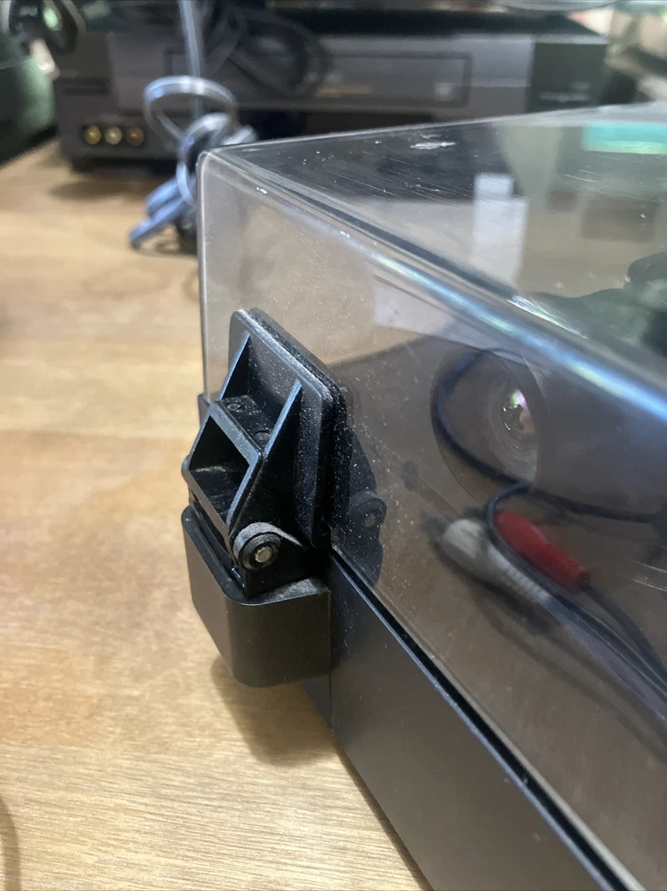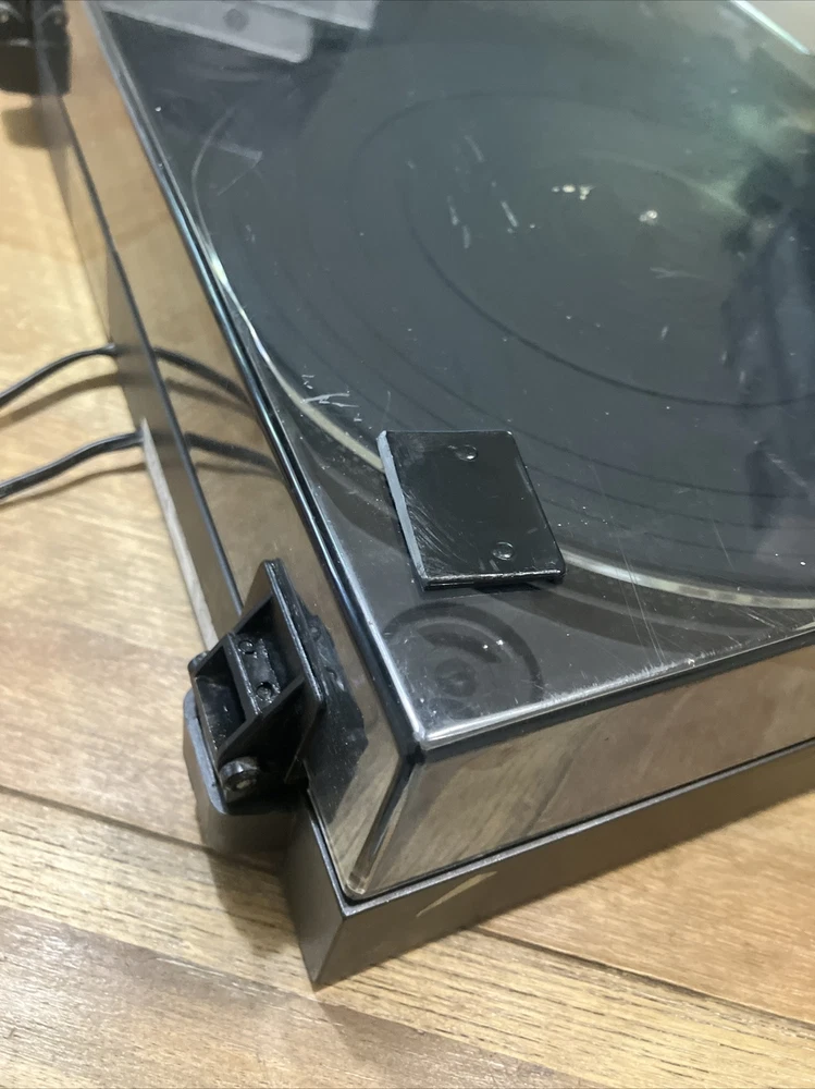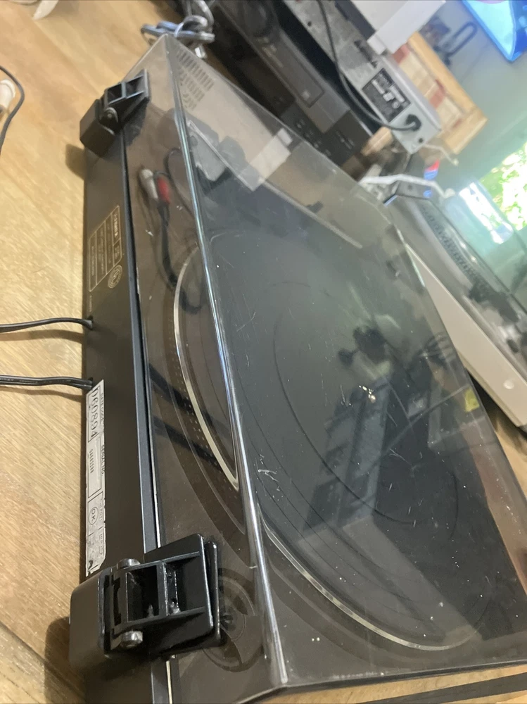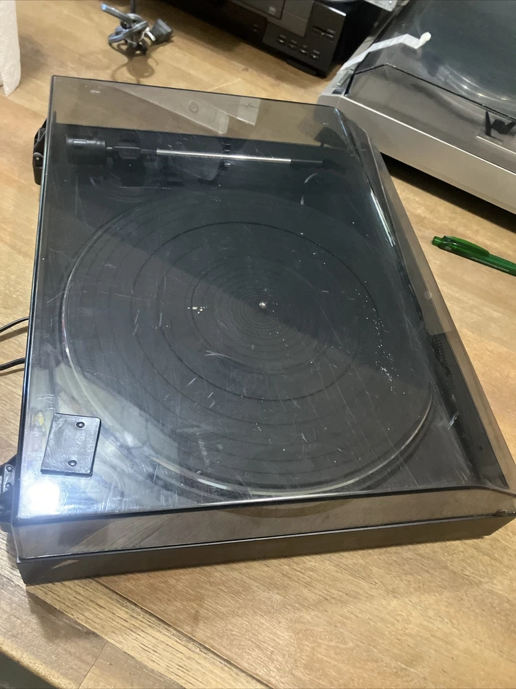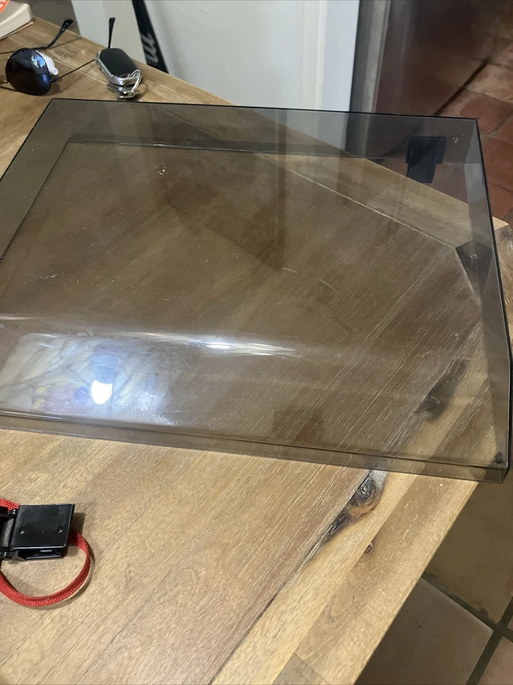Glass cover has broken clip therefore cover will not stay up during loading of record. Cover in excellent condition otherwise. Unit has not been tested with speakers. Overall clean and powers on .