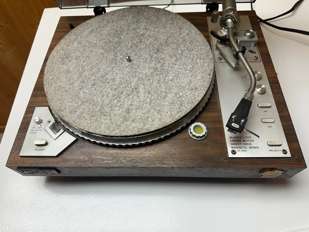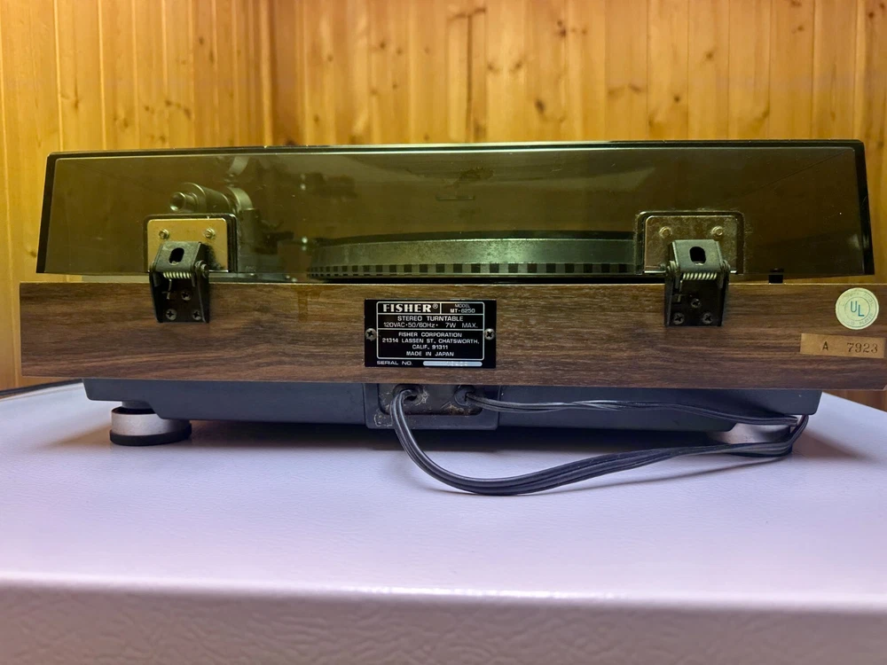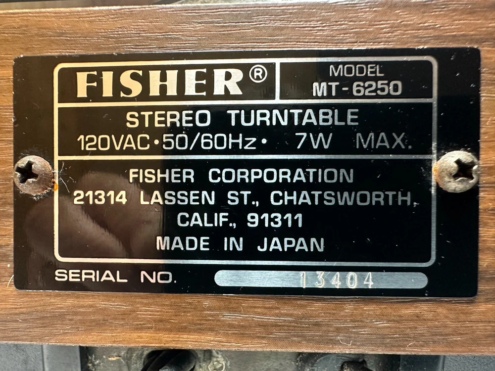 I don't know why people retract bids. If there is a bid retraction on this auction I reserve the right to end this auction early and re-list the item. I'm sorry but it isn't fair to everyone if there is a bid retraction. If you are not a bid retractor please read on. Fisher turntable MT-6250. Serial #13404. I would say this turntable is currently in fair condition. The turntable has stickers on it that will need to be removed. The cover has a fair amount of surface scratches. Some metal is oxidized as shown in the pictures. The turntable is generally dirty and will need to be cleaned. The cover is not broken. The hinges work well. The 45 RMP button and the 33 RPM buttons work. Both of the manual speed control knobs work. The power button works. The quartz lock works as shown in the video. The needle seems to be good. I did not have an amplifier with a phono input to test the audio from the turntable. I did connect the turntable to the CD input of my receiver and audio did come out of both channels. The audio you can hear in the video that shows the quartz lock functioning is the audio from the turntable. The audio was not very loud as you would expect from using a CD input but the audio that was there was undistorted and clean. So I guess in summary everything seems to work well on the turntable but it needs a lot of cleaning and / or a restoration. The unit is boxed up and ready to ship. I try to ship same day if I can. The unit is heavy and is in a pretty good sized box. Buyer pays actual shipping costs. Although you can see the turntable working in the video it is being sold as-is for parts. Thanks for looking!