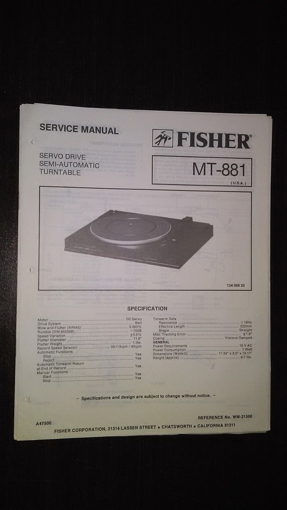Fisher MT-881 Service Manual – Original Repair Guide for Stereo Turntable Record Player