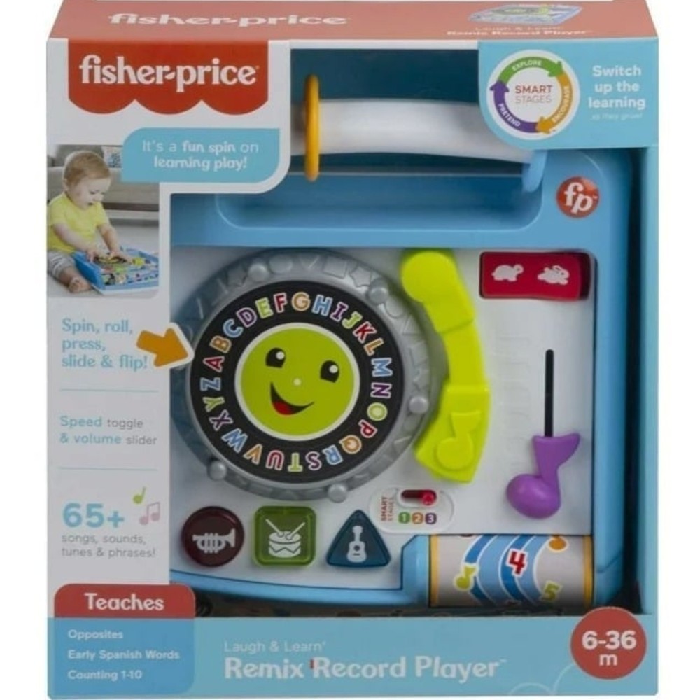 NEW!! DJ Baby is in the house! The Fisher-Price Laugh & Learn Remix Record Player activity toy lets babies put their own 'spin' on learning play. This pretend turntable features hands-on activities and fun music to help baby rock out while learning about opposites, numbers and counting, Spanish words and more. And with three Smart Stages levels of play, the learning fun changes as your mini DJ grows from infant to toddler! Interactive pretend record player toy with fun activities, lights, music, and learning songs 3 Smart Stages levels teach colors, shapes, counting 1-10, Spanish words and more 7 fun activities to spin, press, roll, slide and flip, helping to keep little hands busy 65+ songs, sounds, tunes and phrases for fresh and funky learning play Helps strengthen fine motor skills and encourages early role-play for babies and toddlers ages 6 to 36 months T415(3)