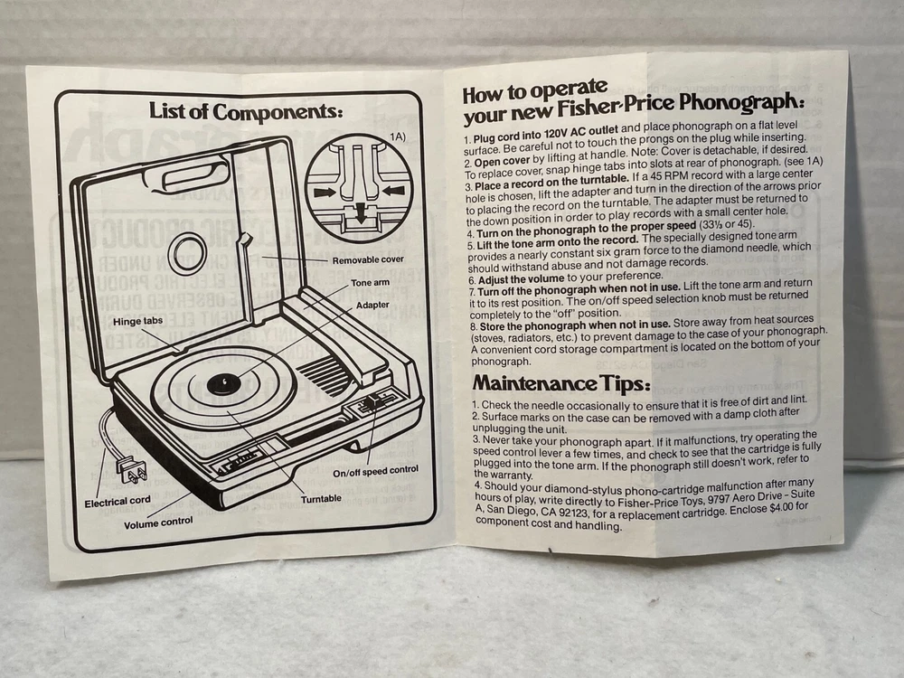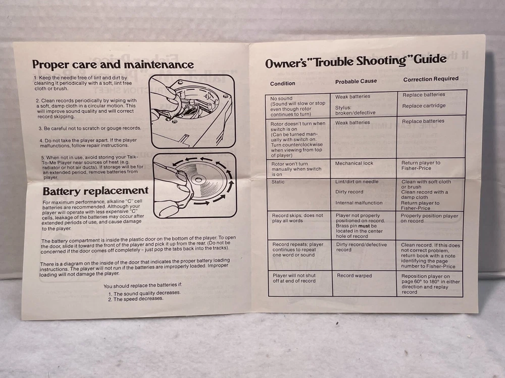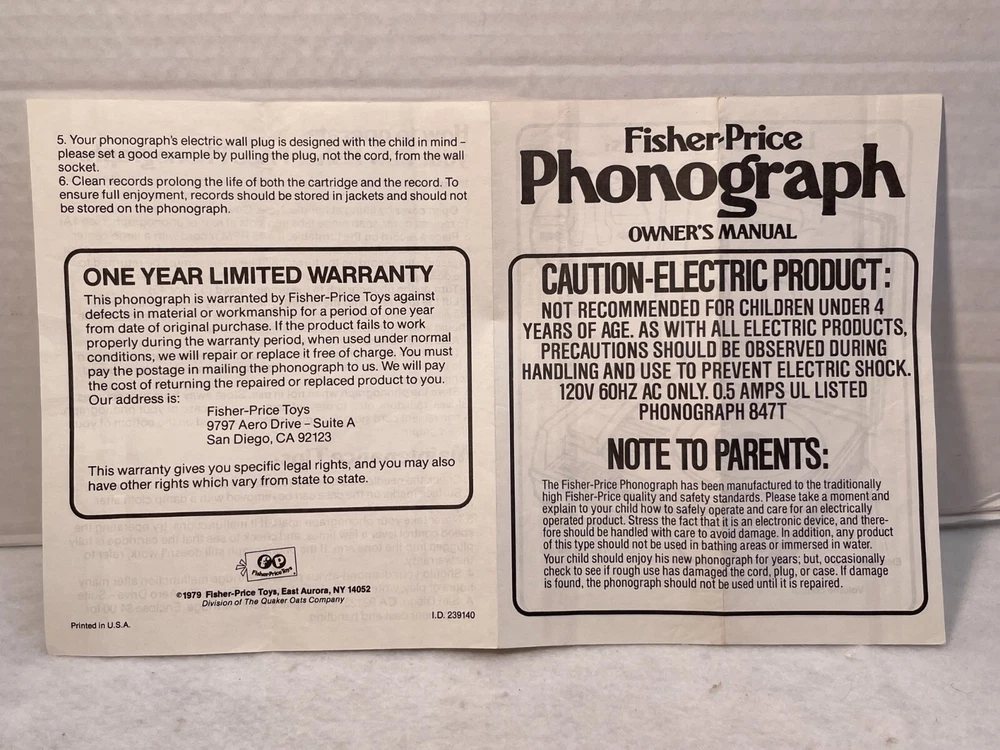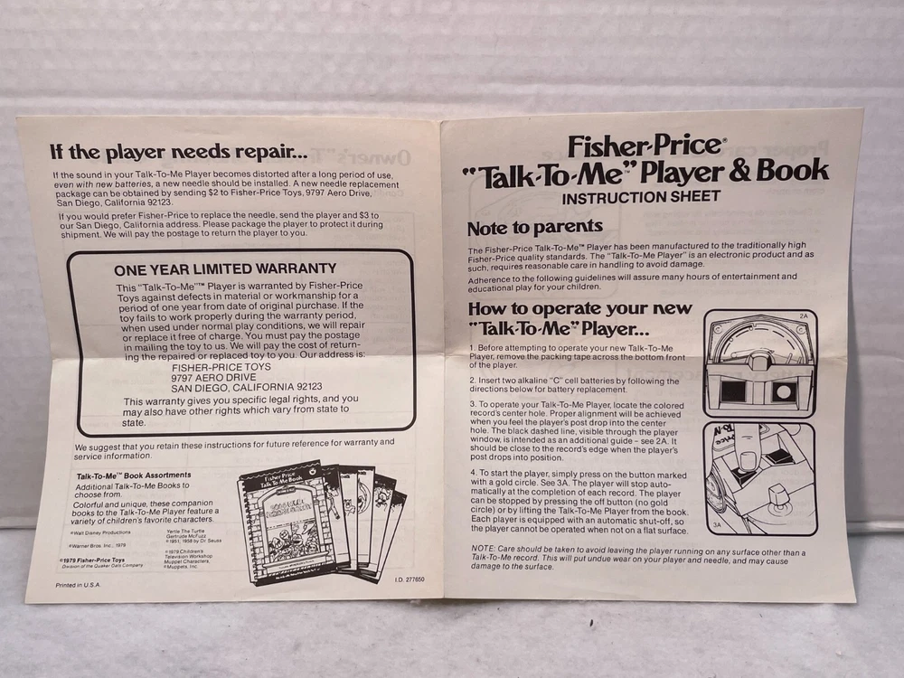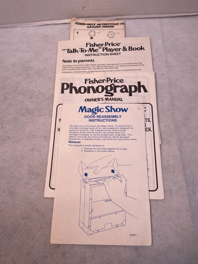 VINTAGE, Fisher-Price, Lot of 3 Owner's Manuals: Phonograph (1979), "Talk to Me" Player & Book (1979) & Ground Shaker (1982), Good Condition