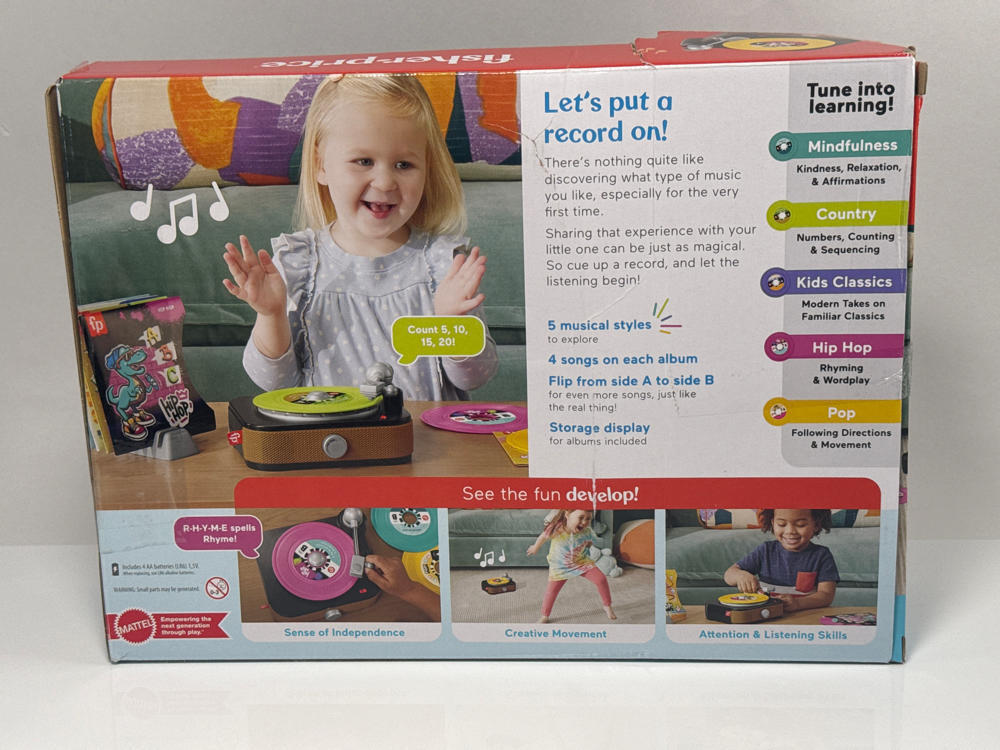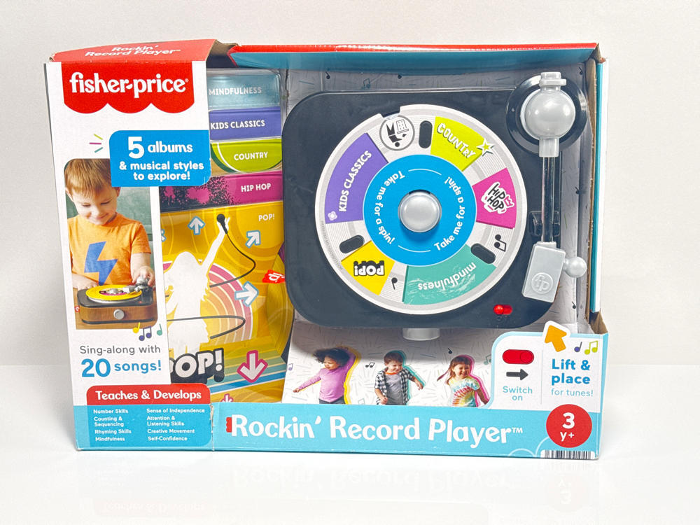 Fisher-Price Musical Toy Rockin’ Record Player for Kids Ages 3+ Year DAMAGED BOX Preschool kids can turn the tables on fun with the Rockin Record Player musical toy from Fisher-Price. Young DJs will love picking out songs to play from the 5 colorful, double-sided records that play 20 unique songs. Just like the real thing, kids can place the players arm and see the record spin on the turntable as it plays! Records come in fun, decorative sleeves that can be stored in the included play rack. (Toy record player does not play real records. Colors and decorations may vary.) Features Toy record player with a rotating turntable lets kids rock out to music in a fun, retro way 20 unique songs in 5 cool musical styles! Choose from Country, Pop, Mindfulness, Kids Classics & Hip-Hop Kids control the play: Place the record arm into the groove to hear songs; use the knob to adjust the volume Includes 1 turntable, 1 display rack, 5 records with decorative sleeves Encourages self-confidence and pretend play for preschool kids ages 3 years & older Smilestones: Bringing a smile to milestones! This toy fosters Independence by letting kids customize their listening experience & encouraging self-regulation through open-ended play Details Fast Shipping We get your order shipped out within 1-business day and delivered to your doorstep as quickly as possible. Competitive Pricing With our dynamic pricing model, our prices are always competitive. Our prices are some of the lowest that you will find on the internet. Rest assured that you're getting a good deal when purchasing with us. 30-day Money Back Guarantee We are committed to making sure that you leave this transaction satisfied. If you're unhappy with the product for any reason, you may return it back for your money-back or a replacement within 30 days. No questions asked!