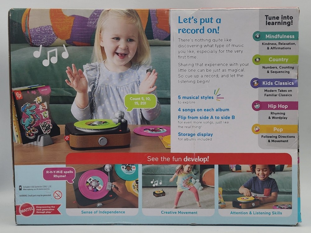 The Fisher-Price ROCKIN’ RECORD PLAYER Musical Toy is a new in box toy that includes a turntable, five musical records with sleeves, and a stand. Designed for children ages 3 and up, this interactive toy allows kids to play and create their own musical recordings. With the trusted Fisher-Price brand and high-quality components, this musical toy is sure to provide hours of imaginative play and learning opportunities for young children. Made in China, this 2023 release is a great addition to any preschooler's toy collection.
