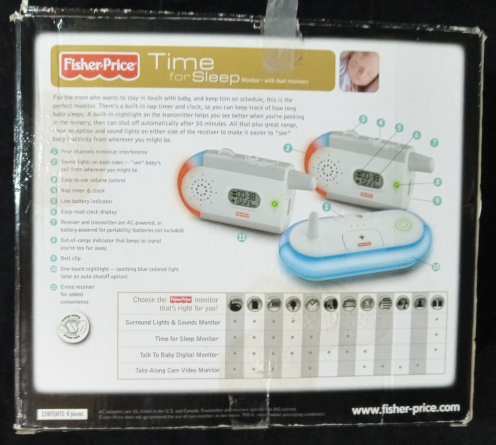 Fisher-Price Time for Sleep Monitor with Dual receivers Monitor makes it easy for mom to monitor and keep track of baby's naps with the digital nap timer and clock 900' range and 4 channels Monitor has a night light with time out feature Sounds lights are on both sides of the receiver so mom and can 'see' sounds even when out of earshot, includes 2 monitors Includes a convenient second receiver for another room in the house