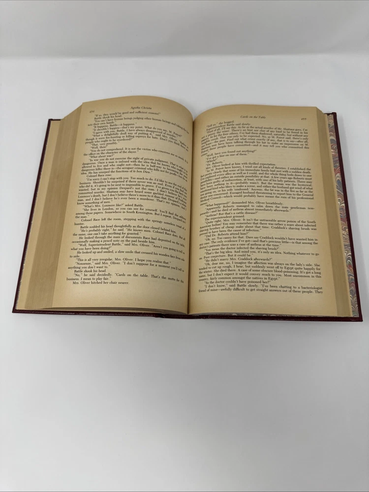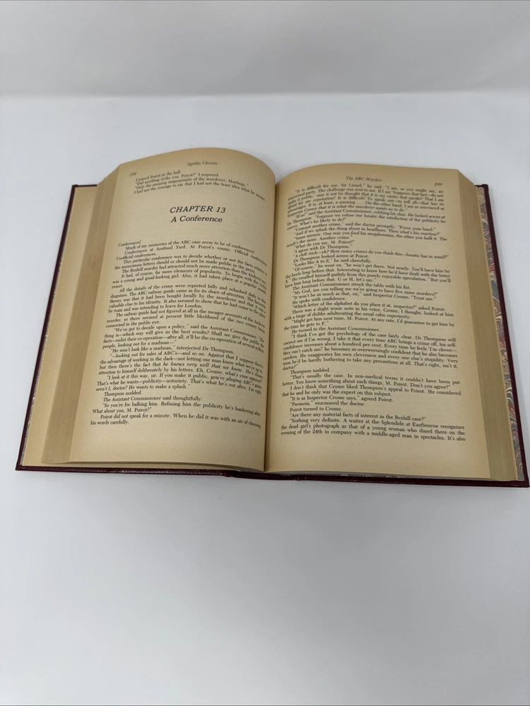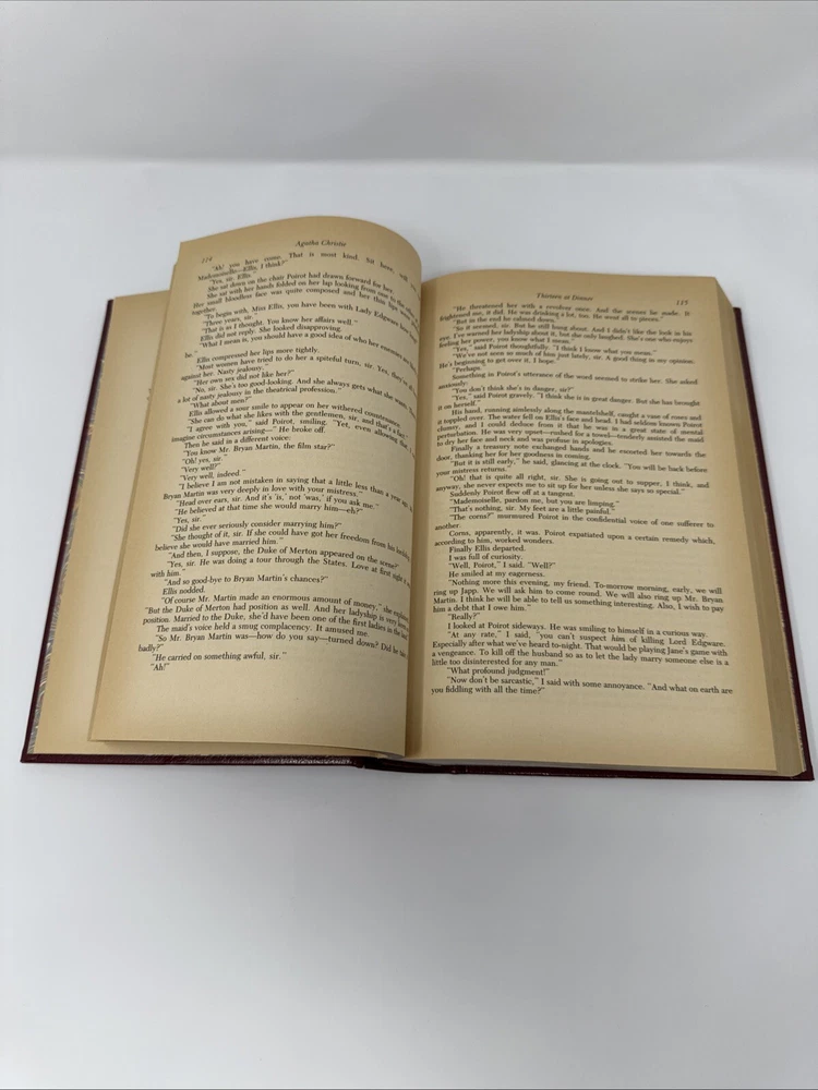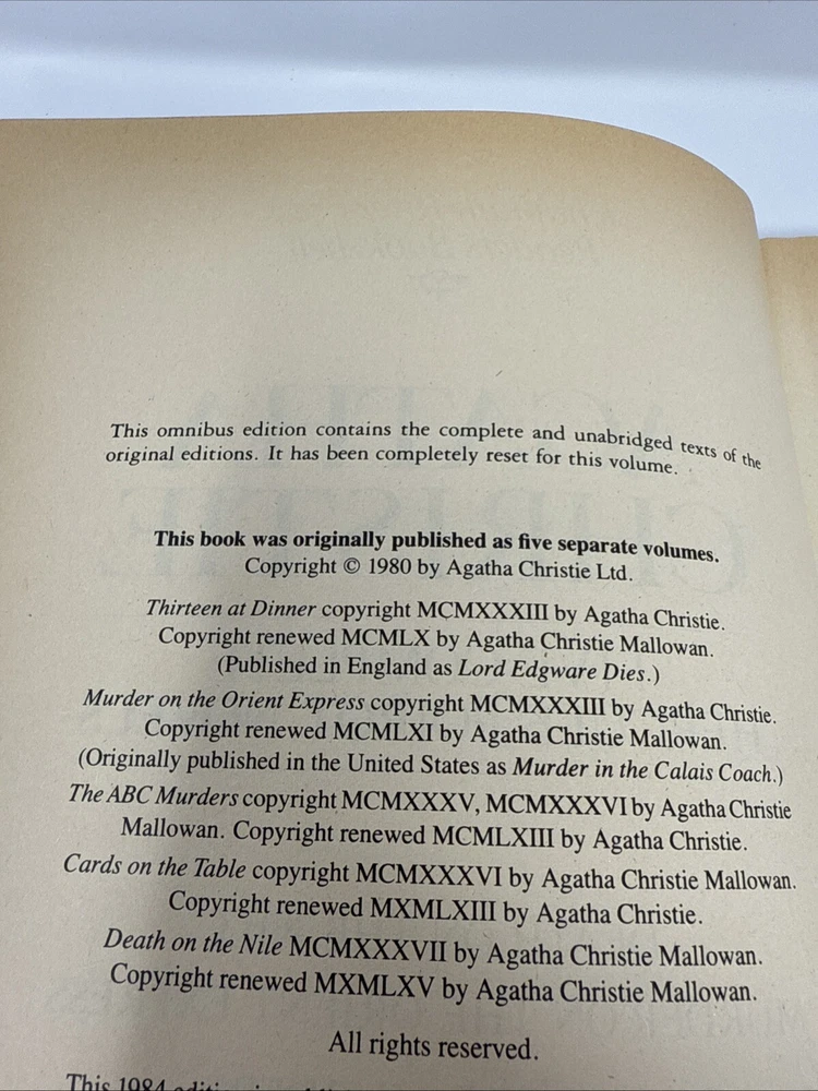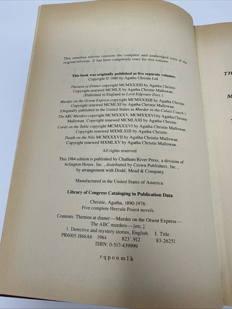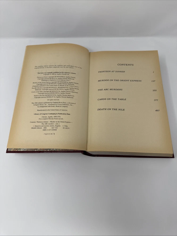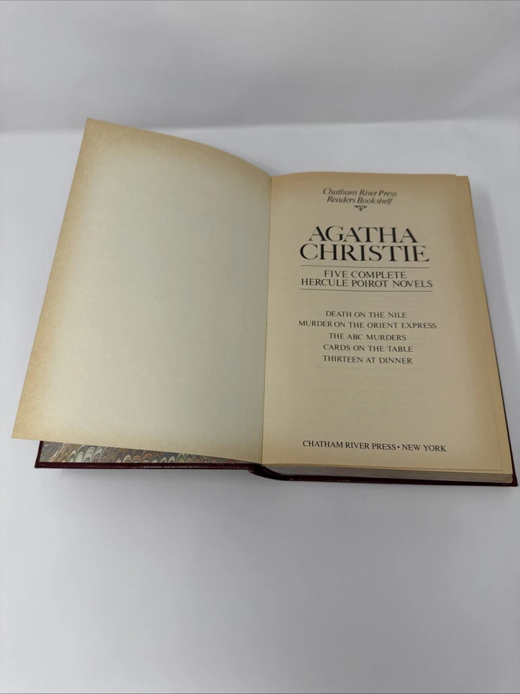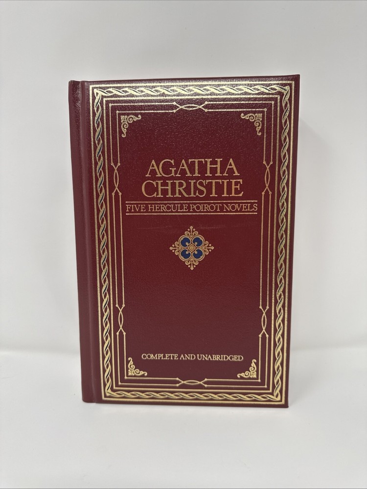 The product is a limited edition, vintage anthology of five Hercule Poirot novels by Agatha Christie, published in 1984 by Chatham River Press. The hardcover book features gilt page blocks, genuine bonded leather, and includes complete and unabridged versions of the novels. It is part of the Hercule Poirot Detective Series and is intended for adult readers. The anthology contains mystery and detective fiction, making it a valuable addition for fans of Agatha Christie's work. Please refer to pics for condition.