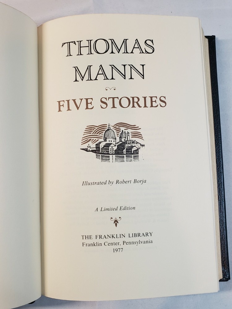 Five Stories by Thomas Mann Franklin Library Limited Edition 1977 Item: Title: Five Stories Author: Thomas Mann Publisher: Franklin LIbrary Publication Year: 1977 Format: Hardcover Condition: There is a minor scuff on the top of the front cover. Everything else is in perfect condition. Please see pictures for more details. If you have questions or concerns feel free to message me and I will try to get back to you the same day. Shipping Details: Shipping is a flat price $4 via USPS media mail . I like to use boxes for all my book shipping in order to prevent damage. My handling time is typically 1-3 days. If you need a faster shipping method I suggest upgrading to priority mail. Return Policy: I do not accept returns but if there is a problem please contact me and I will work with you to resolve it. I will offer refunds if the situation warrants it.