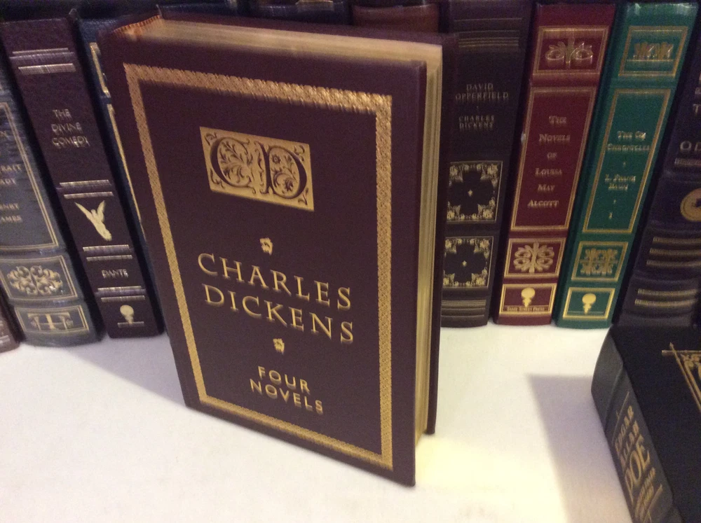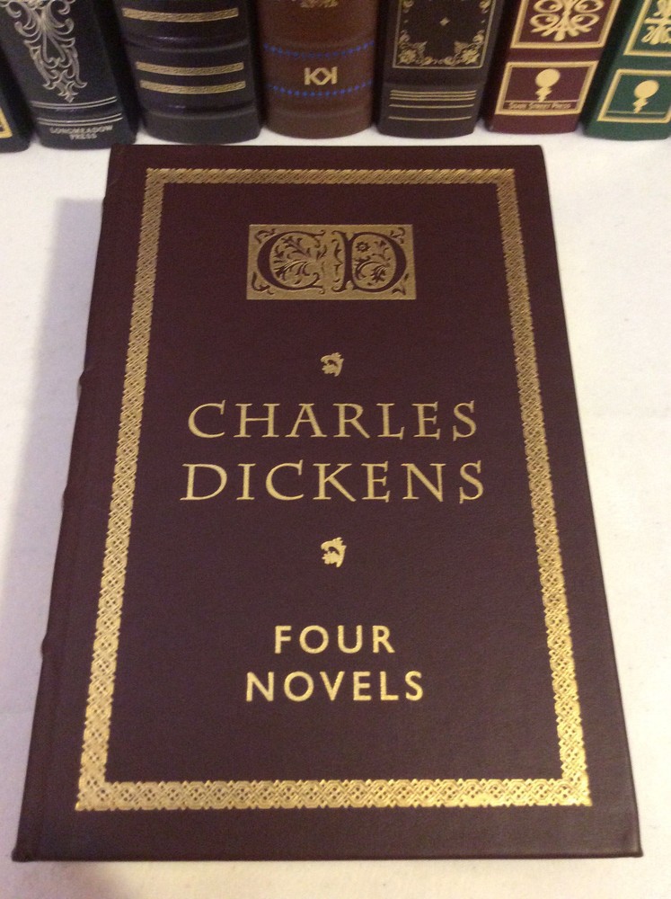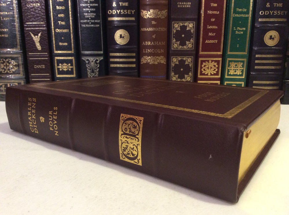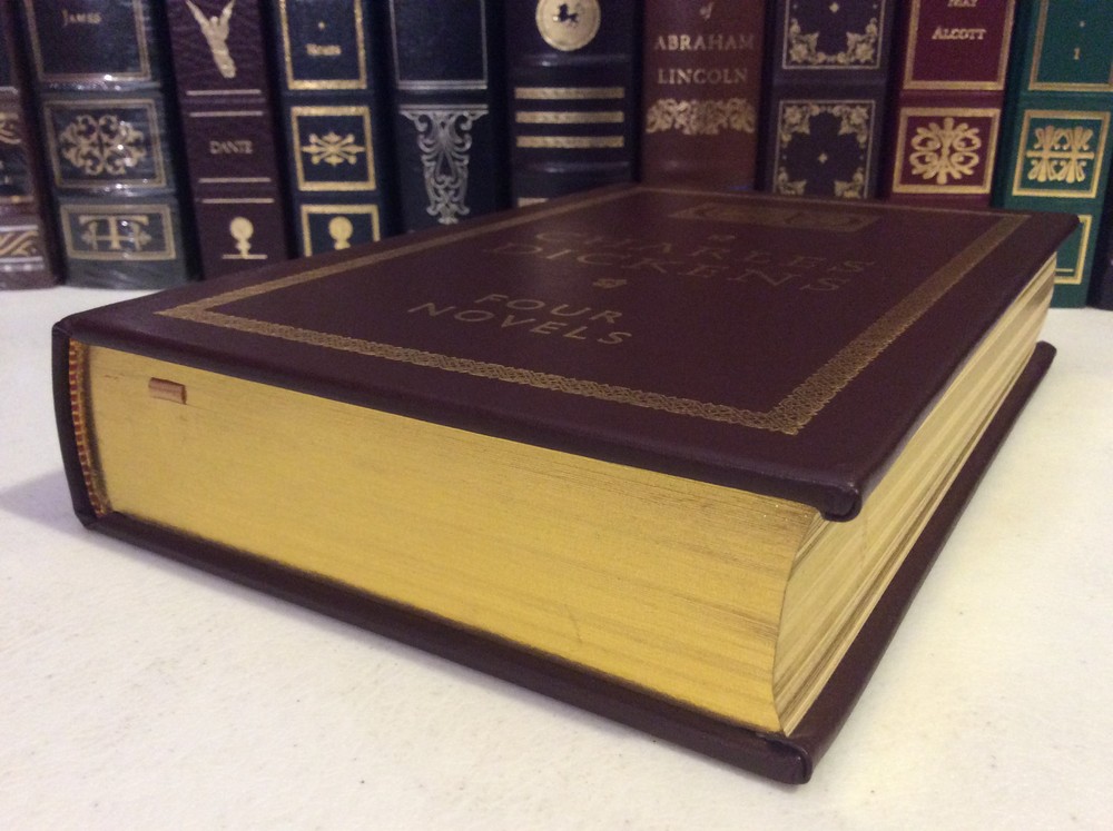 Four Novels of Charles Dickens bound in leather, with gold accents, gilt-edged pages, and a ribbon marker. Oliver Twist A Tale of Two Cities Great Expectations A Christmas Carol Item Condition: This book is in Very Good condition, with no names or bookplates inside. The gilt-edging on the pages is bright, and there is little wear to the leather. The pages are clean and the binding is tight. Dimensions are approx: 9.5" x 6.25" x 1.75" This book will ship in a box, with bubble wrap. Photos are of the actual book that will be shipped.