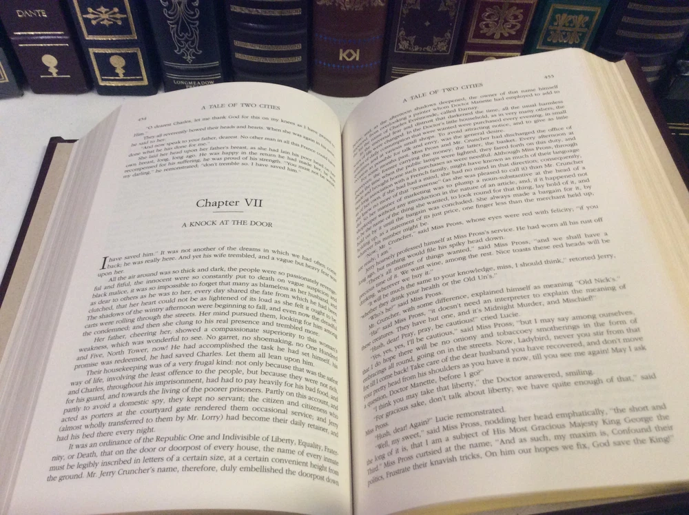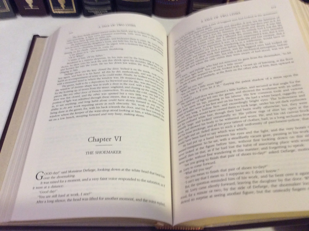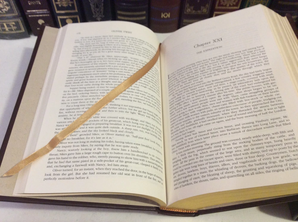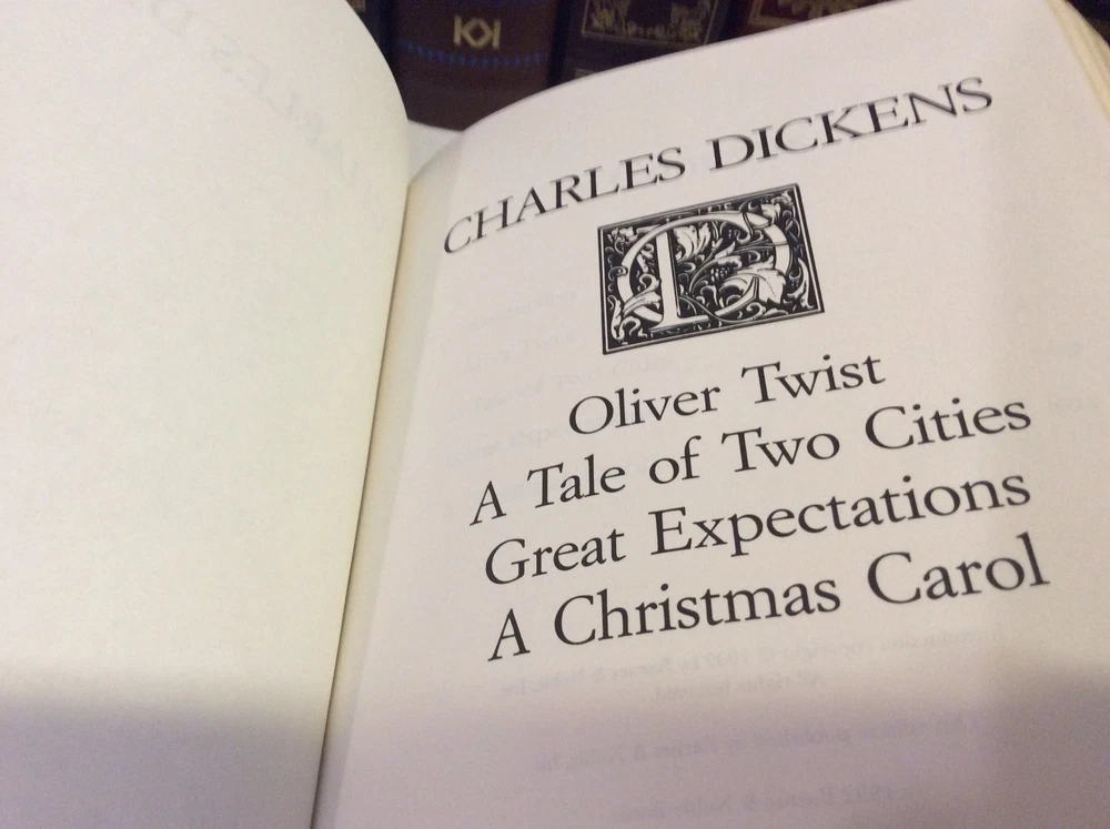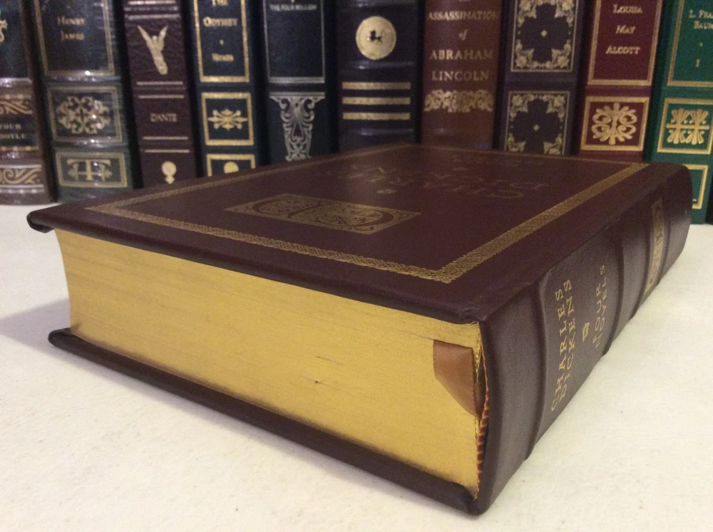Four Novels of Charles Dickens bound in leather, with gold accents, gilt-edged pages, and a ribbon marker. Oliver Twist A Tale of Two Cities Great Expectations A Christmas Carol Item Condition: This book is in Very Good condition, with no names or bookplates inside. The gilt-edging on the pages is bright, and there is little wear to the leather. The pages are clean and the binding is tight. Dimensions are approx: 9.5" x 6.25" x 1.75" This book will ship in a box, with bubble wrap. Photos are of the actual book that will be shipped.