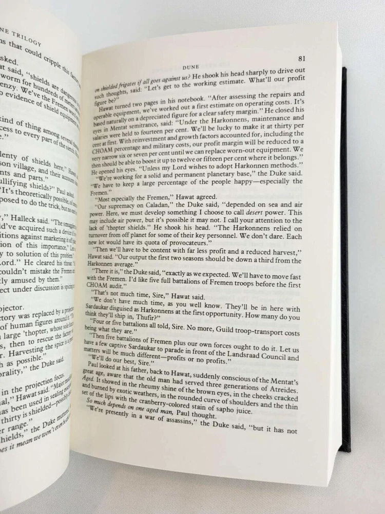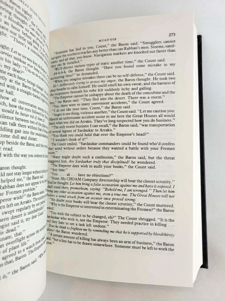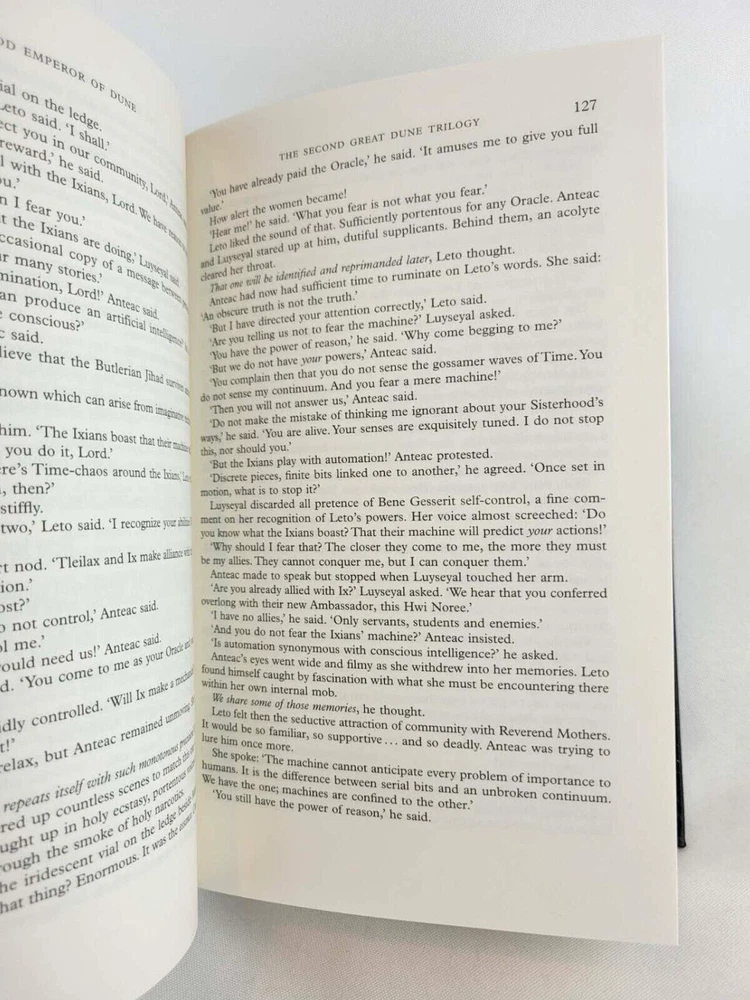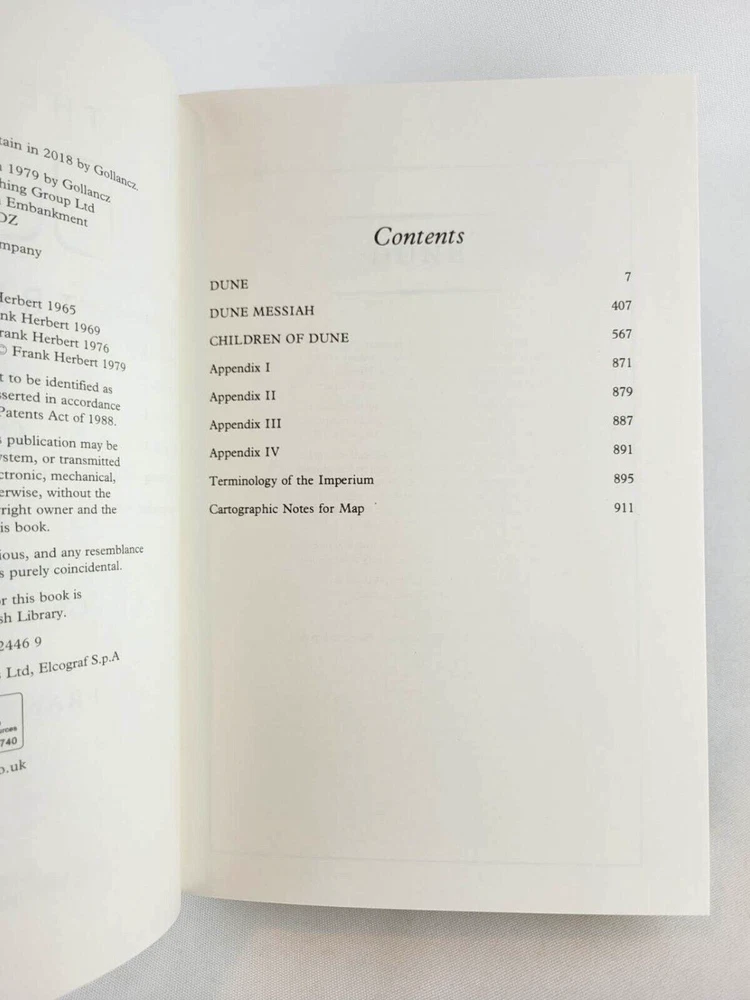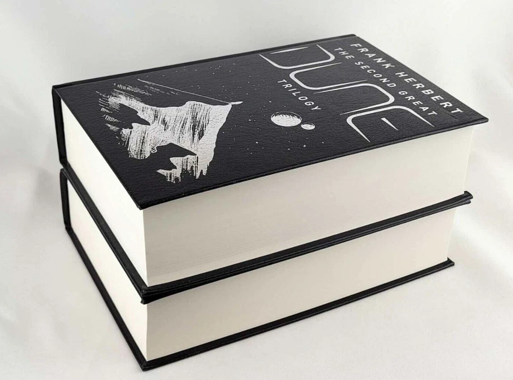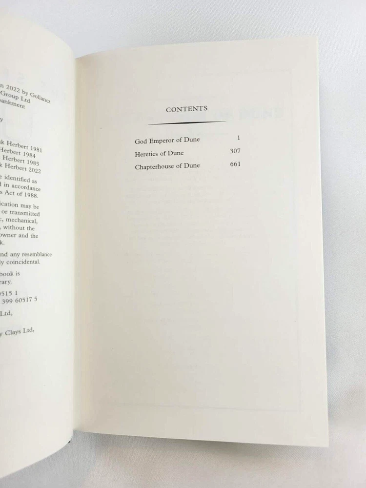 Publisher : Victor Gollancz Ltd & Orion Dimensions : 6.14 x 4.93 x 9.45 inches Total Weight: 6.2 lb Please read!!! Legitimate editions to be distributed in the US. High quality paper and printing. Gift condition. You will get exactly shown in the pictures. Three of the greatest SF novels in the world in one bumper omnibus 'An astonishing science fiction phenomenon' WASHINGTON POST Herbert's evocative, epic tales are set on the desert planet Arrakis, the focus for a complex political and military struggle with galaxy-wide repercussions. Arrakis is the source of spice, a mind-enhancing drug which makes interstellar travel possible; it is the most valuable substance in the galaxy. When Duke Atreides and his family take up court there, they fall into a trap set by the Duke's bitter rival, Baron Harkonnen. The Duke is poisoned, but his wife and her son Paul escape to the vast and arid deserts of Arrakis, which have given the planet its nickname of Dune. Paul and his mother join the Fremen, the Arrakis natives, who have learnt to live in this harsh and complex ecosystem. But learning to survive is not enough - Paul's destiny was mapped out long ago and his mother is committed to seeing it fulfilled. The Second Great Dune Trilogy contains God Emperor of Dune, Heretics of Dune and Chapter House Dune, and concludes the Dune Chronicles, one of the most influential SF series ever written. Herbert's evocative, epic tales are set on the desert planet Arrakis, the focus for a complex political and military struggle with galaxy-wide repercussions. More than three thousand years have passed since the first events recorded in Dune. Only one link survives with those tumultuous times: the grotesque figure of Leto Atreides, son of the prophet Paul Muad'Dib, and now the virtually immortal God Emperor of Dune. He alone understands the future, and he knows with a terrible certainty that the evolution of his race is at an end unless he can breed new qualities into his species. But to achieve his final victory, Leto Atreides must also bring about his own downfall...
