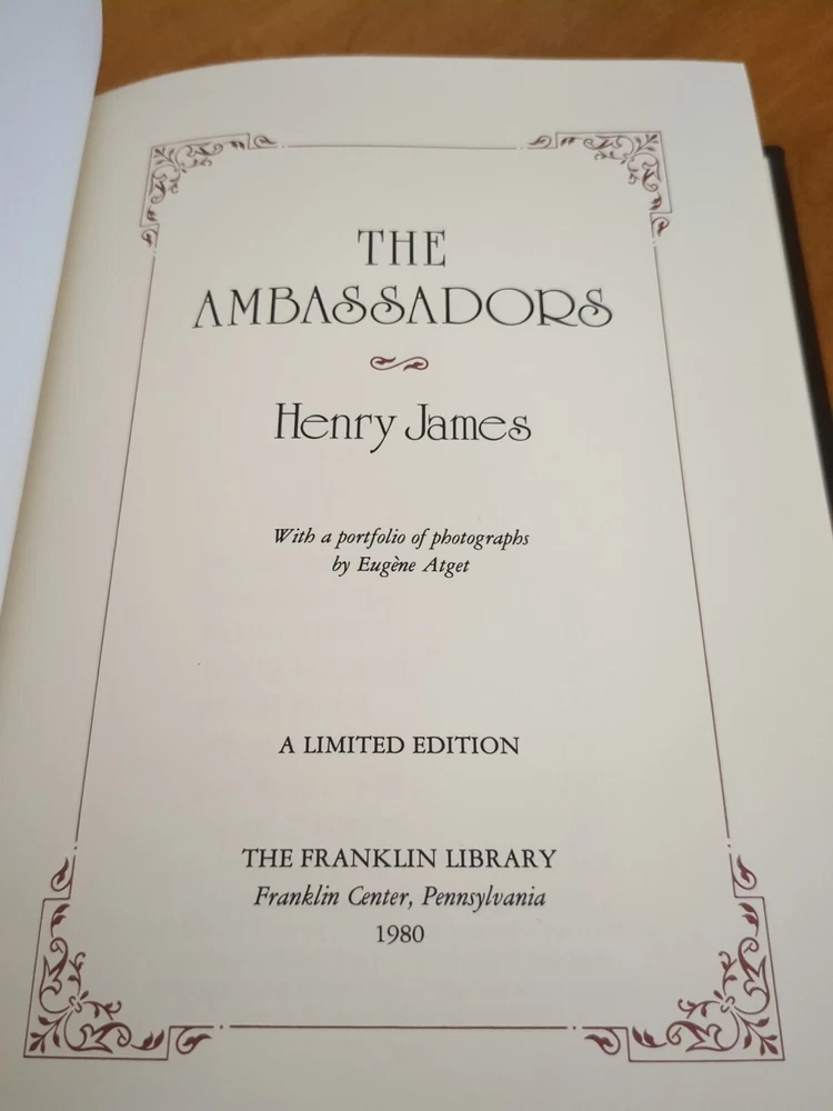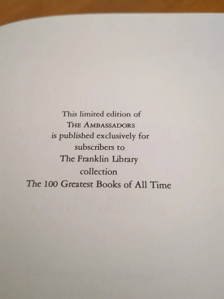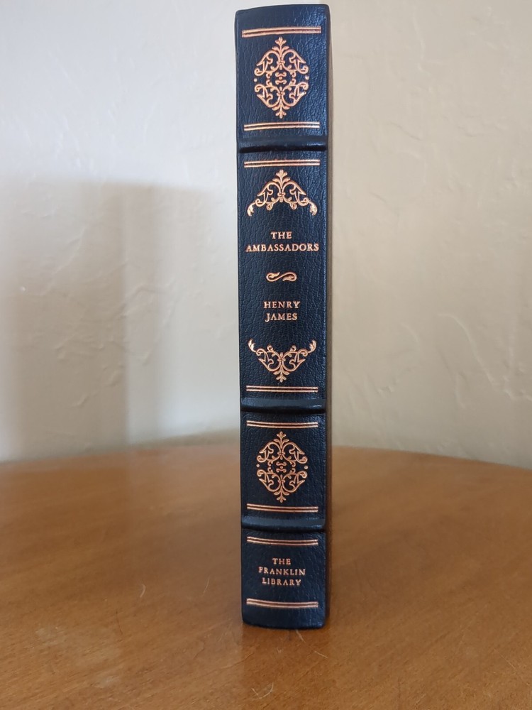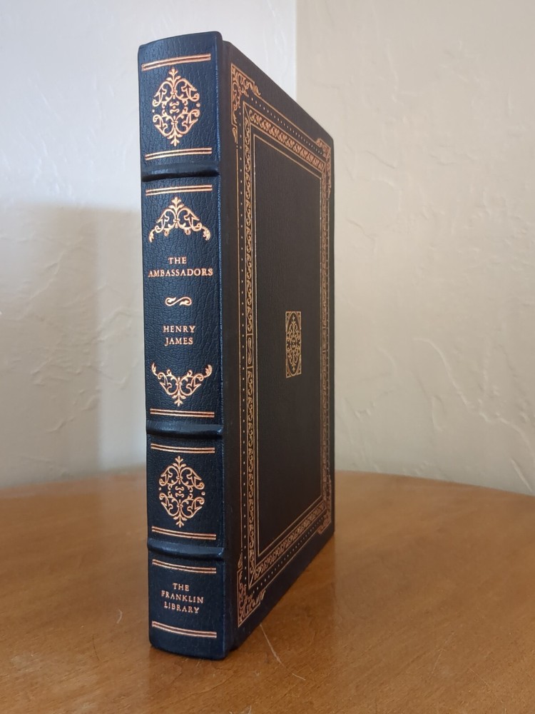 Franklin Library's The Ambassadors by Henry James for The 100 Greatest Books of All Time series. Full leather bound with 22kt gold gilt page ends, silk moire end pages and silk marker ribbon. Book shows very minor imperfections on the gold gilt page ends but otherwise is in very good condition. See pictures for details. No nameplates or writing evident.