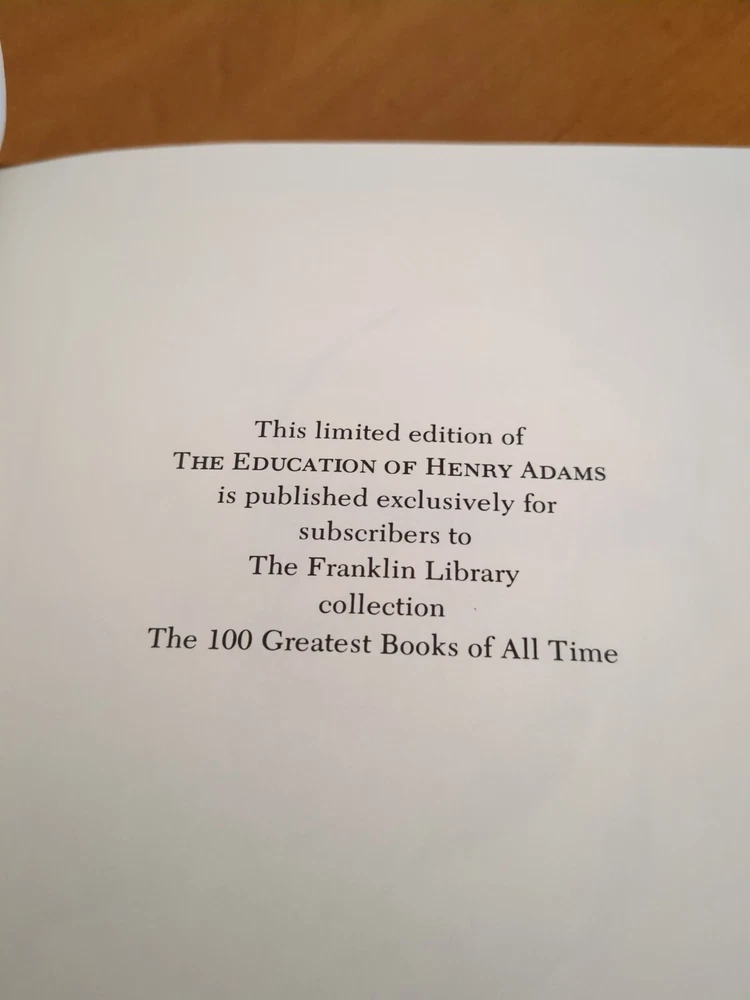 Franklin Library's The Education of Henry Adams by Henry Adams for The 100 Greatest Books of All Time series. Full leather bound with 22kt gold gilt page ends, silk moire end pages and silk marker ribbon. Book s in very good condition. See pictures for details. No nameplates or writing evident.