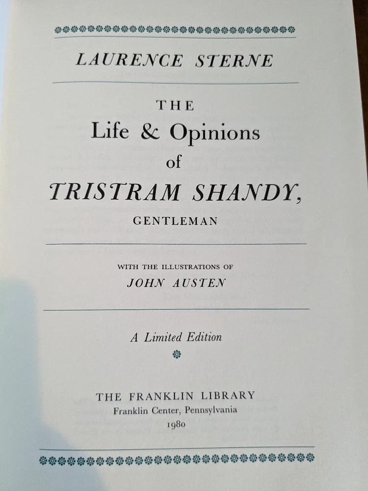 Tristram Shandy by Laurence Sterne for Franklin Library's 100 Greatest Books Ever Written. Full leather bound with gold gilt page ends, silk moire end pages and silk marker. Book is in excellent condition, light pencil mark on second page that could be carefully erased. See pictures for details.