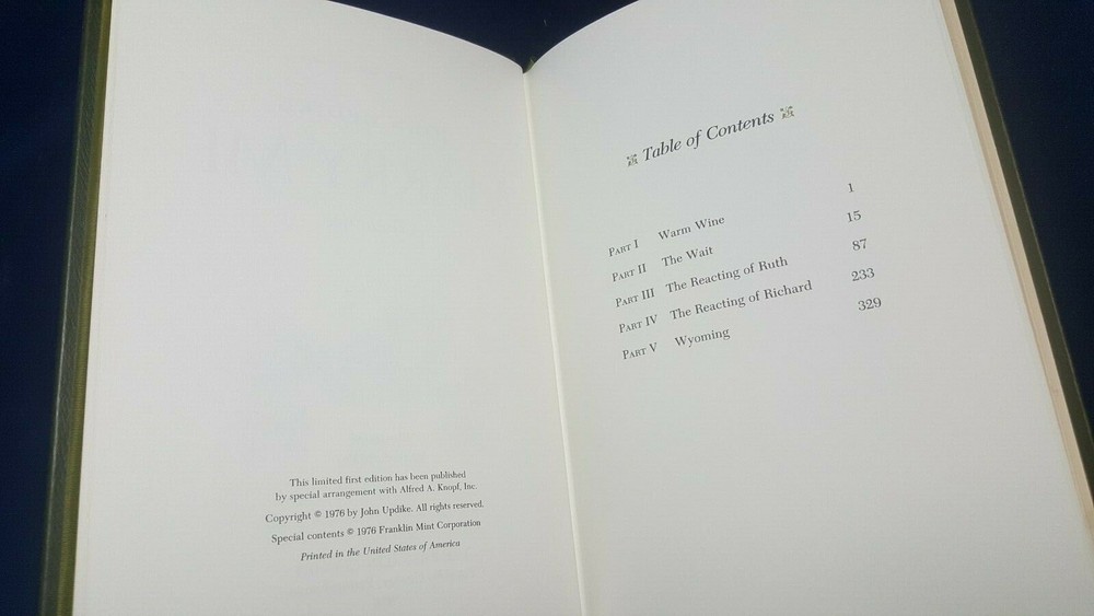 For sale is a fabulous hardback book from the Franklin Library First Edition Leather Cover Series, from the estate of a local collector. This 1976 hardback features Marry Me by John Updike. It has a classy green cover with gold trim and the pages have gold edging. This book is in LN condition and has been barely opened. There is not a mark in it, not even a former owner name or nameplate. It looks new. It will be packaged carefully, and the shipping weight is 3 pounds. Please ask questions before bidding so that I can insure you know exactly what you are bidding on. Because I offer multiple pictures and detailed descriptions and prompt reply to questions, I do not offer a standing refund option. However, if I made a mistake (I am human), or you have a concern, please contact me, and I will do everything reasonably possible to make it right, and my feedback reflects that. I want both us to come out winners here. You can expect the items I sell to be smoke-free, unless I specifically state otherwise. At your request, I will be happy to create a combined shipping invoice on multiple purchases, subject to size/weight restrictions or any other eBay policy limitations. However, eBay's Global Shipping Program may limit combined shipping for international buyers. Also, I am not ever able to provide international returns. As of 2019, many U.S. states have begun to require that eBay sellers charge sales tax on purchases made from residents of their state. If your state requires a sales tax payment, that tax payment will show up on your invoice for final payment. I'm sorry about this added cost, but it is a requirement of your state and not a cent goes to me. Payment for purchases are expected within 3 days of auction end. Have fun.