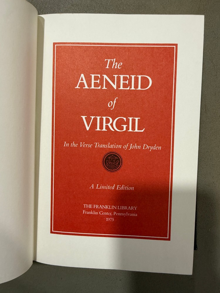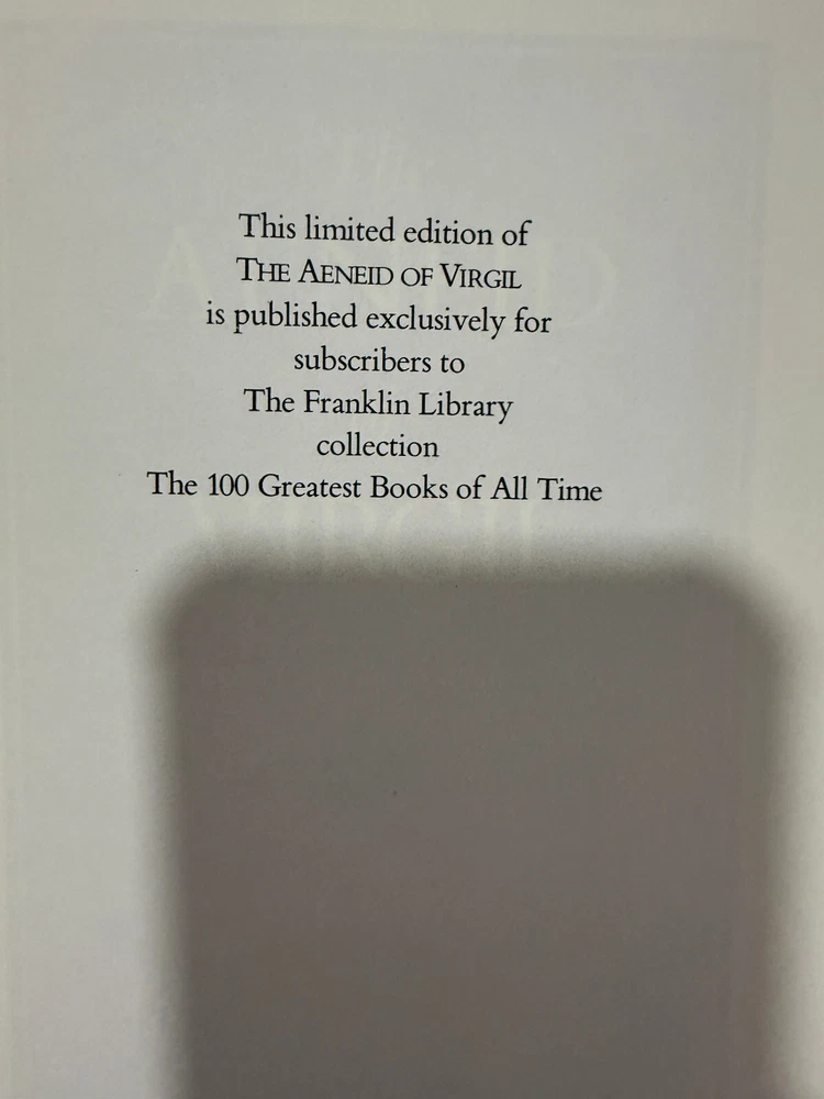Aeneid - Virgil Franklin Library 100 Greatest Books Series Very Good Plus Condition ! New Books get listed daily !!! 100s of Easton Press and Franklin Library books available!! All books get cleaned with a leather cleaner to remove any dust, odor and restore the beauty of leather!! Combined Shipping Discount: USA buyers - every book $1 off International combined shipping: 1 or 2 books - $45 3 or 4 books - $75 5 + books $17 per book 10+ books $13 per book WE SHIP DAILY!! RETURNS: Hassle-Free 30-days return policy and we pay for a return !! Check our Inventory (Link to eBay Store): http://stores.ebay.com/EastonFranklinBooks