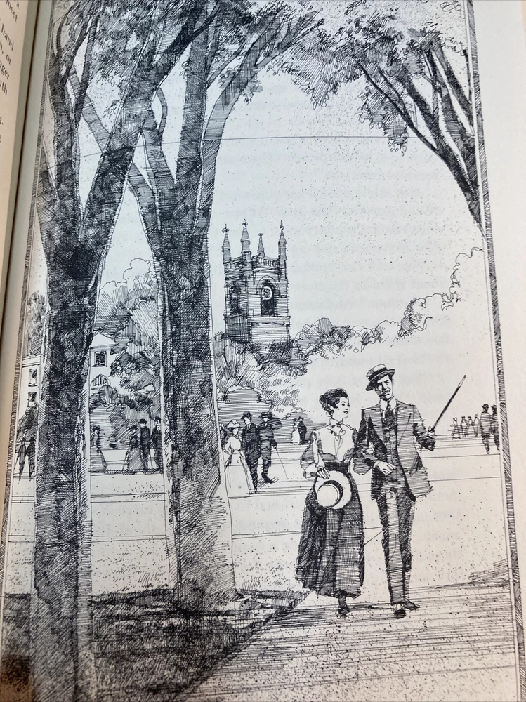 Franklin Library leather edition of Booth Tarkington's "The Magnificent Ambersons," a Limited edition, Illustrated by Roy Andersen, one of the PULITZER PRIZE series, published in 1977. Bound in deep green leather, the book has matching moire silk end leaves, acid-free paper, hubbed spine, satin book marker, gold gilt on three edges---in Very Good/near FINE condition---except for an inch-long scuff on bottom board near spine. [See Photo.] The novel is set in a largely-fictionalized version of Indianapolis and traces the growth of the U.S. through the declining fortunes of three generations of the aristocratic Amberson family in an upper-scale Indianapolis neighborhood between the end of the Civil War and the early 20th century, a period of rapid industrialization and socioeconomic change in America. The decline of the Ambersons is contrasted with the rising fortunes of industrial tycoons and other new money families, which derive power not from family names but by "doing things." The titular family is the most prosperous and powerful in town at the turn of the century. The young George Amberson Minafer, the patriarch's grandson, is spoiled terribly by his mother, Isabel. Growing up arrogant, sure of his own worth and position, and totally oblivious to the lives of others, George falls in love with Lucy Morgan, a young but sensible debutante. However, there is a long history between George's mother and Lucy's father of which George is unaware. As the town grows into a city, industry thrives; the Ambersons' prestige and wealth wanes; and the Morgans, thanks to Lucy's prescient father, grow prosperous. When George sabotages his widowed mother's growing affections for Lucy's father, life as he knows it comes to an end. " The Magnificent Ambersons" received the 1919 Pulitzer Prize. 298 pages. I offer combined shipping.