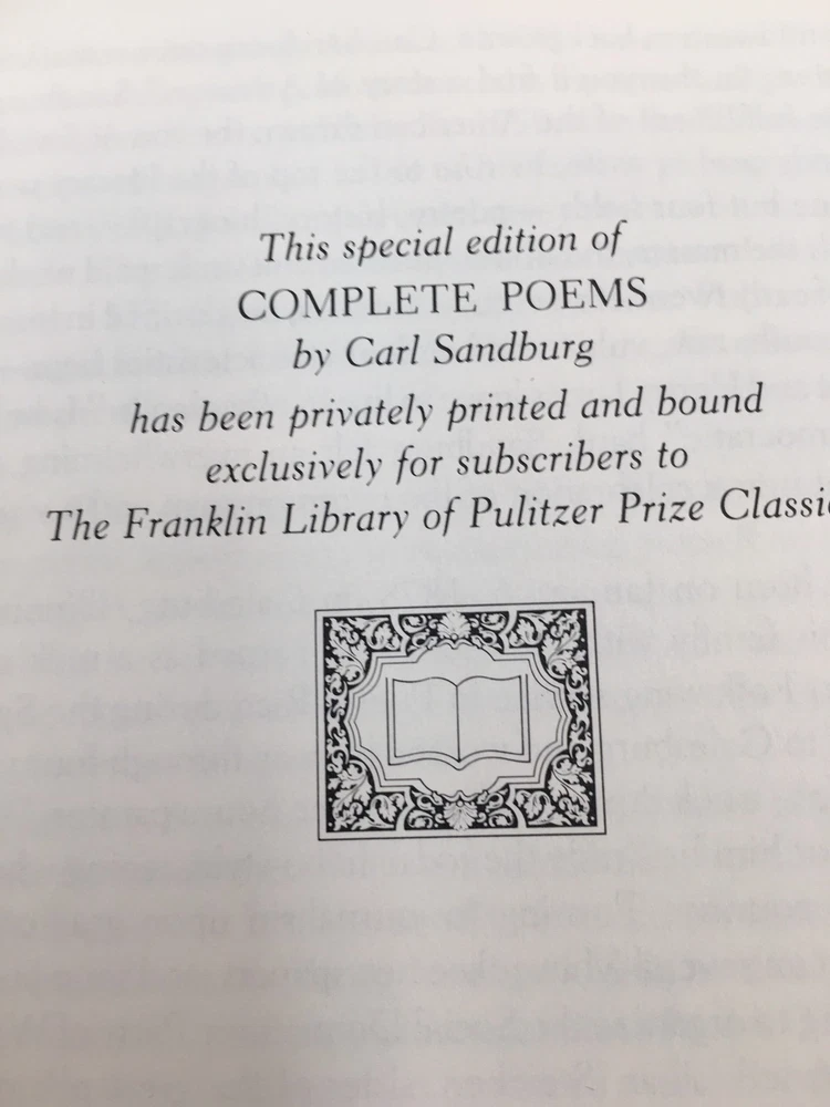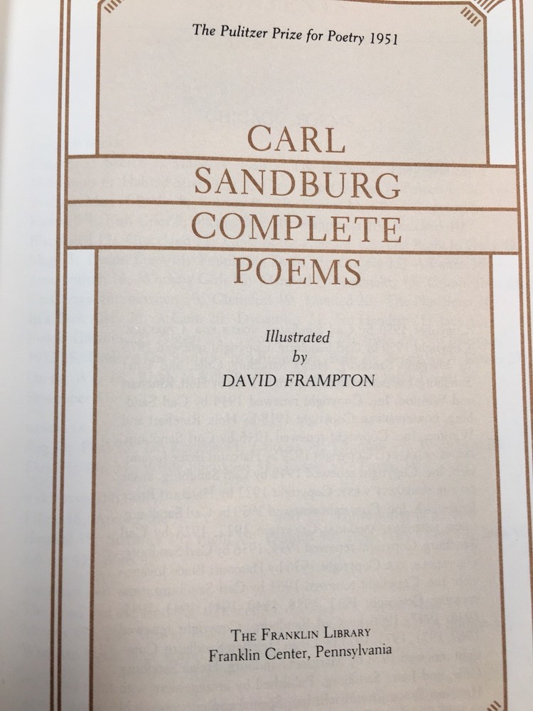 Franklin Library leather edition of Carl Sandburg's "Complete Poems," Illustrated by David Frampton, one of the PULITZER PRIZE CLASSICS series, published in 1985. Bound in a brown leather, the book has marbled paper end leaves, hubbed spine, gold gilding on three edges, acid-free paper, Symth-sewn binding, a satin book marker---in near FINE condition. Carl August Sandburg, who lived from 1878 – 1967, was an American poet, writer, and editor. He won three PULITZER PRIZES: two for his poetry and one for his biography of ABRAHAM LINCOLN. During his lifetime, Sandburg was widely regarded as "a major figure in contemporary literature," especially for volumes of his collected verse, including Chicago Poems (1916), Cornhuskers (1918), and Smoke and Steel (1920). He enjoyed "unrivaled appeal as a poet in his day, perhaps because the breadth of his experiences connected him with so many strands of American life", and at his death in 1967, President Lyndon B. Johnson observed that "Carl Sandburg was more than the voice of America, more than the poet of its strength and genius. He was America." Sandburg was born in Galesburg, Illinois, to parents who were of Swedish ancestry. At the age of thirteen he left school and began driving a milk wagon. From the age of about fourteen until he was seventeen or eighteen, he worked as a porter at the Union Hotel barbershop in Galesburg. He then became a bricklayer and a farm laborer on the wheat plains of Kansas. After an interval spent at LOMBARD COLLEGE in Galesburg, he became a hotel servant in Denver, then a coal-heaver in Omaha. He began his writing career as a journalist for the Chicago Daily News. Later he wrote poetry, history, biographies, novels, children's literature, and film reviews. Sandburg spent most of his life in the Midwest before moving in 1945 to Flat Rock, North Carolina where he and his wife, LILIAN STEICHEN, lived on a 246-acre farm where they raised three daughters and grew goats and chickens. This volumes includes: the CHICAGO POEMS, CORNHUSKERS, SMOKE AND STEEL, SLABS OF THE SUNBURNT WEST, GOOD MORNING, AMERICA, THE PEOPLE YES, and NEW SECTION. 697 pages. I offer Combined shipping.