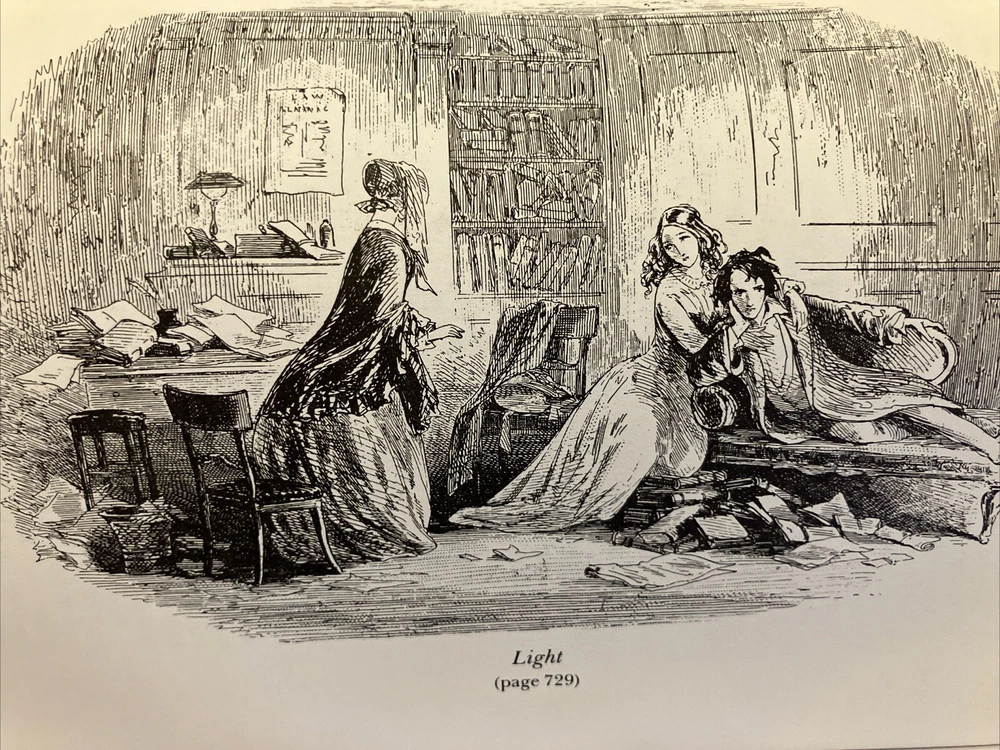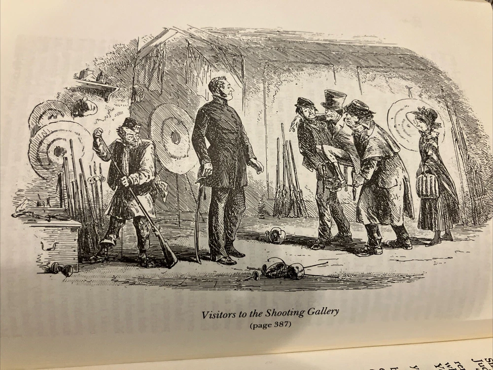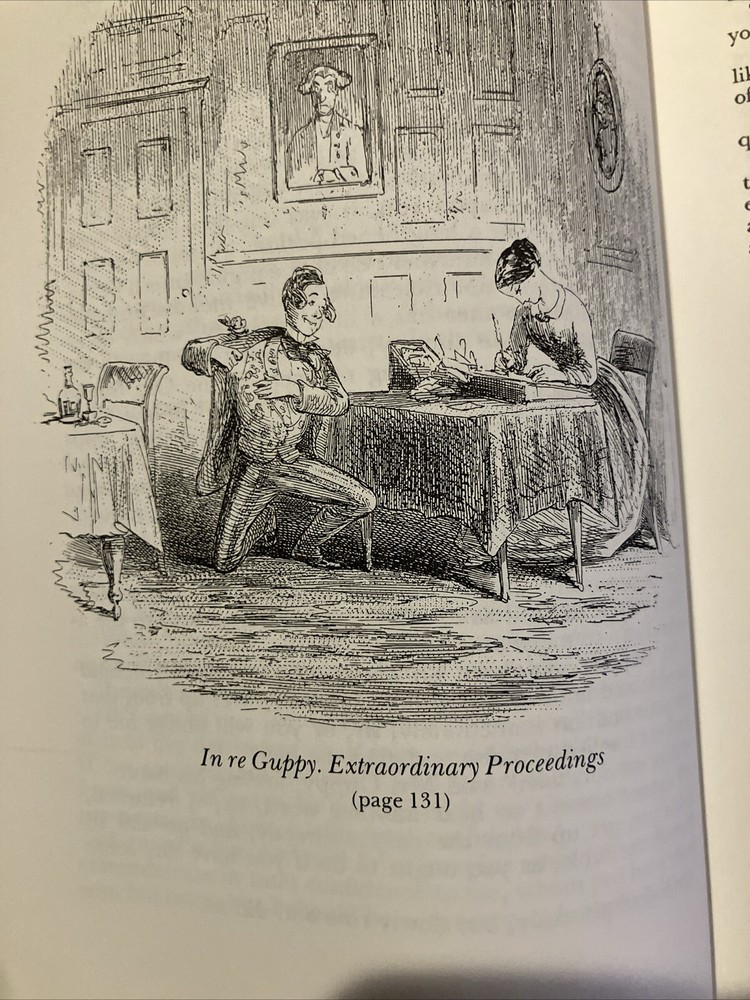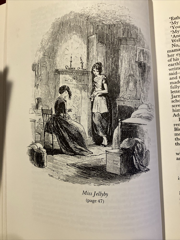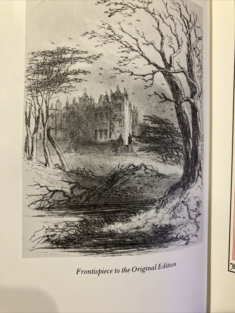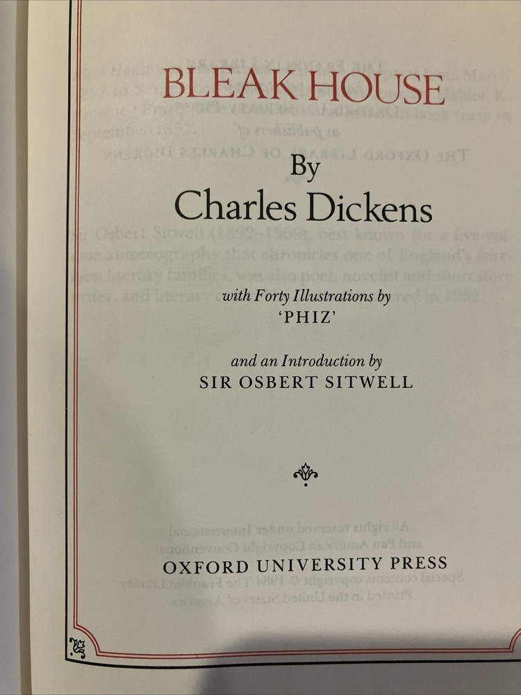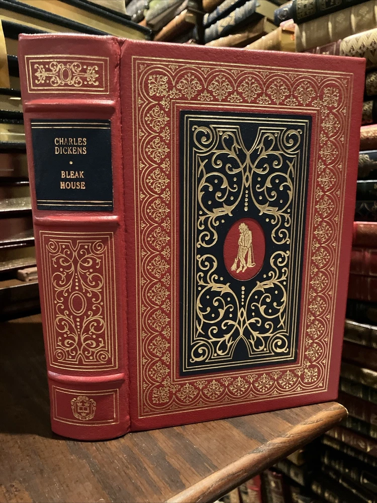 Franklin Library leather edition of Charles Dickens's "Bleak House," a Limited edition, introduced by Sir Osbert Sitwell, Forty Illustrations by Phiz, one of the OXFORD LIBRARY OF CHARLES DICKENS series, published in 1984. Bound in scarlet red leather, the book has matching French moire silk end leaves, gold tooling around the moire silk end leaves, satin book marker, hubbed spine, gold gilding on three edges---in near FINE condition. Charles Dickens, who lived from 1812-1870, was born near PORTSMOUTH, England but his family moved to LONDON when he was two years old. "Bleak House" was originally published as a 20-episode series. The opening scene of the novel is set in London, at Christmas time. "As much mud in the streets, as if the waters had but newly retired from the face of the earth. . .Dogs, undistinguishable in mire. Horses, scarcely better' splashed to their very blinkers. Foot passengers, jostling one another's umbrellas, in a general infection of ill-temper, and losing their foot-hold at street corners, where tens of thousands of other foot passengers have been slipping and slidng since the day broke. . ." The novel has many characters and several subplots and is told partly by Esther Summerson, and partly by an omniscient narrator. The book contains a vigorous satire on the abuses of the old court of Chancery, the delays and costs of which brought misery and ruin on its suitors. The tale centers on the fortunes of an uninteresting couplke, RICHARD CARSTONE, a futile youth, and his amiable cousin, ADA CLARA, wards of the court. The pompous old baronet, Sir Leicester Dedlock is devotedly attached to his beautiful wife, Lady Dedlock. Before her marriage, she has loved Captain Hawdow and has become the mother of a daughter, whom she believes is dead. Miss Barbary, who raises Esther tells Esther, "Your mother is your disgrace, and you were hers." After Miss Barbary dies, the Chancery lawyer Kenge takes charge of Esther 's future. He also assumes custody of two other wards, Richard Carstone and Ada Clara. When Ada goes to live with John Jarndyce, she is accompanied by Esther Summerson, a supposed orphan, and one of Dickens' saints. Ultimately, Lady Dedlock discovers that Esther is her own child. The case of Jarndyce and Jardyce was suggested by the celebrated proceedings arising from the intestacy of one William Jennings, who died in 1798, leaving property at Birmingham worth many millions. 921 pages---a RARE title. I offer combined shipping.
