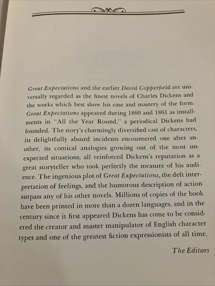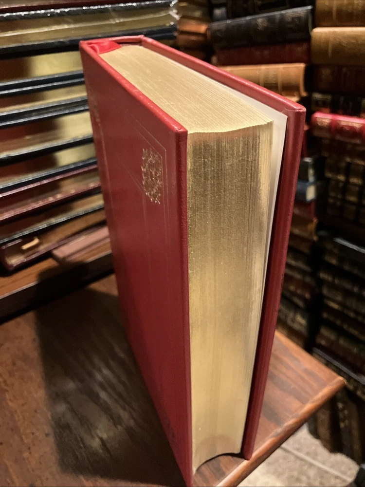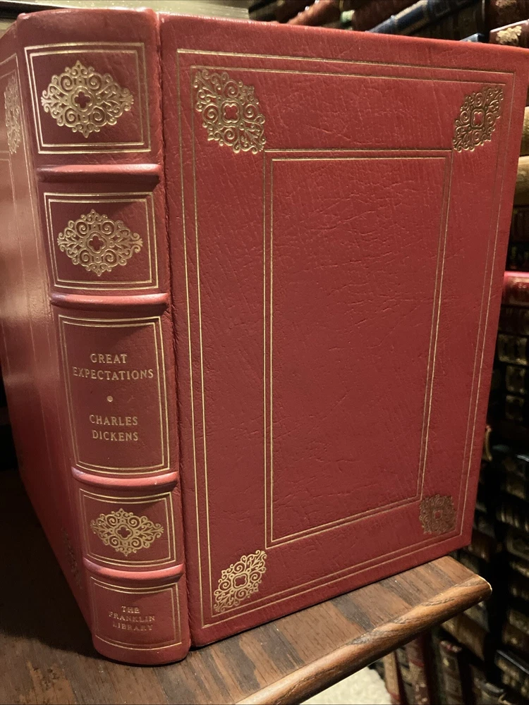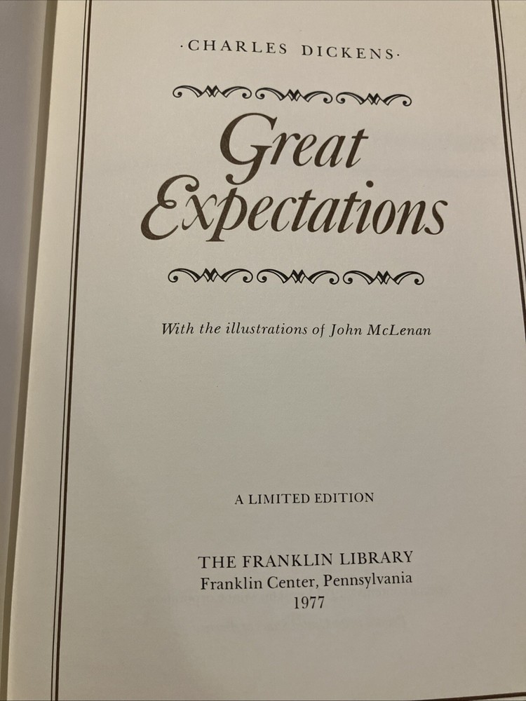 Franklin Library leather edition of Charles Dickens's "Great Expectations," a LIMITED edition, Illustrations by John McLenan, a Limited edition, one of the COLLECTOR'S LIBRARY OF THE WORLD'S BEST-LOVED BOOKS series, published in 1977. Bound in brick red leather, the book has scarlet red moire silk end leaves, satin book marker, hubbed spine, gold gilding on three edges---in FINE condition. Charles Dickens, who lived from 1812-1870, was born near PORTSMOUTH, England but his family moved to LONDON when he was two years old. "Great Expectations" was originally published in 1860 and is the story of Philip Pirrip, commonly known as "Pip," a village boy brought up by his termagant sister, the wife of the gentle, humorous, kindly blacksmith Joe Gargery. Pip is introduced to the house of MISS HAVISHAM, a lady half-crazed by the desertion of her lover on her bridal night, who, in a spirit of revenge, has brought up the girl ESTELLA to use her beauty as a means of torturing men. Pip falls in love with Estella, and aspires to become a gentleman. Money and expectations of more wealth come to him from a mysterious source, which he believes to be Miss Havisham. Pip goes to London, and in his new mode of life meanly abandons the devoted Joe Gargery. His unknown benefactor proves to be an escaped convict, ABEL MAGWITCH, to whom he as a boy had rendered a service. . . The story's charmingly diversified cast of characters, its delightfully absurd incidents encountered one after another, all reinforce Dickens reputation as a great storyteller. 553 pages---a GORGEOUS book! I offer combined shipping.