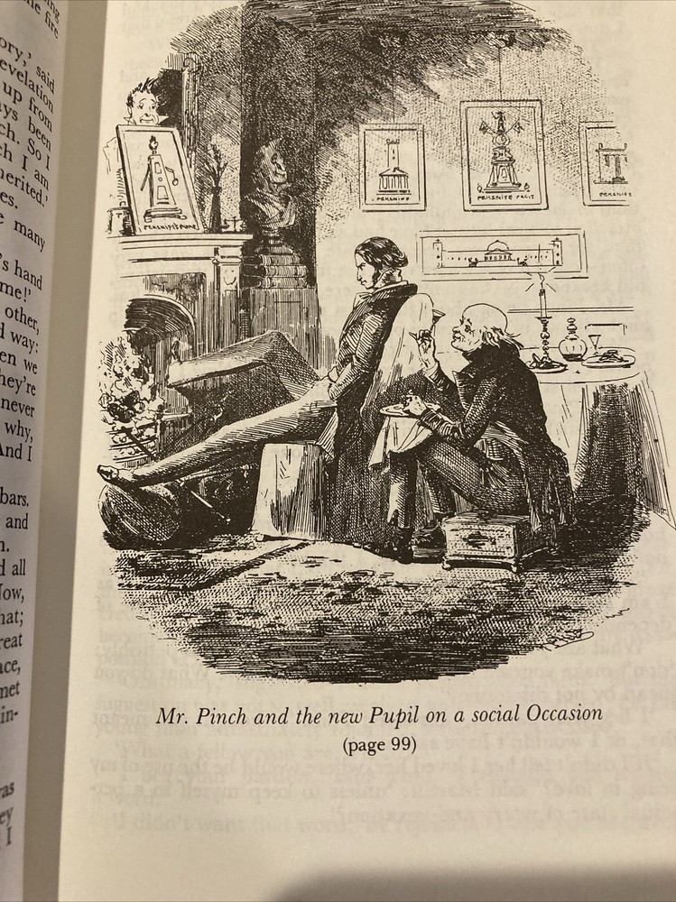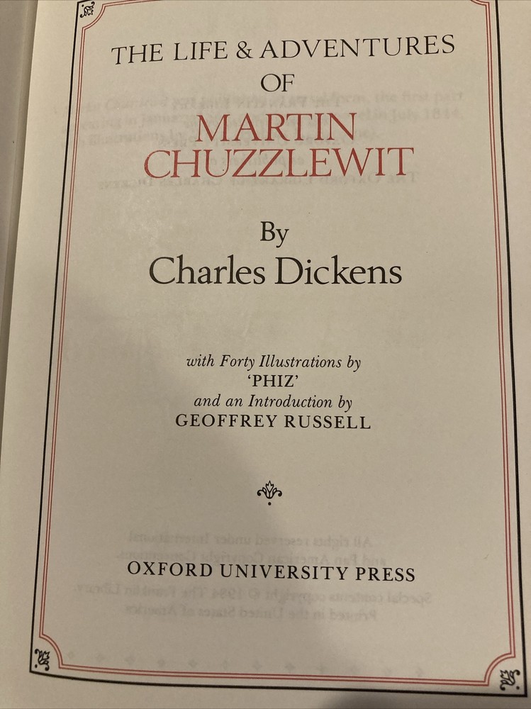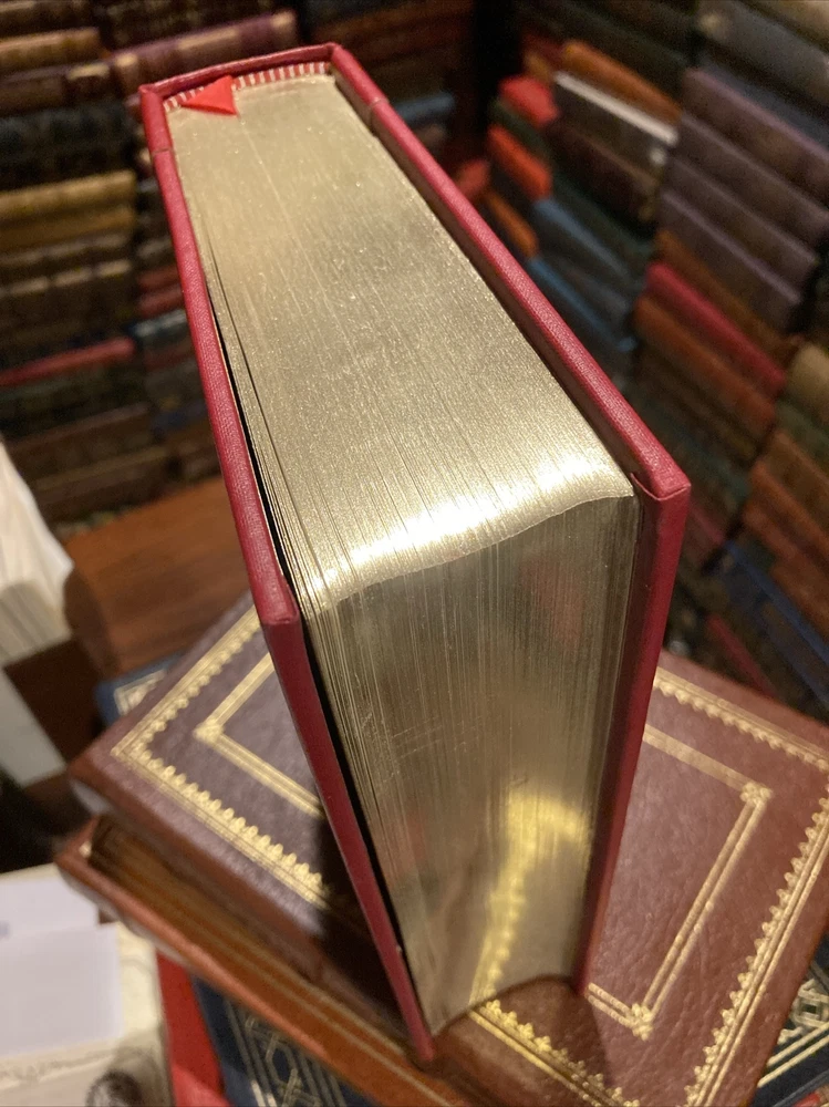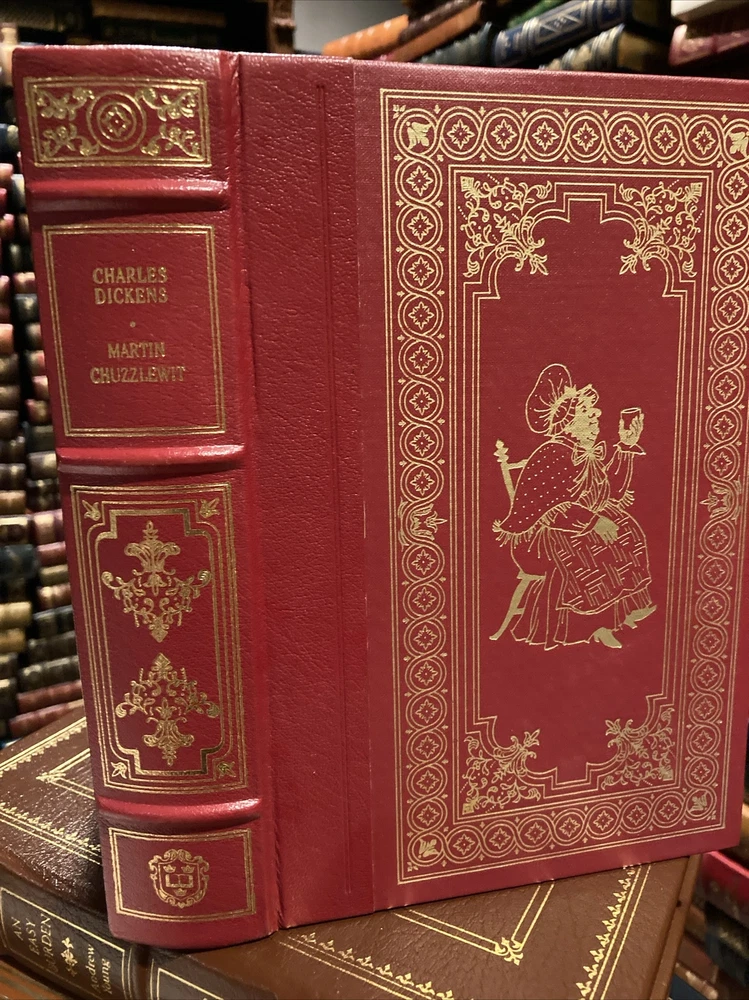 Franklin Library leather edition of Charles Dickens's "The Life and Adventures of Martin Chuzzlewit ," introduced by Geoffrey Russell, Illustrated with forty illustrations by Phiz, one of the OXFORD UNIVERSITY PRESS series, published in 1984. Bound in scarlet red leather spine, the book has marbled paper end leaves, satin book marker, hubbed spine, gold gilding on three edges---in near FINE condition---except for 'very minor' imperfection to gilt. Charles Dickens, who lived from 1812-1870, was born near PORTSMOUTH, England but his family moved to LONDON when he was two years old. "Martin Chuzzlewit" was originally serialized between 1842-44. Dickens told a friend that he thought it was his best work thus far. Characters in the novel gained fame, including Seth Pecksniff and Mrs. Gamp. Chuzzlwit was raised by his grandfather. Before Martin senior took the precaution of raising an orphaned girl, MARY GRAHAM, to be his companion and nursemaid, with the understanding that she will receive income from him only as long as Martin senior lives. Martin considers that this gives her a motive to keep him alive, in contrast to his relatives, who want to inherit his money. His grandson falls in love with Mary and wishes to marry her, conflicting with Old Martin's plans. Young Martin and his grandfather argue and Old Martin disinherits him. Martin becomes an apprentice, at the late age of 21, to SETH PECKSNIFF, a relative and greedy architect. Instead of teaching his students he lives off their tuition and has them doing draughting work that he passes off as his own. Pecksniff has two spoiled daughters, CHARITY and MERCY. Charles Dickens was first and foremost a social reformer. Pecksniif is set forth in satire unmatched in Dickens's work. Pecksniff is hated by every other character in the book except TOM PINCH. Tom and Ruth Pinch are good as Pecksniff is wicked. As Pecksniff is hateful, so Tom is loveable. Mrs. Gamp is perhaps the best of all Dickens's clowns. 882 pages. I offer combined shipping.