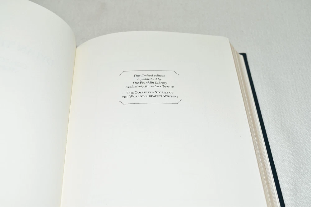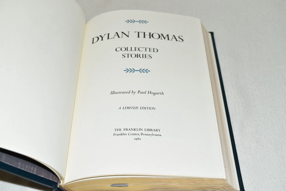 From the Franklin Library World's Greatest Writers Collection... Collected Stories by Dylan Thomas Illustrated by Paul Hogarth Copyright 1980 by The Franklin Library Premium Full Leather Binding This volume contains all of these classic Franklin Library trimmings: Premium Leather Binding Silk Moire Endleaves Distinctive Cover Design Hubbed Spine, Accented in Gold Satin Ribbon Page Marker Gilded Page Edges Long-lasting, High Quality Acid-neutral Paper Beautiful Illustrations A very scarce title in any condition, this 1980 edition is in Fine condition. The front and back covers are in terrific condition and the gilded page edges show hardly any wear (see pictures of all sides). There are no markings, bookplates, or other signs of prior ownership in this book. This World's Greatest Writers Edition was published by The Franklin Library and would be a beautiful addition to your Franklin Library book collection. Overall, this copy is a grade collector's book. This book is very elusive in this superior condition, as only a limited number of them were ever published, so now is the time to act. Hopefully you can add this book to your collection and enjoy it in the years to come... Please Email Me With Any Questions You Might Have! Shipping Info: Buyer to Pay Shipping and Handling International Bidders Pay Extra Shipping Seller Not Responsible For Uninsured Items Lost or Damaged in Mail Forms of Payment Accepted: Paypal Good luck and happy bidding! Powered by eBay Turbo Lister The free listing tool. List your items fast and easy and manage your active items.
