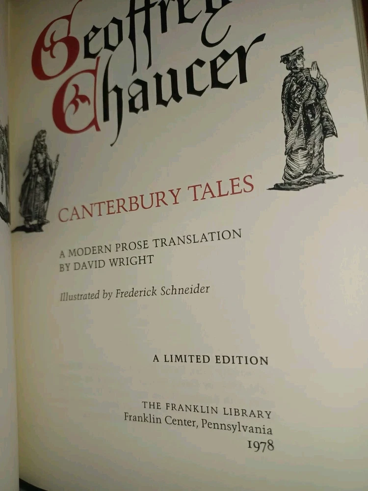 The product is a limited edition leather-bound version of Geoffrey Chaucer's "Canterbury Tales," published by Franklin Library in 1978. The book is specifically designed for collectors and enthusiasts of literature, as it is a special and unique edition that showcases the classic work in a high-quality format. The binding is made of leather, adding to the luxurious and prestigious feel of the book, making it a valuable addition to any collection of literary works.