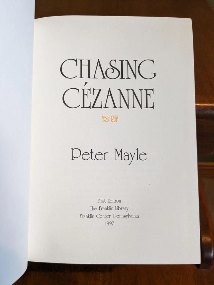 Chasing Cezanne first edition hand signed by author Peter Mayle. Published by Franklin Library in full leather with gold gilt page ends, marbled end pages and silk marker ribbon. Book is in excellent ...