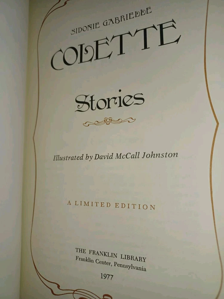 The product is a limited edition leather-bound book titled "Franklin Library Colette Stories 1977." It is a classic literature collection by author Sidone Gabrielle, published by Franklin Library in English. The book is part of the Classics series and is in pristine, new, unread condition, making it a valuable and collectible item for book enthusiasts.