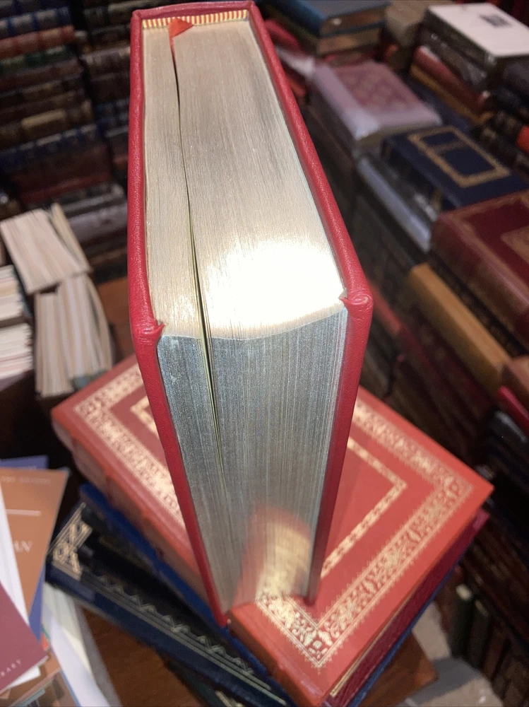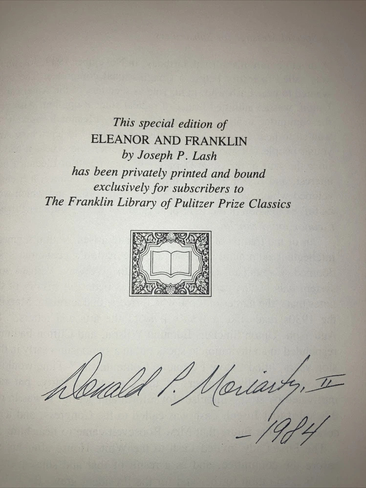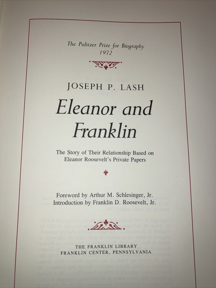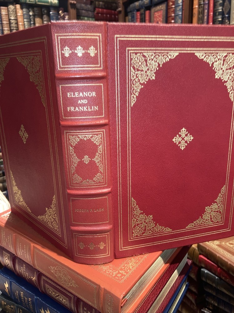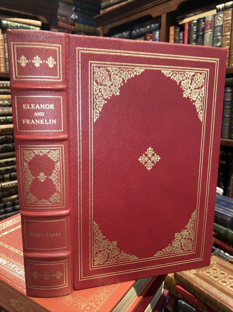 Franklin Library leather edition of Joseph Lash's "Eleanor and Franklin: The Story of their relationship based on Eleanor Roosevelt's Private Papers," Foreword by Arthur M. Schlesinger, Jr. Introduction by FRANKLIN D. ROOSEVELT, JR., a Limited edition, one of the PULITZER PRIZE CLASSICS series, published in 1984. Bound in red leather, the book has marbled paper end leaves, hubbed spine, acid-free paper, Symth-sewn binding, a satin book marker, gold gilding on three edges---in near FINE condition---except for previous owner's name and 1984 written neatly on the Pulitzer Prize Classics page. Anna Eleanor Roosevelt, who lived from 1884 – 1962, was an American politician, diplomat, and activist. She was the longest-serving First Lady of the U.S., having held the post from March 1933 to April 1945 during her husband President Franklin D. Roosevelt's four terms in office, and served as United States Delegate to the United Nationals General Assembly from 1945 to 1952. President Harry S. Truman later called her the "First Lady of the World" in tribute to her human rights achievements. Roosevelt was a member of the prominent American ROOSEVELT and LIVINGSTON families and a niece of President THEODORE ROOSEVELT. She had an unhappy childhood, having suffered the deaths of both parents and one of her brothers at a young age. At 15, she attended Allenwood Academy in London. Returning to the U.S., she married her fifth cousin once removed, Franklin Delano Roosevelt, in 1905. The Roosevelts' marriage was complicated from the beginning by Franklin's controlling mother, Sara , and after discovering an affair of her husband's with LUCY MERCER in 1918, she "closed the bedroom door" but agreed to stay married. She may have had affairs with a woman. Eleanor resolved to seek fulfillment in a public life of her own. She persuaded Franklin to stay in politics after he was stricken with debilitating polio in 1921, which cost him the use of his legs, and Roosevelt began giving speeches and appearing at campaign events in his place. Following Franklin's election as Governor of New York in 1928, and throughout the remainder of Franklin's public career in government, Roosevelt regularly made public appearances on his behalf, and as First Lady while her husband served as President, she significantly reshaped and redefined the role of that office during her own tenure and beyond, for future First Ladies. Though widely respected in her later years, Roosevelt was a controversial First Lady at the time for her outspokenness, particularly her stance on racial issues. She was the first presidential spouse to hold regular press conferences, write a daily newspaper column, write a monthly magazine column, host a weekly radio show, and speak at a national party convention. On a few occasions, she publicly disagreed with her husband's policies. She launched an experimental community at ARTHURDALE, WEST VIRGINIA , for the families of unemployed miners, later widely regarded as a failure. She advocated for expanded roles for women in the workplace, the civil rights of African Americans and Asian Americans, and the rights of World War II refugees. Following her husband's death, Roosevelt remained active in politics for the rest of her life. By the time of her death, Roosevelt was regarded as "one of the most esteemed women in the world"; she was called "the object of almost universal respect" in her New York Times obituary. In 1999, she was ranked ninth in the top ten of Gallup's List of the Most Widely Admired People of the 20th Century. 765 pages, including an index. I offer Combined shipping.