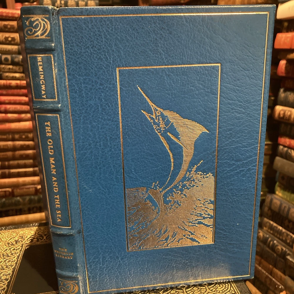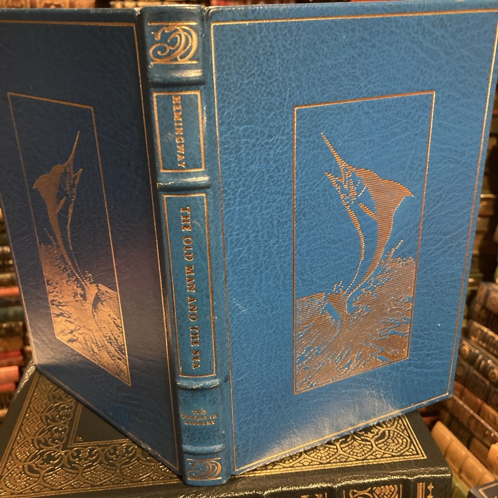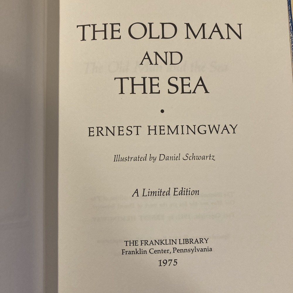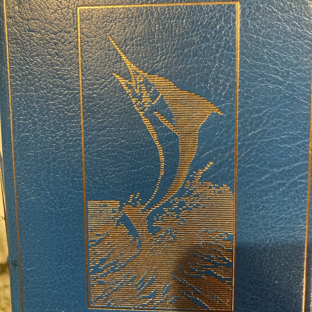 Franklin Library leather edition of Ernest Hemingway's "The Old Man and the Sea," a Limited edition, Portrait of Ernest Heminway by his friend, WALDO PIERCE, printed with permission from MARY HEMINGWAY, Illustrated by Daniel Schwartz, one of the PULITZER PRIZE series, published in 1975. Bound in royal blue leather, the book has marbled paper end leaves, acid-free paper, Symth-sewn binding, a satin book marker, hubbed spine, gold gilding on three edges---in ner FINE condition. Ernest Hemingway, who lived from 1899-1961, was married four times; the second wife's family lived in PIGGOTT, ARKANSAS. He grew up in Oak Forrest, Illinois, the son of a medical doctor and a musical mother. As an adult, he was an ambulance drive in WW I and later lived in Paris, Kansas City, Key West, Florida, CUBA, Idaho, and Arkansas and he traveled all over the world. "The Old Man and the Sea," a short novel written in 1951 in Bimini, Bahamas, and published in 1952, was the last major work of fiction by Hemingway that was published during his lifetime. One of his most famous works, the novel tells the story of an aging, experienced fisherman, Santiago, and a large marlin. Santiago has gone 84 days without catching a fish. He is so unlucky that his young apprentice, Manolin, has been forbidden by his parents to sail with him and has been told instead to fish with successful fishermen. The boy visits Santiago's shack each night, hauling his fishing gear, preparing food, talking about American baseball and his favorite player, JOE DIMAGGIO. Santiago tells Manolin that on the next day, he will venture far out into the Gulf Stream, north of Cuba in the Straits of Florida to fish, confident that his unlucky streak is near its end. On the eighty-fifth day of his unlucky streak, Santiago takes his skiff into the Gulf Stream, sets his lines and, by noon, has his bait taken by a big fish that he is sure is a marlin. Unable to haul in the great marlin, Santiago is instead pulled by the marlin, and two days and nights pass with Santiago holding onto the line. Though wounded by the struggle and in pain, Santiago expresses a compassionate appreciation for his adversary, often referring to him as a brother. He also determines that, because of the fish's great dignity, no one shall deserve to eat the marlin. On the third day, the fish begins to circle the skiff. Santiago, worn out and almost delirious, uses all his remaining strength to pull the fish onto its side and stab the marlin with a harpoon. Santiago straps the marlin to the side of his skiff and heads home, thinking about the high price the fish will bring him at the market and how many people he will feed. On his way in to shore, sharks are attracted to the marlin's blood. Santiago kills a great mako shark with his harpoon, but he loses the weapon. He makes a new harpoon by strapping his knife to the end of an oar to help ward off the next line of sharks; five sharks are slain and many others are driven away. But the sharks keep coming, and by nightfall the sharks have almost devoured the marlin's entire carcass, leaving a skeleton consisting mostly of its backbone, its tail and its head. Santiago knows that he is entirely unlucky now, and defeated now, but not when he caught the marlin, tells the sharks of how they have killed his dreams. Upon reaching the shore before dawn on the next day, Santiago struggles to his shack, carrying the heavy mast on his shoulder, leaving the fish head and the bones on the shore. Once home, he slumps onto his bed and falls into a deep sleep. and at his injured hands. Manolin brings him newspapers and coffee. When the old man wakes, they promise to fish together once again. Upon his return to sleep, Santiago dreams of his youth — of lions on an African beach. The novel was awarded the Pulitzer Prize in 1953 and the Nobel Prize in Literature in 1954. 125 pages---a GORGEOUS book! I offer Combined shipping.