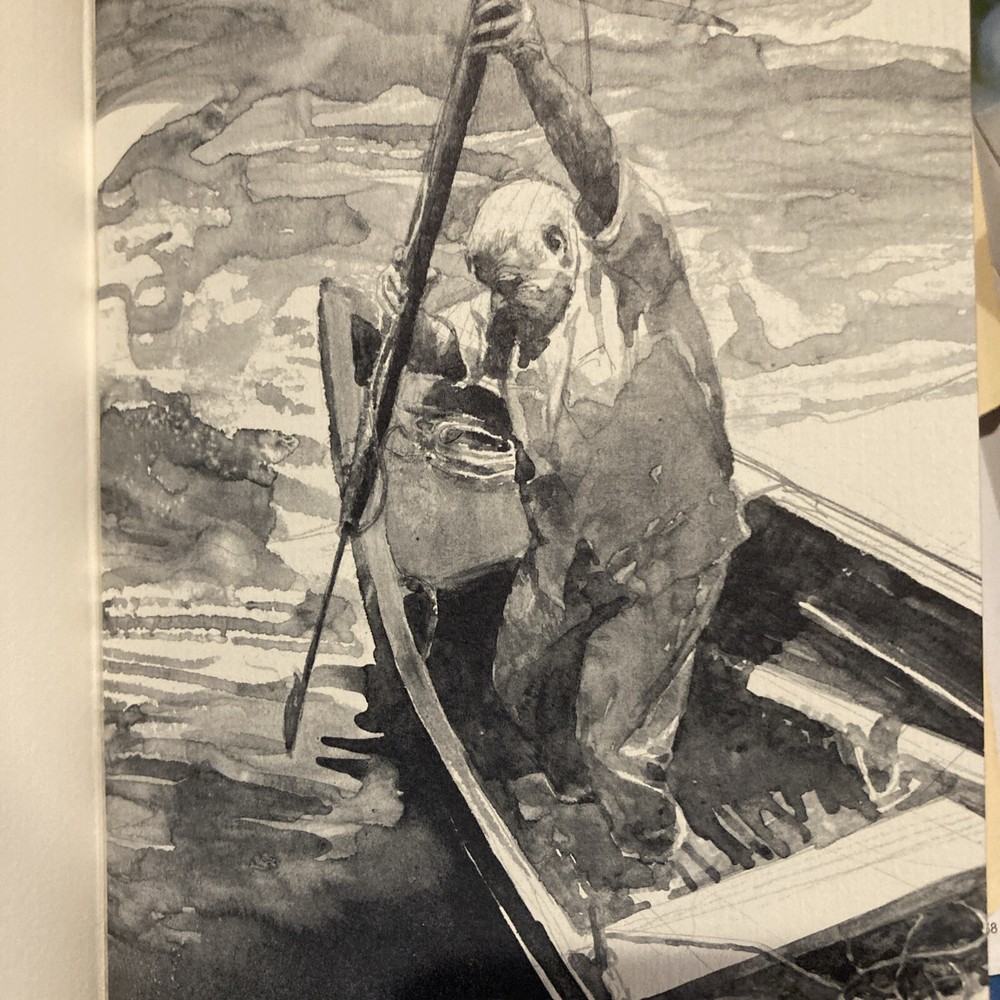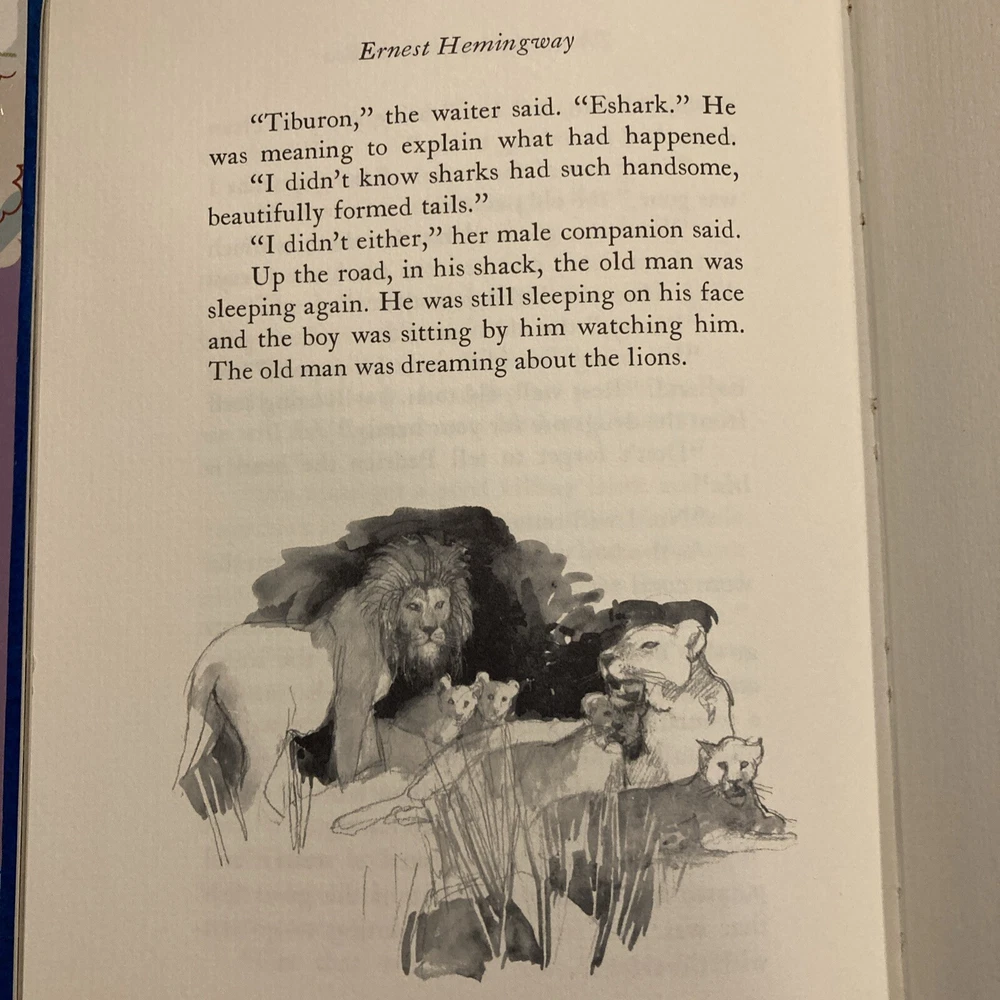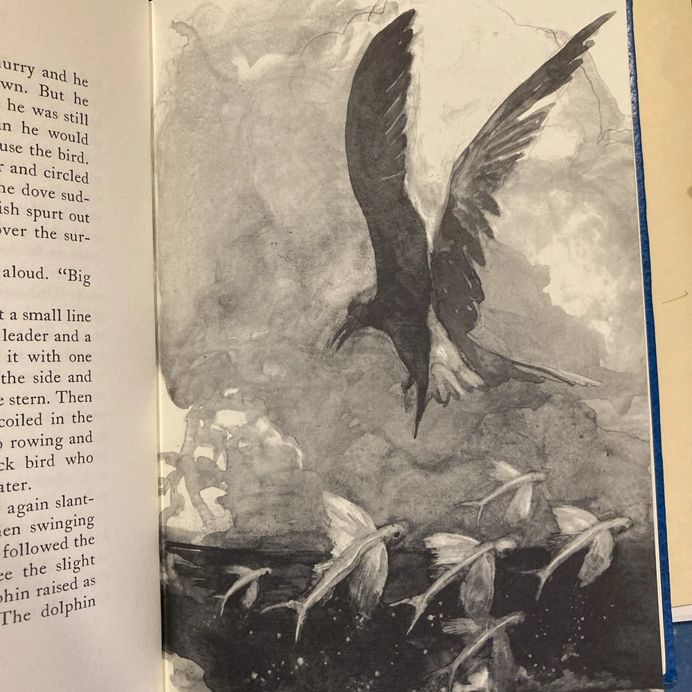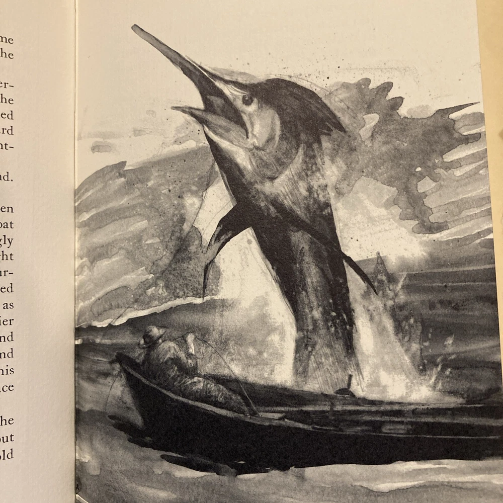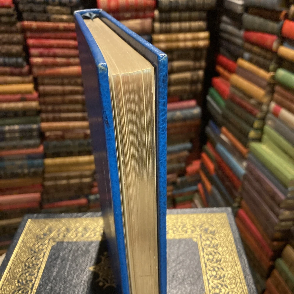 Franklin Library leather edition of Ernest Hemingway's "The Old Man and the Sea," a Limited edition, Portrait of Ernest Heminway by his friend, WALDO PIERCE, printed with permission from MARY HEMINGWAY, Illustrated by Daniel Schwartz, one of the PULITZER PRIZE series, published in 1975. Bound in royal blue leather, the book has marbled paper end leaves, acid-free paper, Symth-sewn binding, a satin book marker, hubbed spine, gold gilding on three edges---in ner FINE condition. Ernest Hemingway, who lived from 1899-1961, was married four times; the second wife's family lived in PIGGOTT, ARKANSAS. He grew up in Oak Forrest, Illinois, the son of a medical doctor and a musical mother. As an adult, he was an ambulance drive in WW I and later lived in Paris, Kansas City, Key West, Florida, CUBA, Idaho, and Arkansas and he traveled all over the world. "The Old Man and the Sea," a short novel written in 1951 in Bimini, Bahamas, and published in 1952, was the last major work of fiction by Hemingway that was published during his lifetime. One of his most famous works, the novel tells the story of an aging, experienced fisherman, Santiago, and a large marlin. Santiago has gone 84 days without catching a fish. He is so unlucky that his young apprentice, Manolin, has been forbidden by his parents to sail with him and has been told instead to fish with successful fishermen. The boy visits Santiago's shack each night, hauling his fishing gear, preparing food, talking about American baseball and his favorite player, JOE DIMAGGIO. Santiago tells Manolin that on the next day, he will venture far out into the Gulf Stream, north of Cuba in the Straits of Florida to fish, confident that his unlucky streak is near its end. On the eighty-fifth day of his unlucky streak, Santiago takes his skiff into the Gulf Stream, sets his lines and, by noon, has his bait taken by a big fish that he is sure is a marlin. Unable to haul in the great marlin, Santiago is instead pulled by the marlin, and two days and nights pass with Santiago holding onto the line. Though wounded by the struggle and in pain, Santiago expresses a compassionate appreciation for his adversary, often referring to him as a brother. He also determines that, because of the fish's great dignity, no one shall deserve to eat the marlin. On the third day, the fish begins to circle the skiff. Santiago, worn out and almost delirious, uses all his remaining strength to pull the fish onto its side and stab the marlin with a harpoon. Santiago straps the marlin to the side of his skiff and heads home, thinking about the high price the fish will bring him at the market and how many people he will feed. On his way in to shore, sharks are attracted to the marlin's blood. Santiago kills a great mako shark with his harpoon, but he loses the weapon. He makes a new harpoon by strapping his knife to the end of an oar to help ward off the next line of sharks; five sharks are slain and many others are driven away. But the sharks keep coming, and by nightfall the sharks have almost devoured the marlin's entire carcass, leaving a skeleton consisting mostly of its backbone, its tail and its head. Santiago knows that he is entirely unlucky now, and defeated now, but not when he caught the marlin, tells the sharks of how they have killed his dreams. Upon reaching the shore before dawn on the next day, Santiago struggles to his shack, carrying the heavy mast on his shoulder, leaving the fish head and the bones on the shore. Once home, he slumps onto his bed and falls into a deep sleep. and at his injured hands. Manolin brings him newspapers and coffee. When the old man wakes, they promise to fish together once again. Upon his return to sleep, Santiago dreams of his youth — of lions on an African beach. The novel was awarded the Pulitzer Prize in 1953 and the Nobel Prize in Literature in 1954. 125 pages---a GORGEOUS book! I offer Combined shipping.